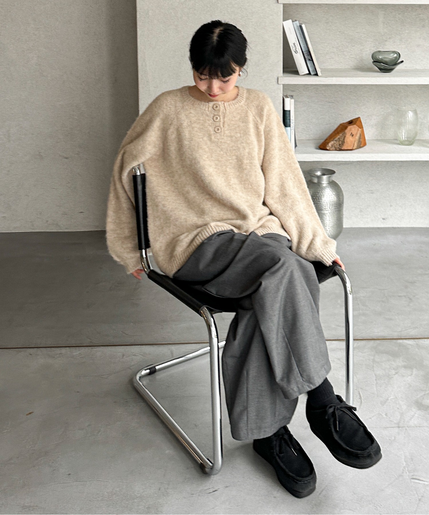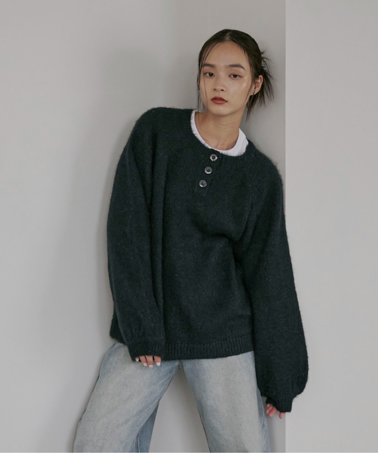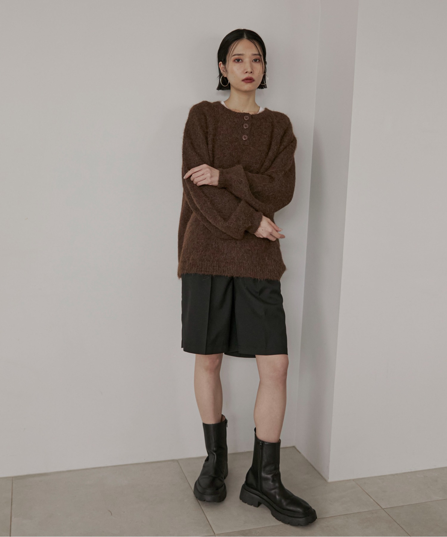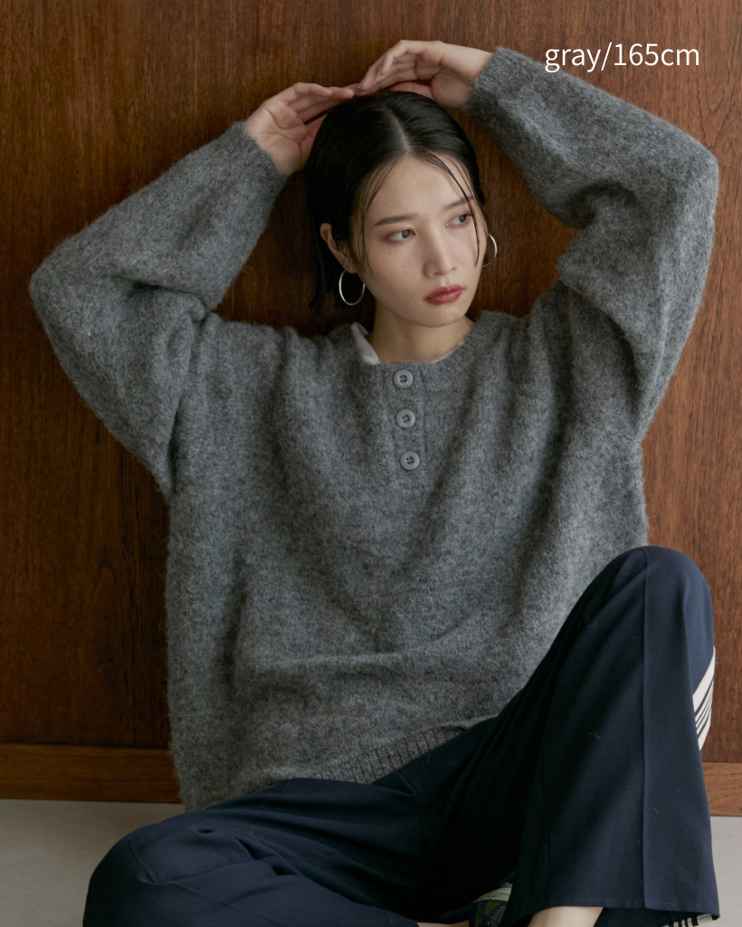 【ハンドウォッシャブル】ウール混起毛ヘンリーニット