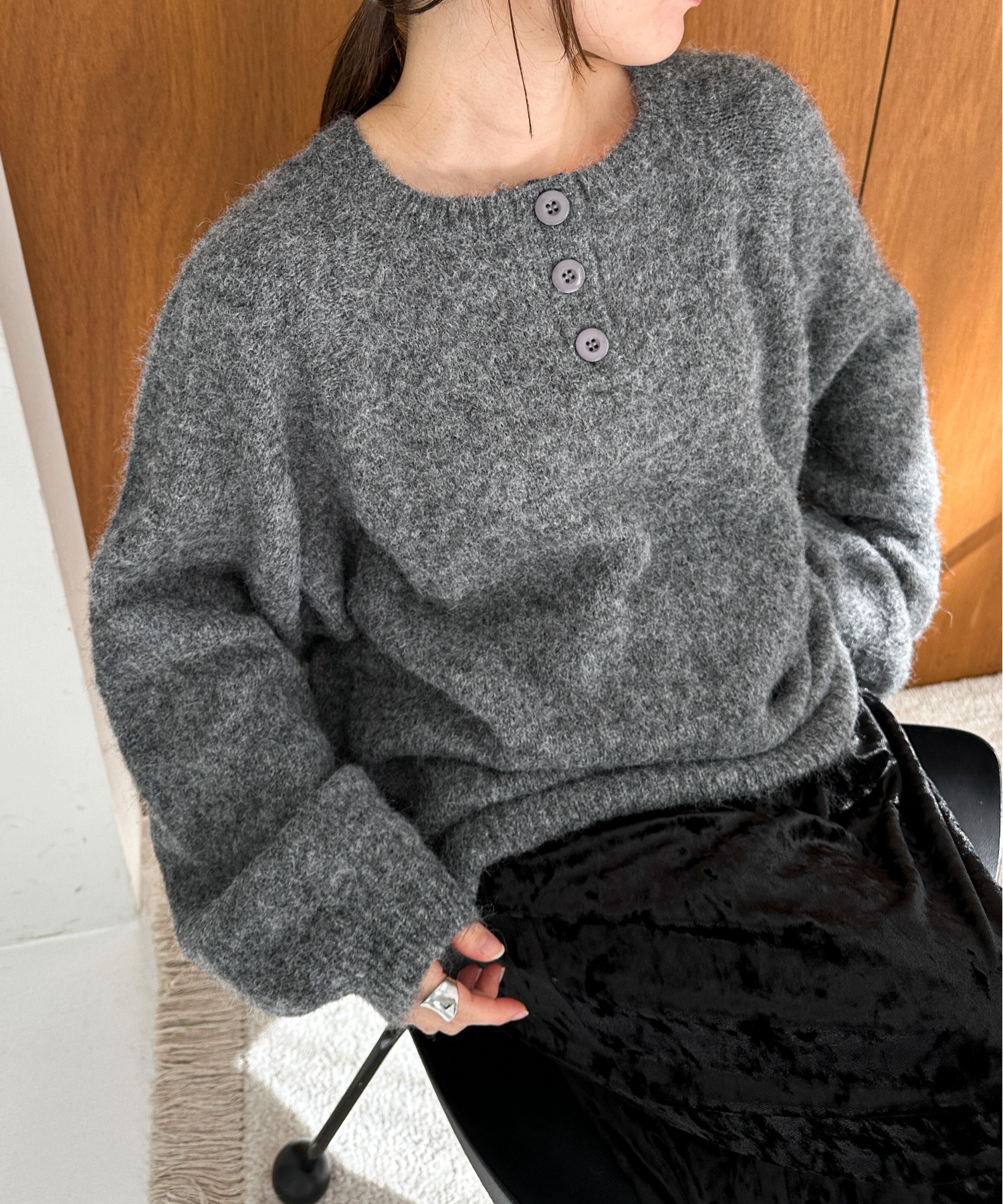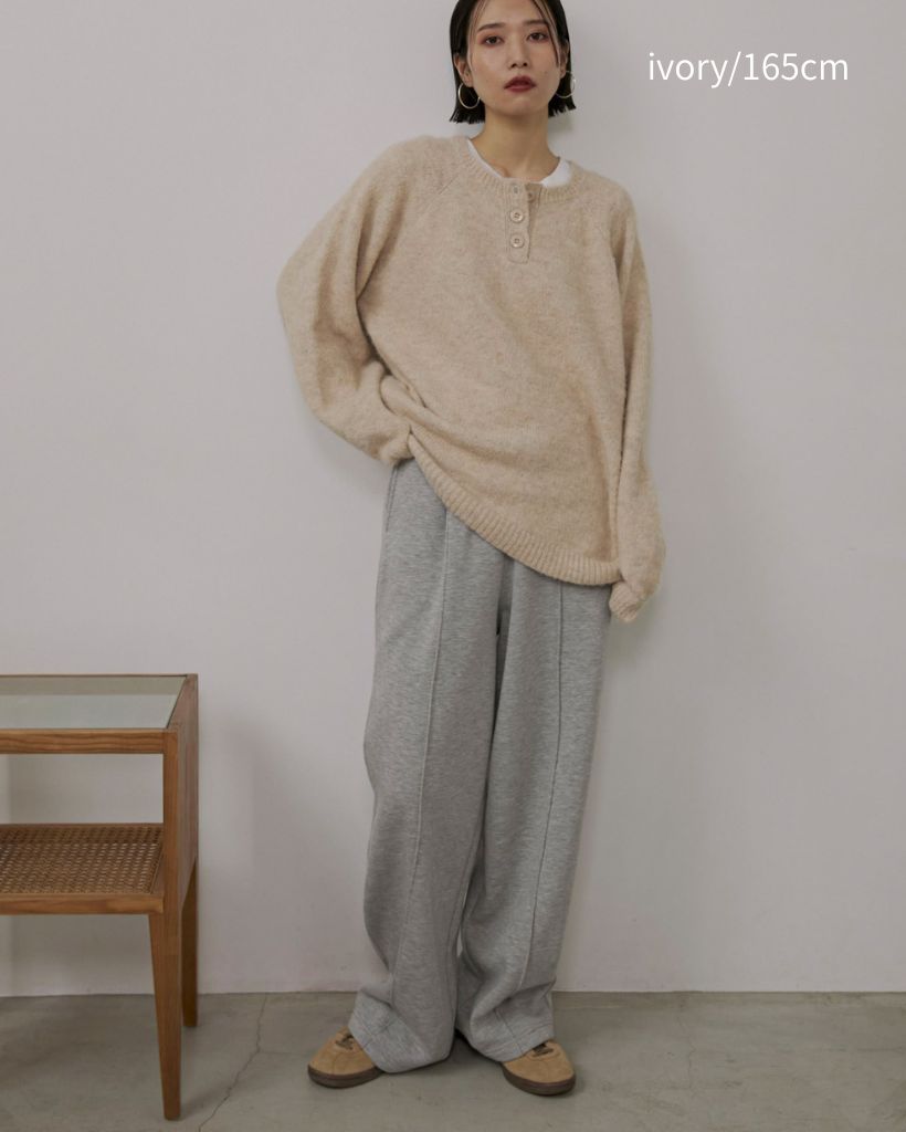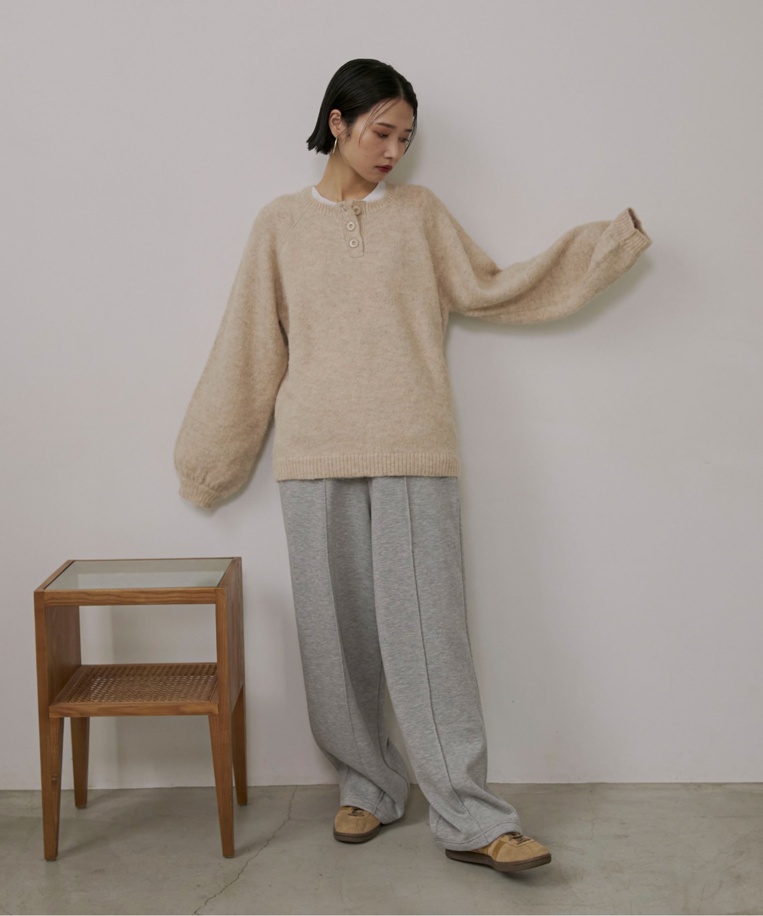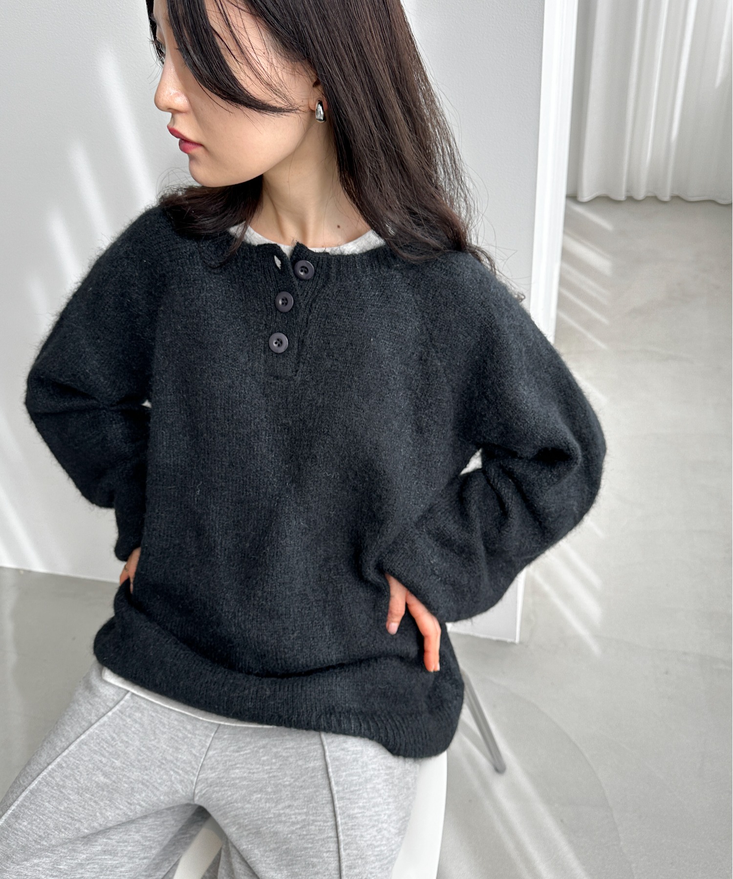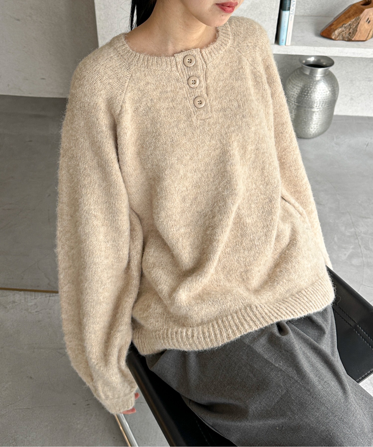 【ハンドウォッシャブル】ウール混起毛ヘンリーニット