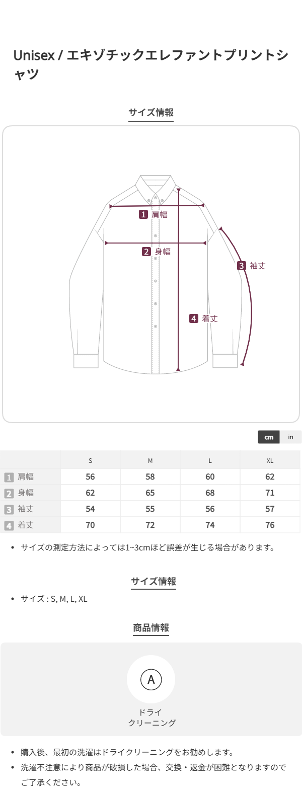 着丈 S:70cm M:72cm L:74cm XL:76cm バスト
