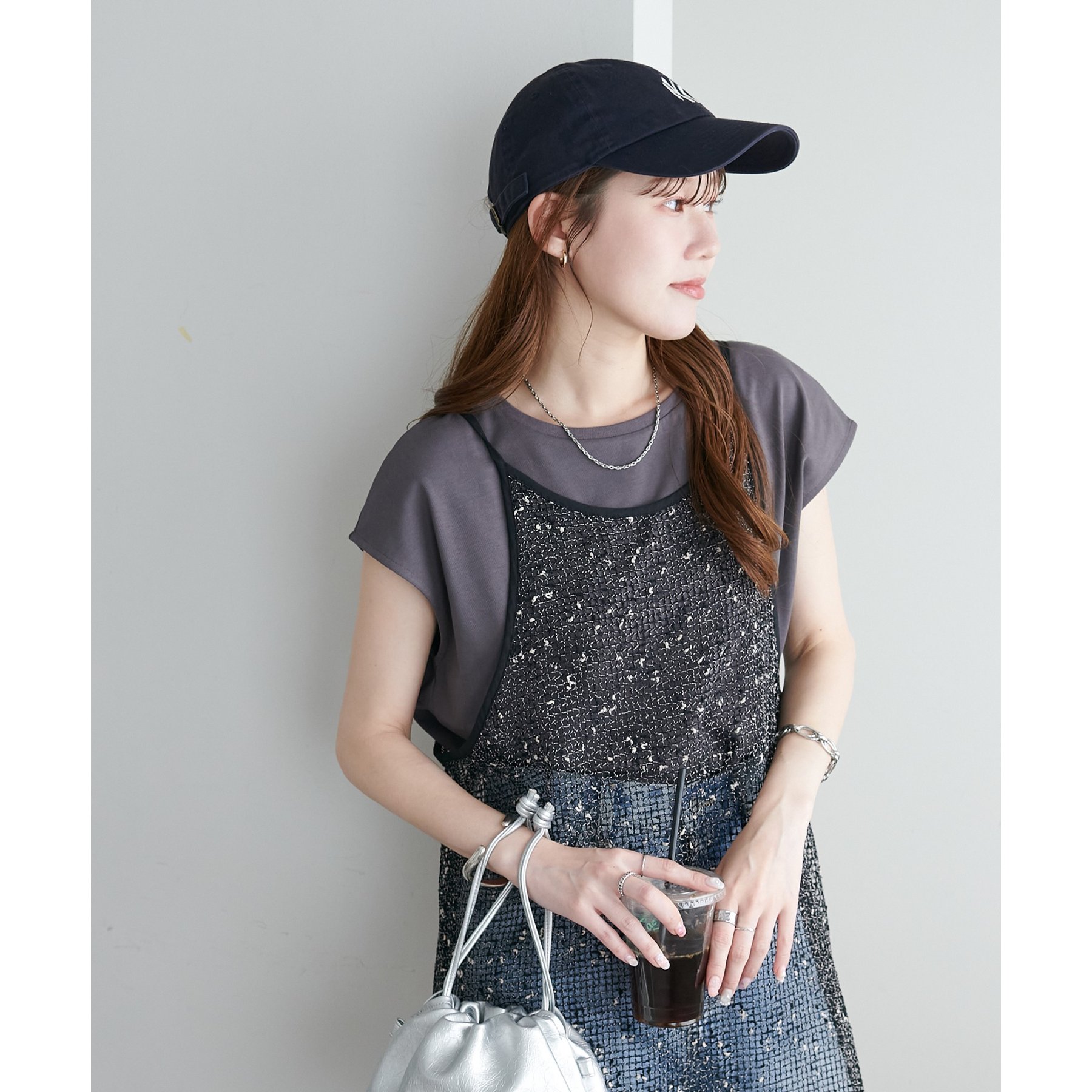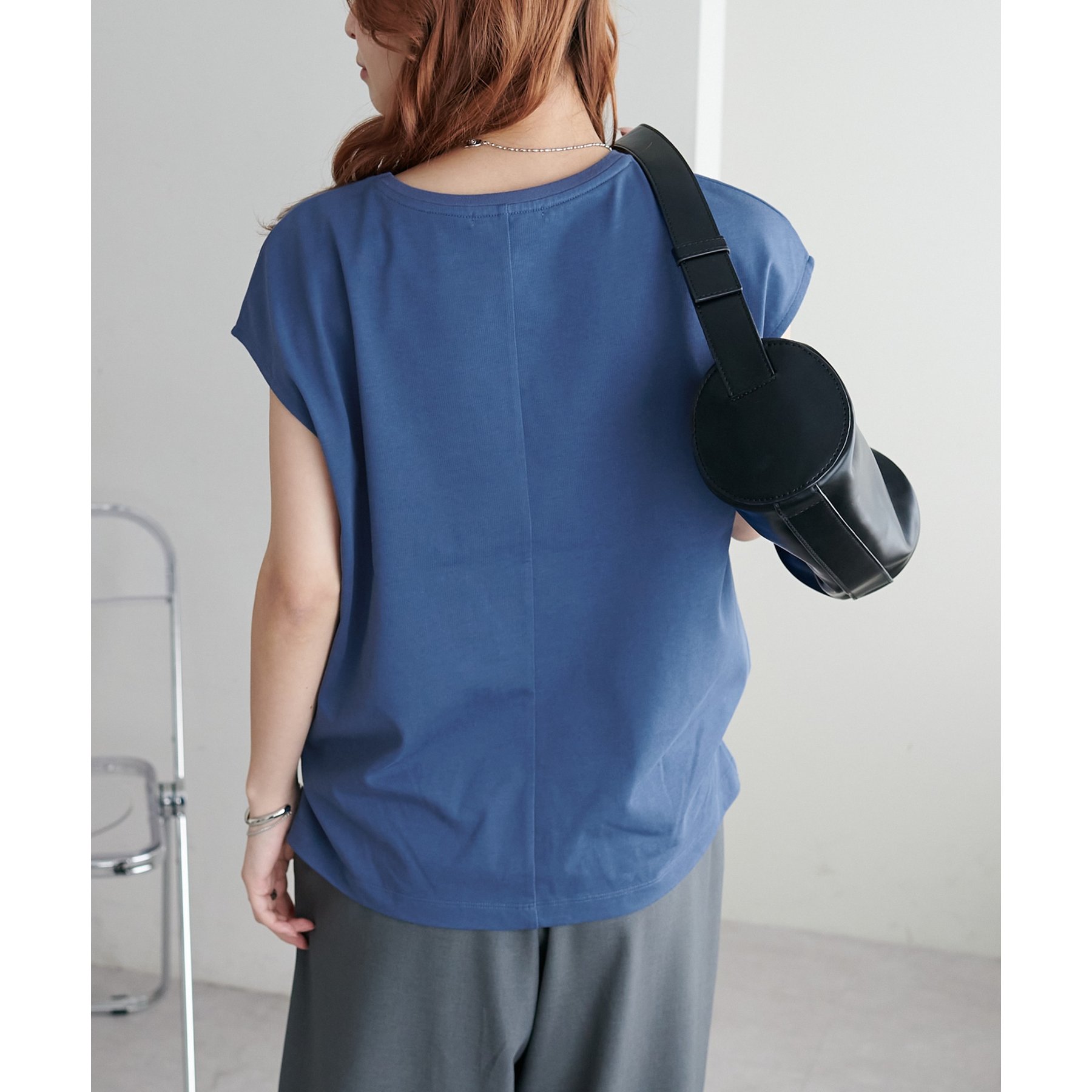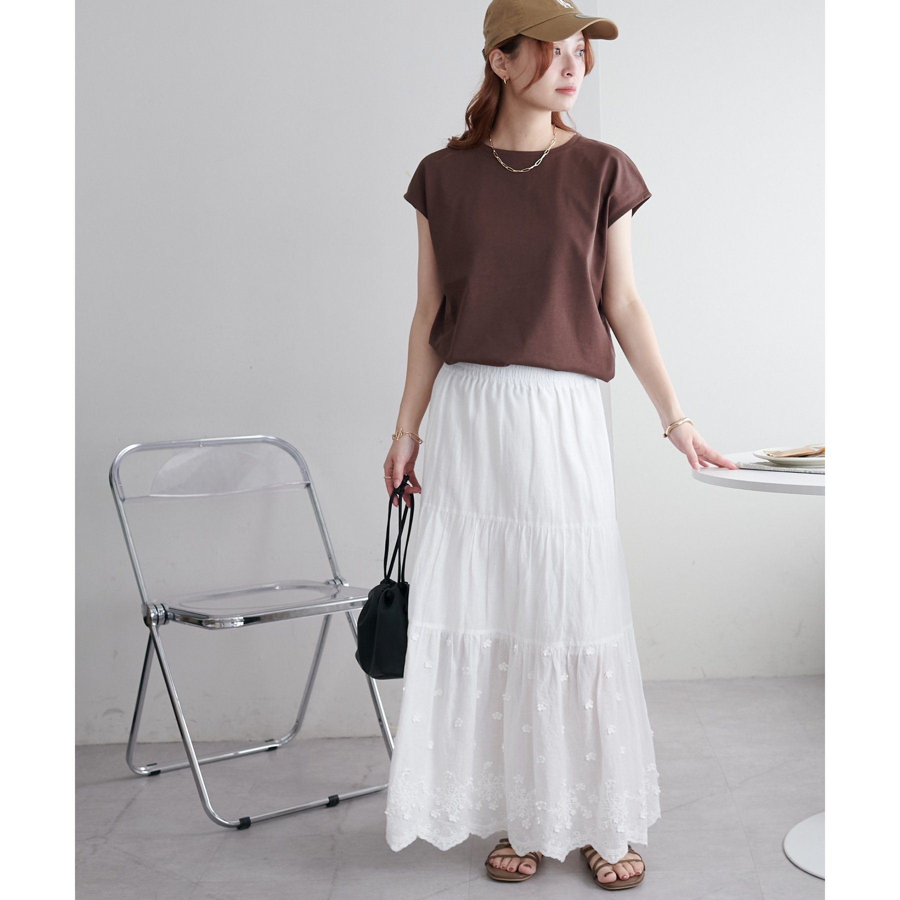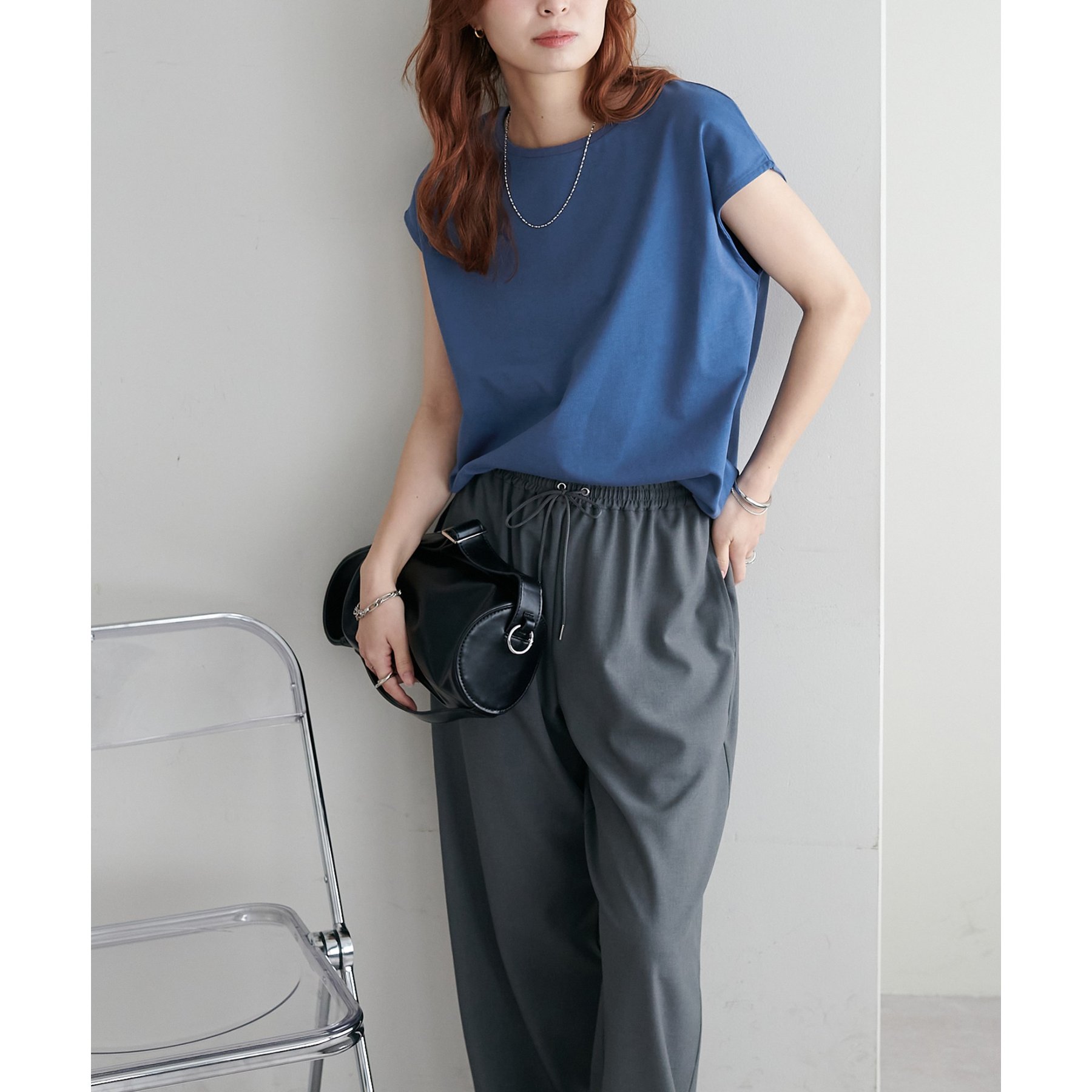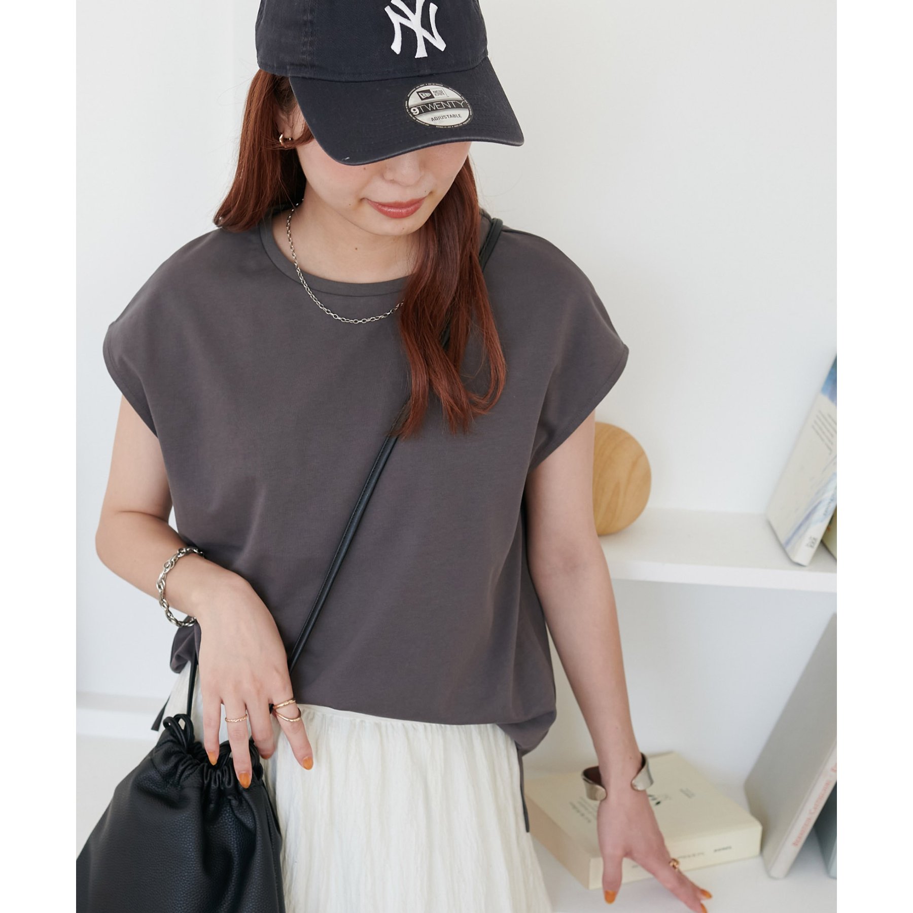 シンプルなトップスなので、デザインのあるアイテムとも合わせやすいです!