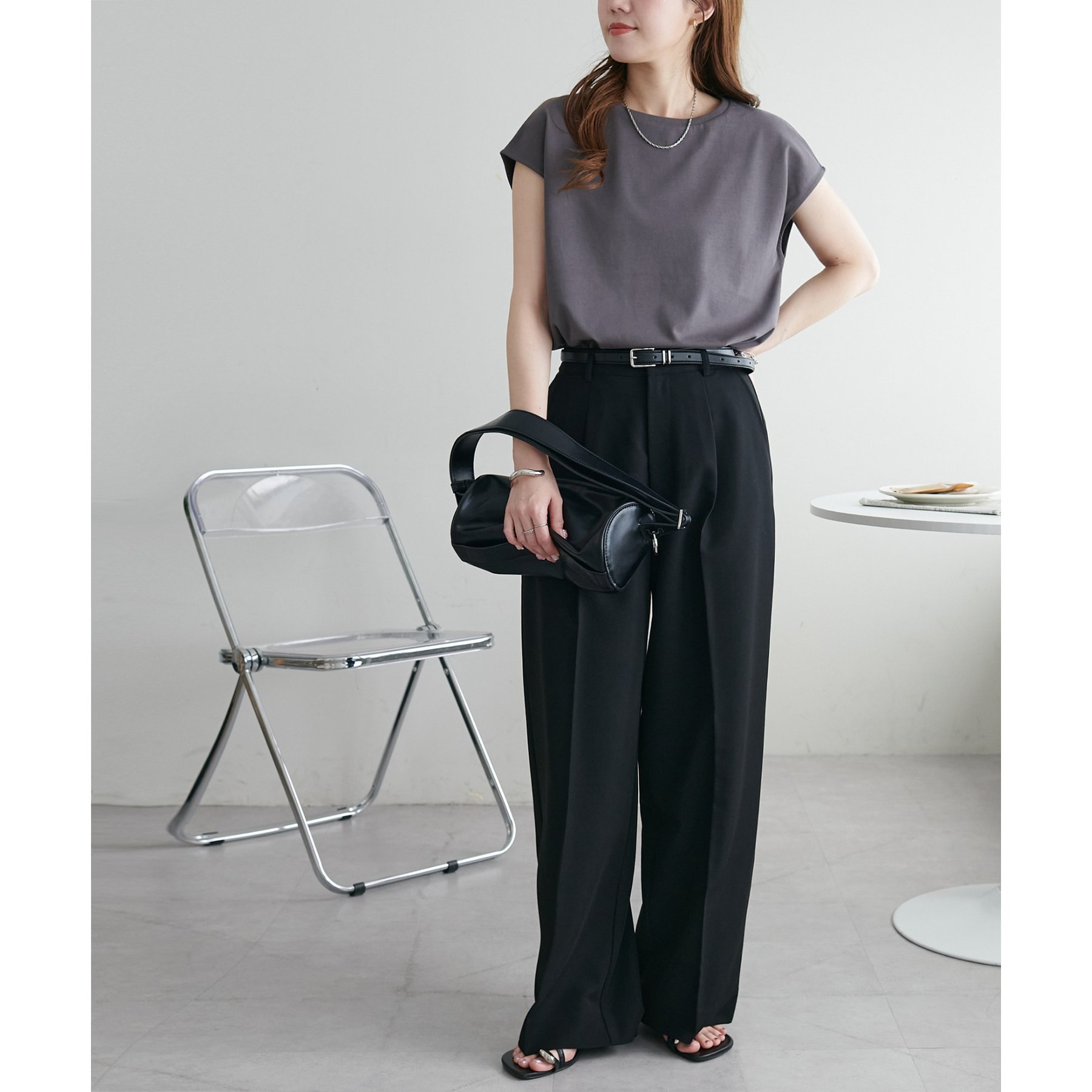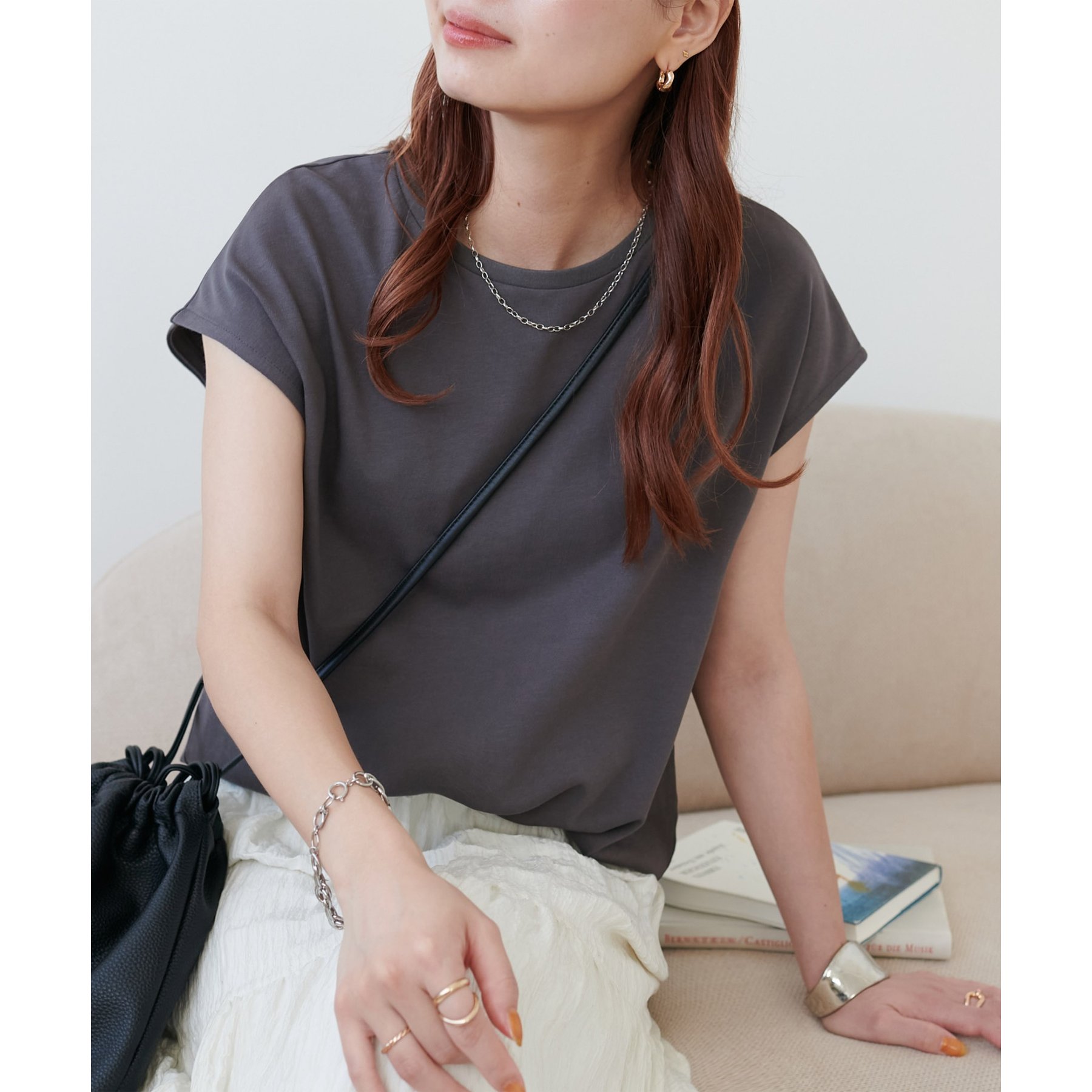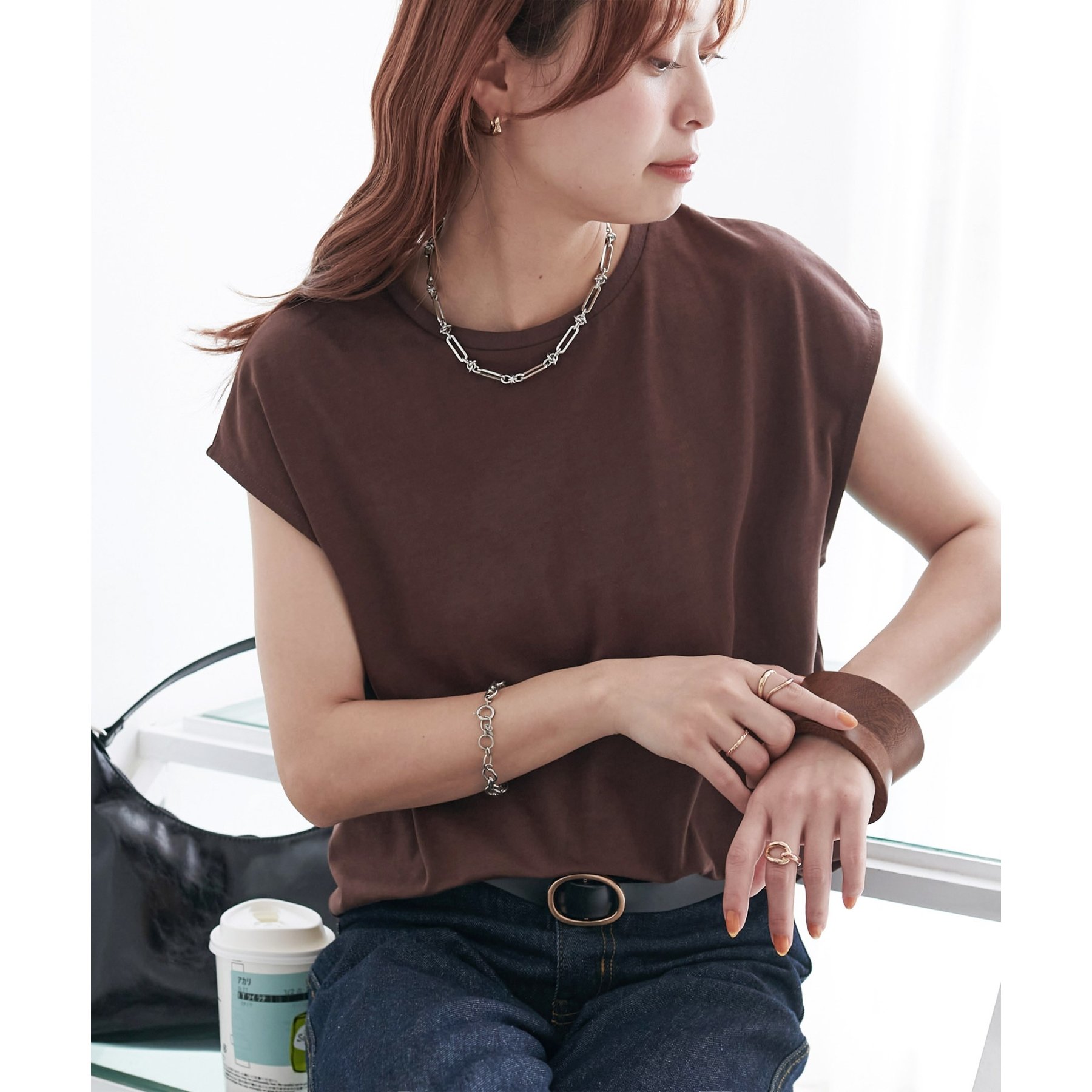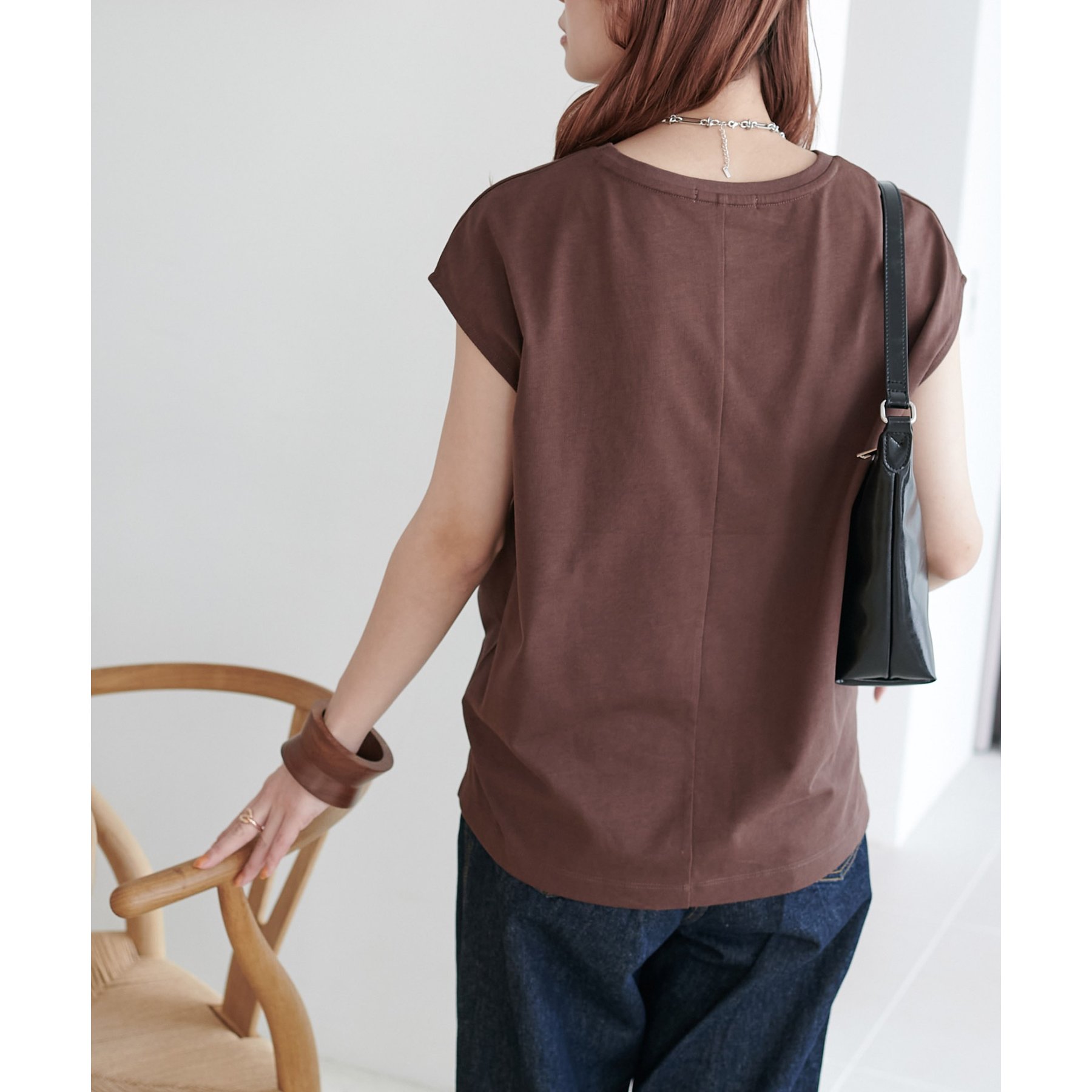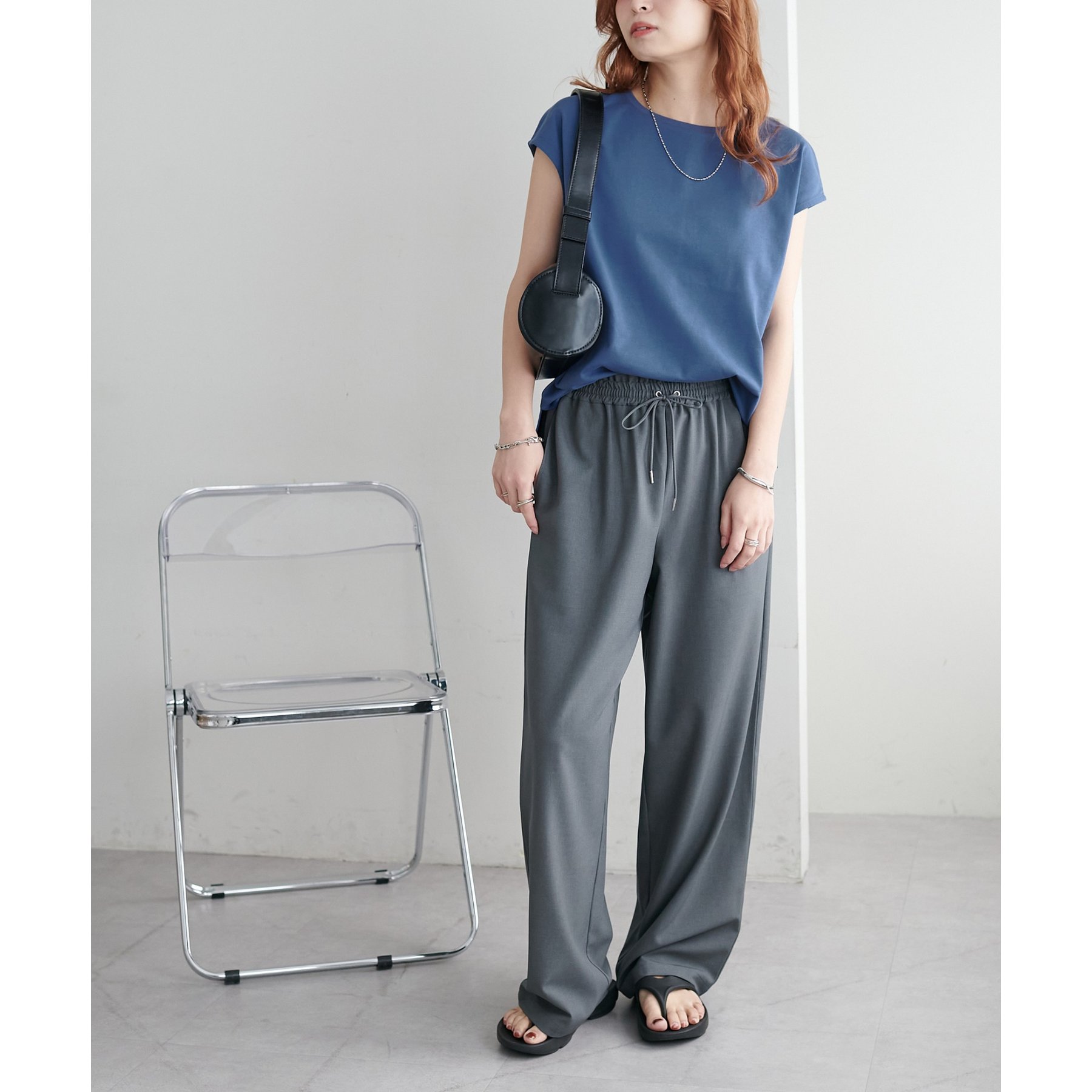 シンプルなトップスなので、デザインのあるアイテムとも合わせやすいです!