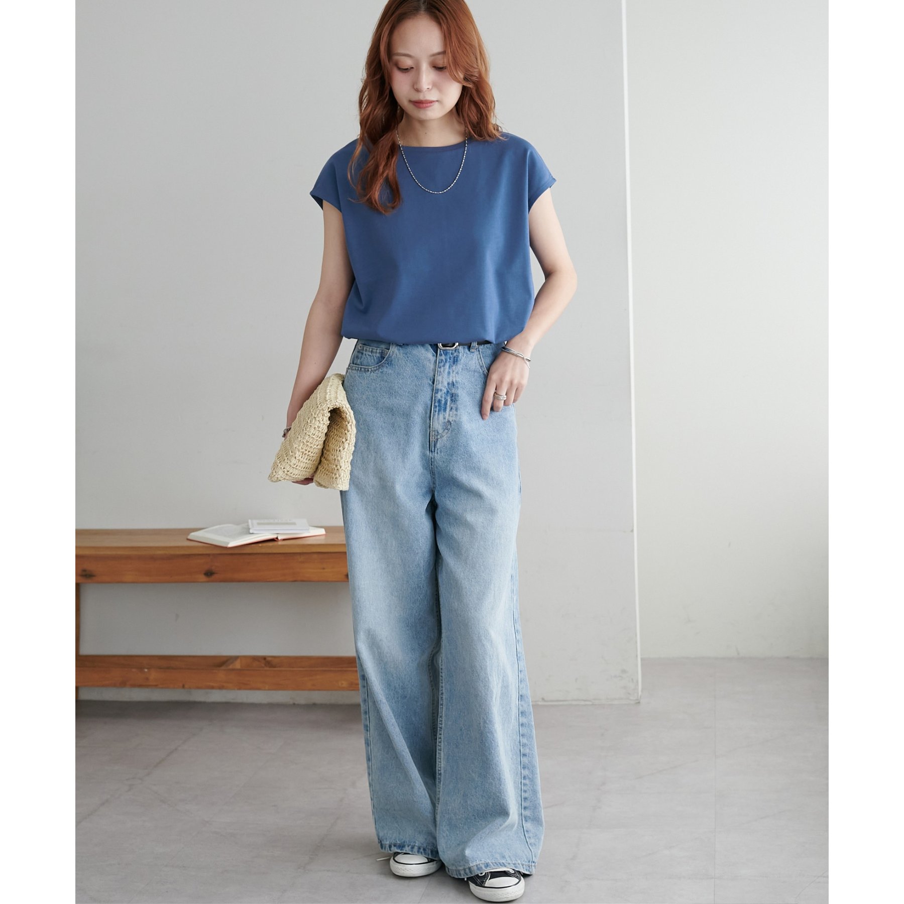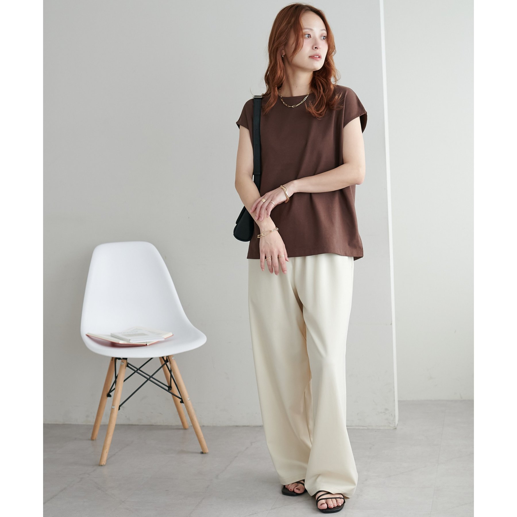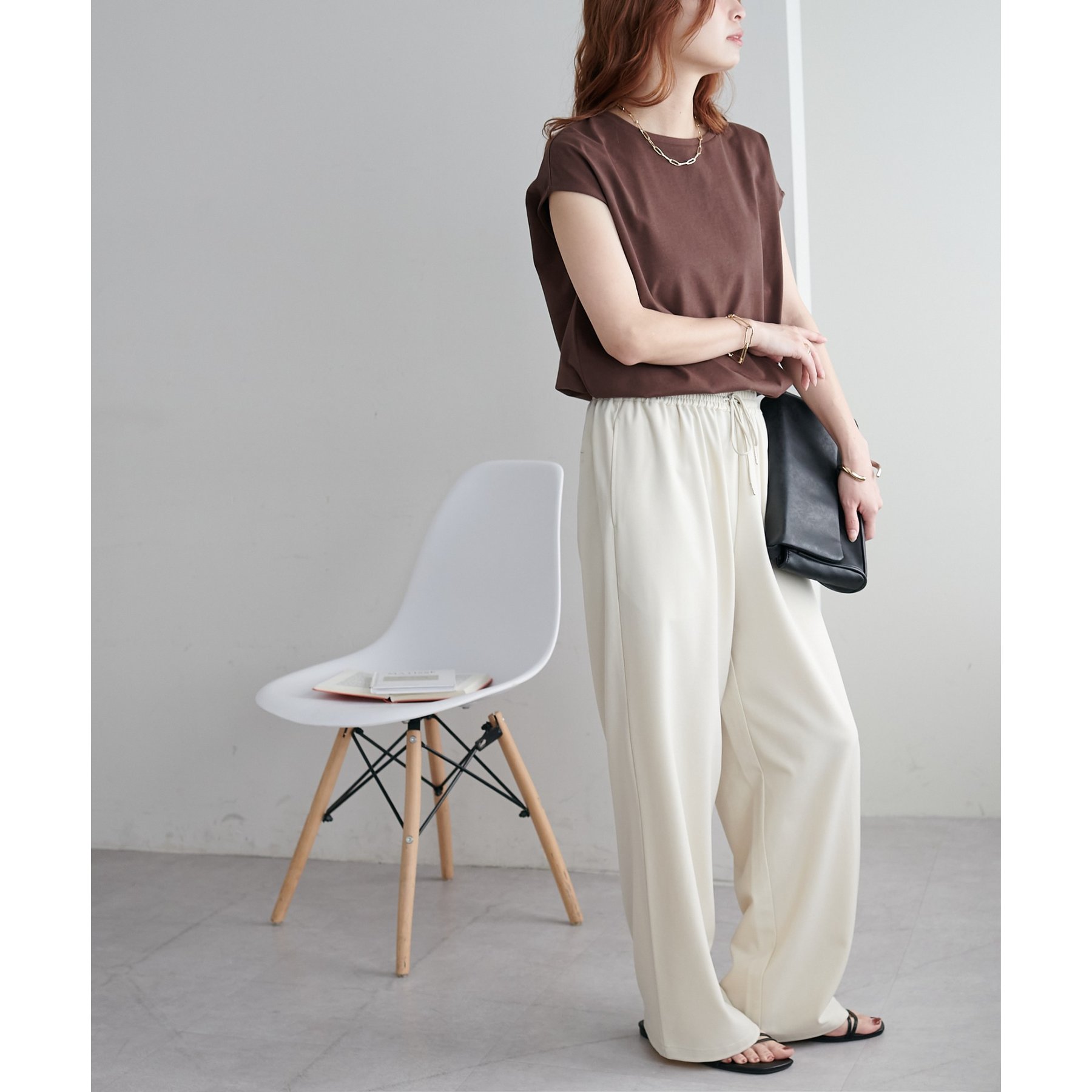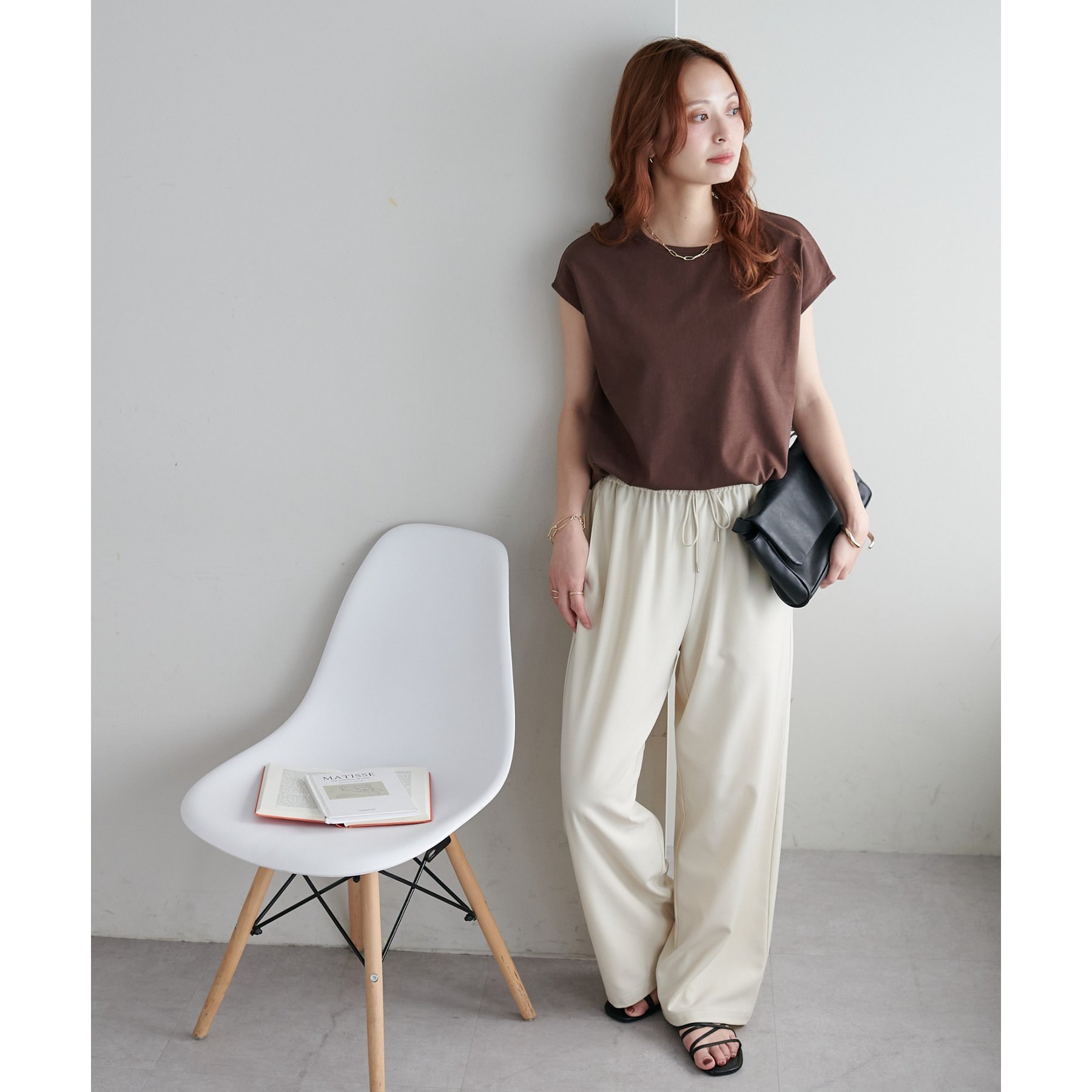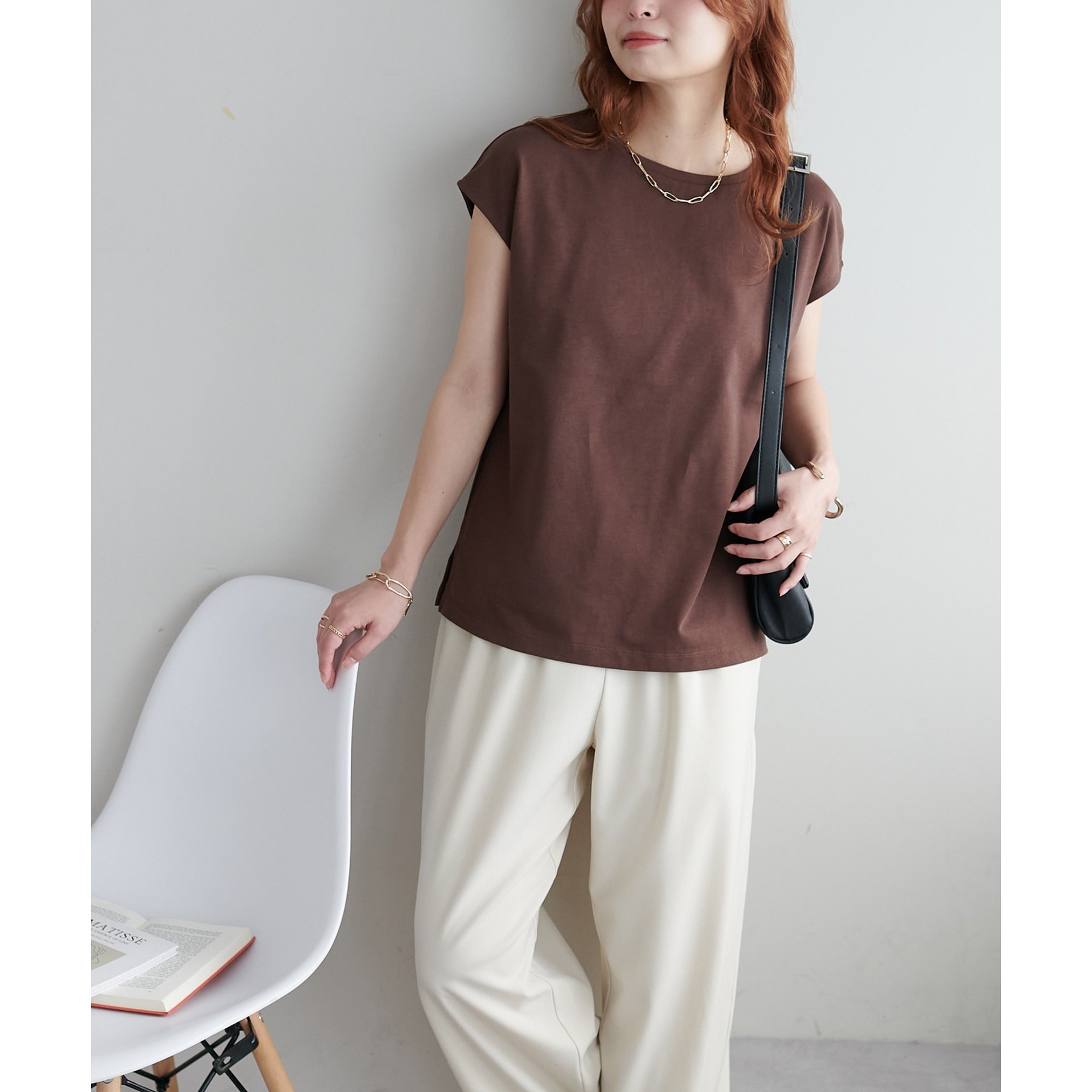 シンプルなトップスなので、デザインのあるアイテムとも合わせやすいです!