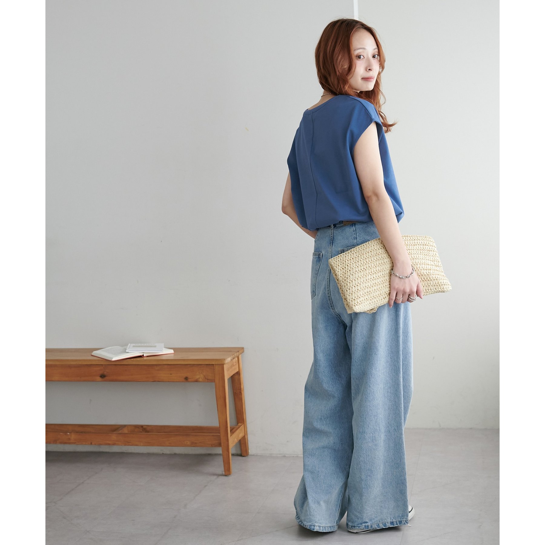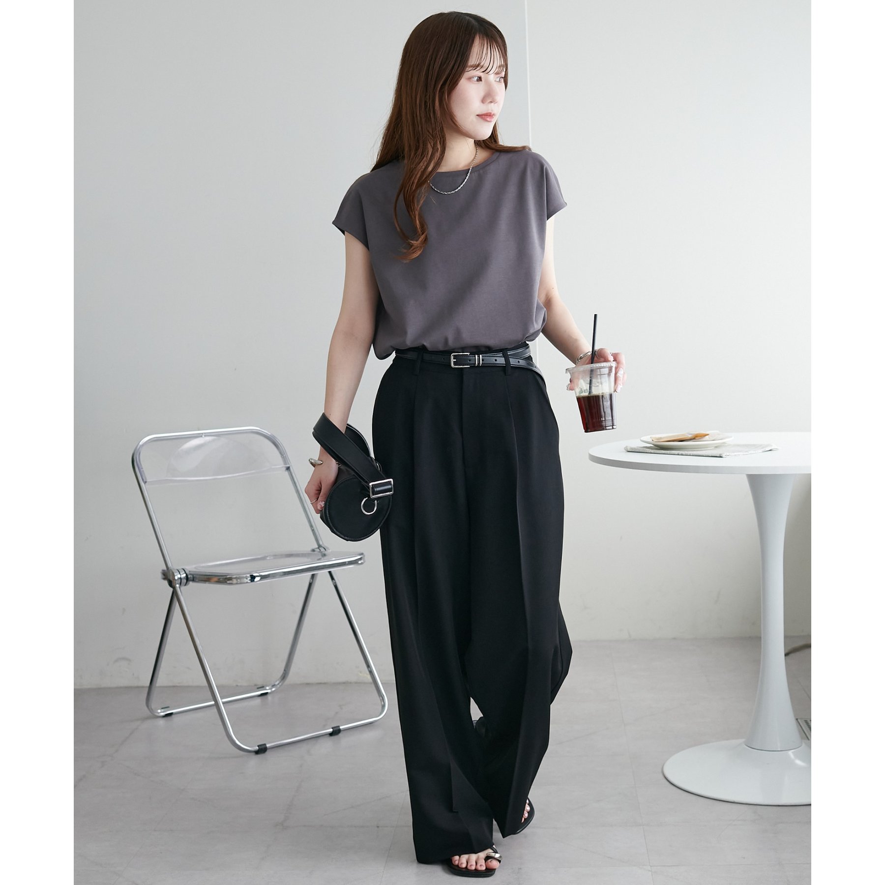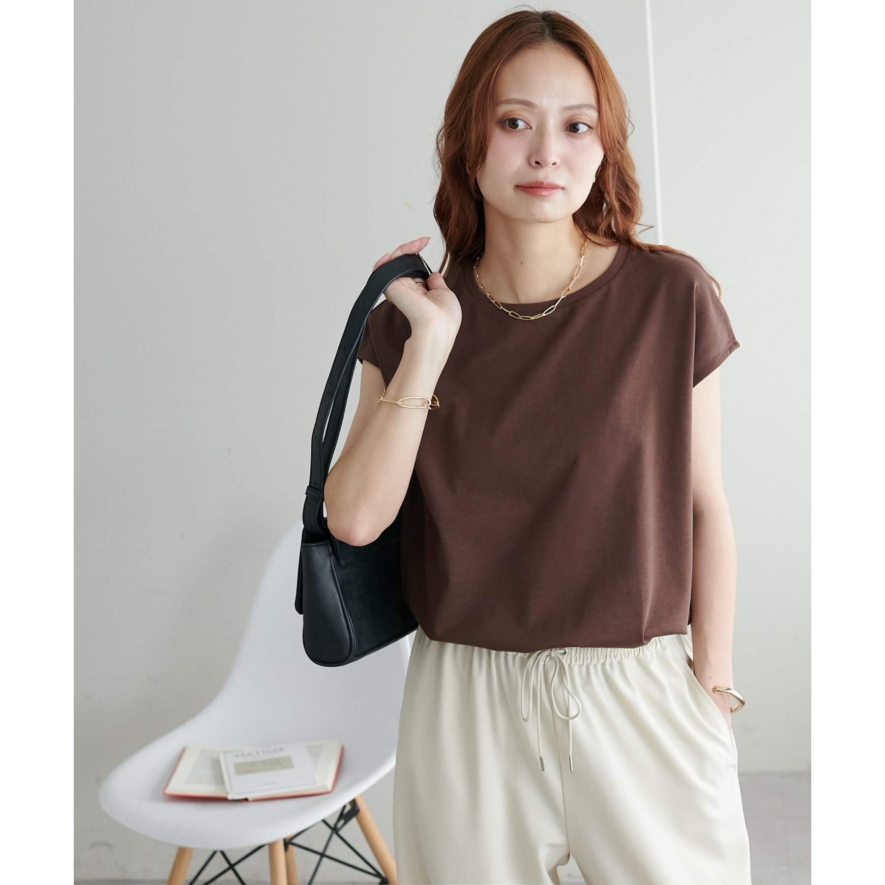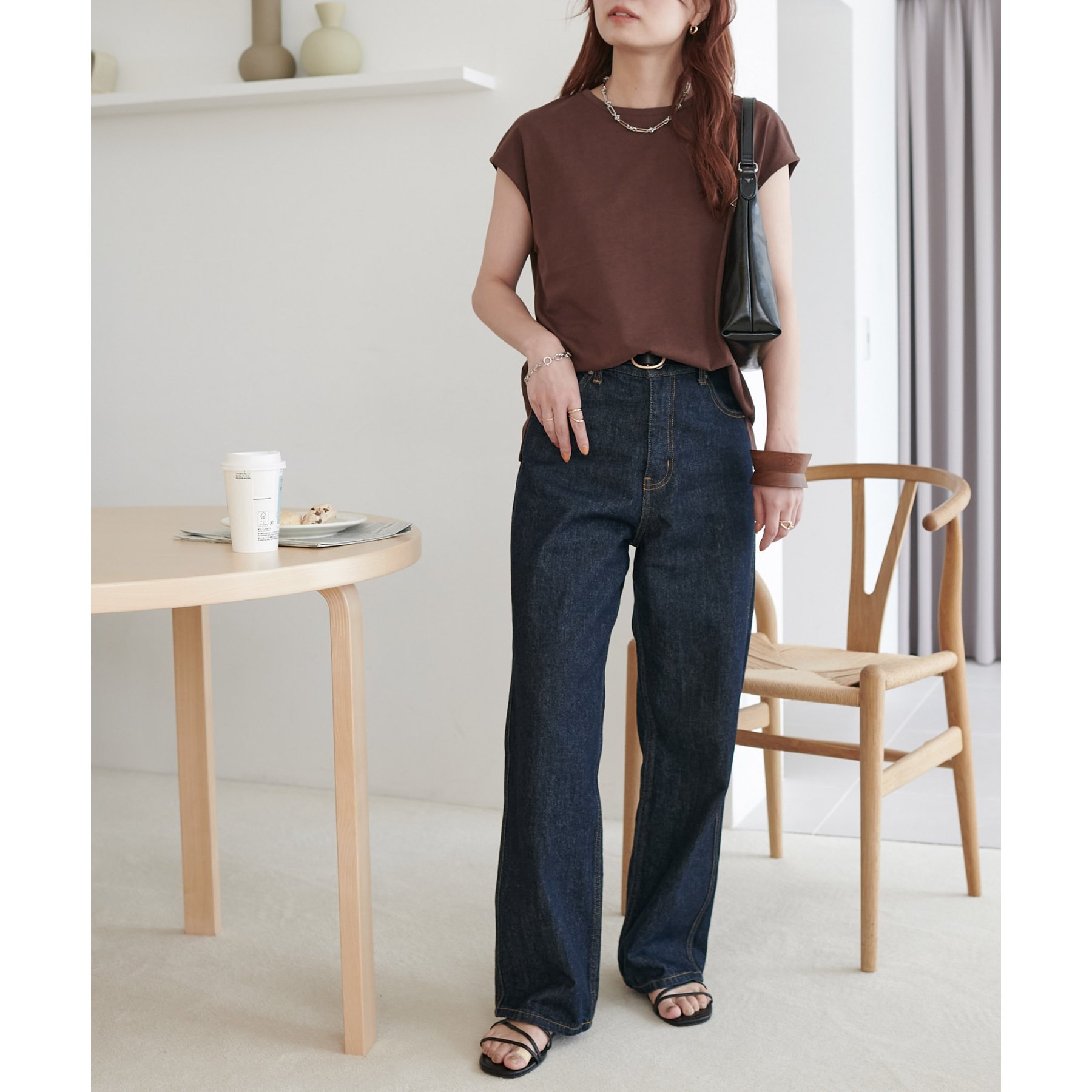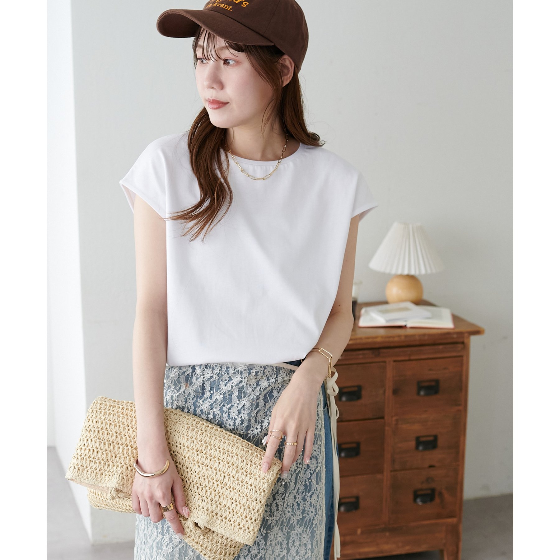 シンプルなトップスなので、デザインのあるアイテムとも合わせやすいです!