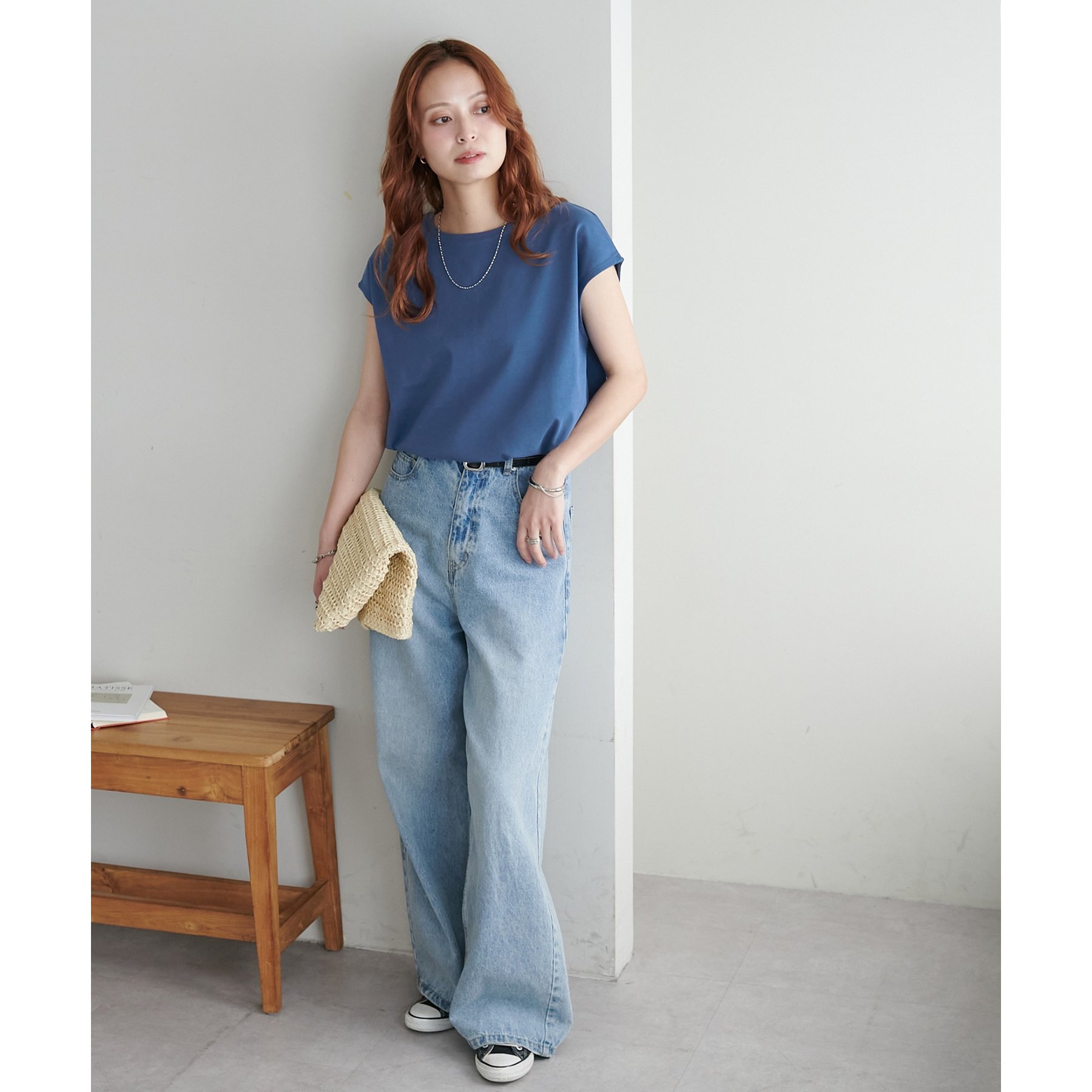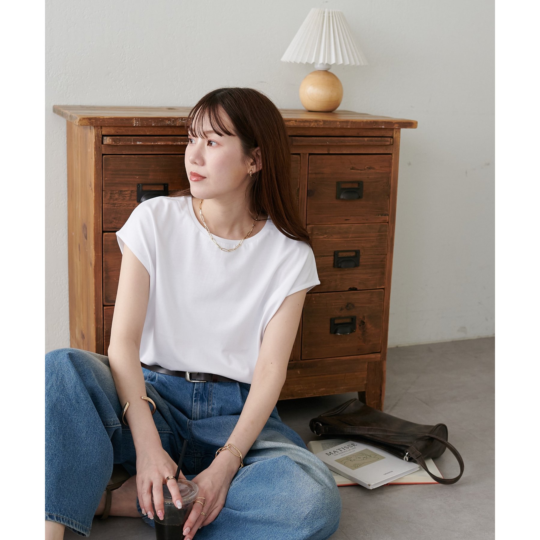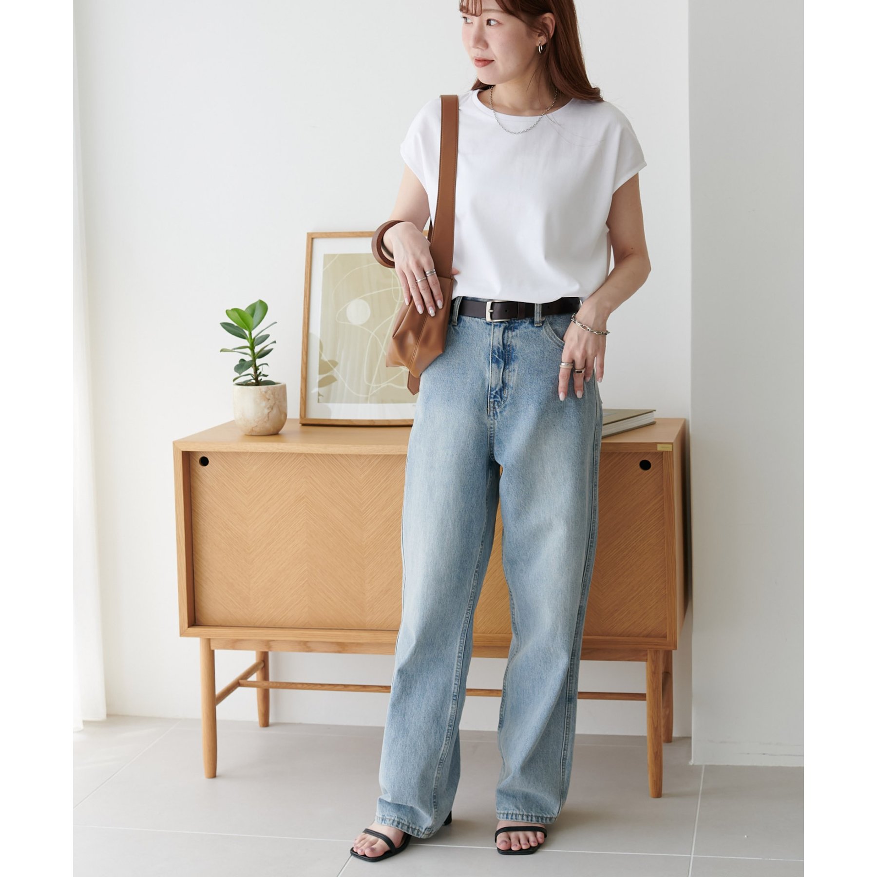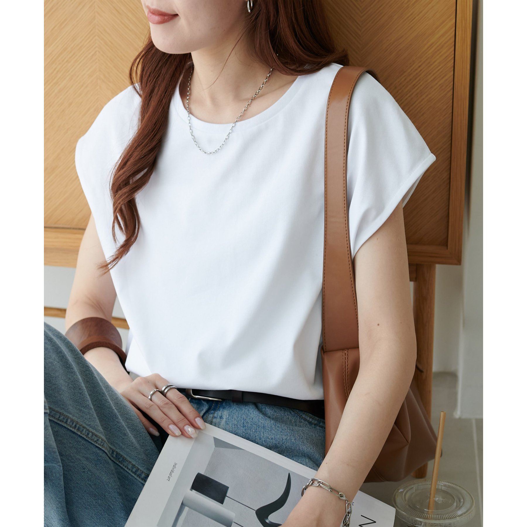 シンプルなトップスなので、デザインのあるアイテムとも合わせやすいです!