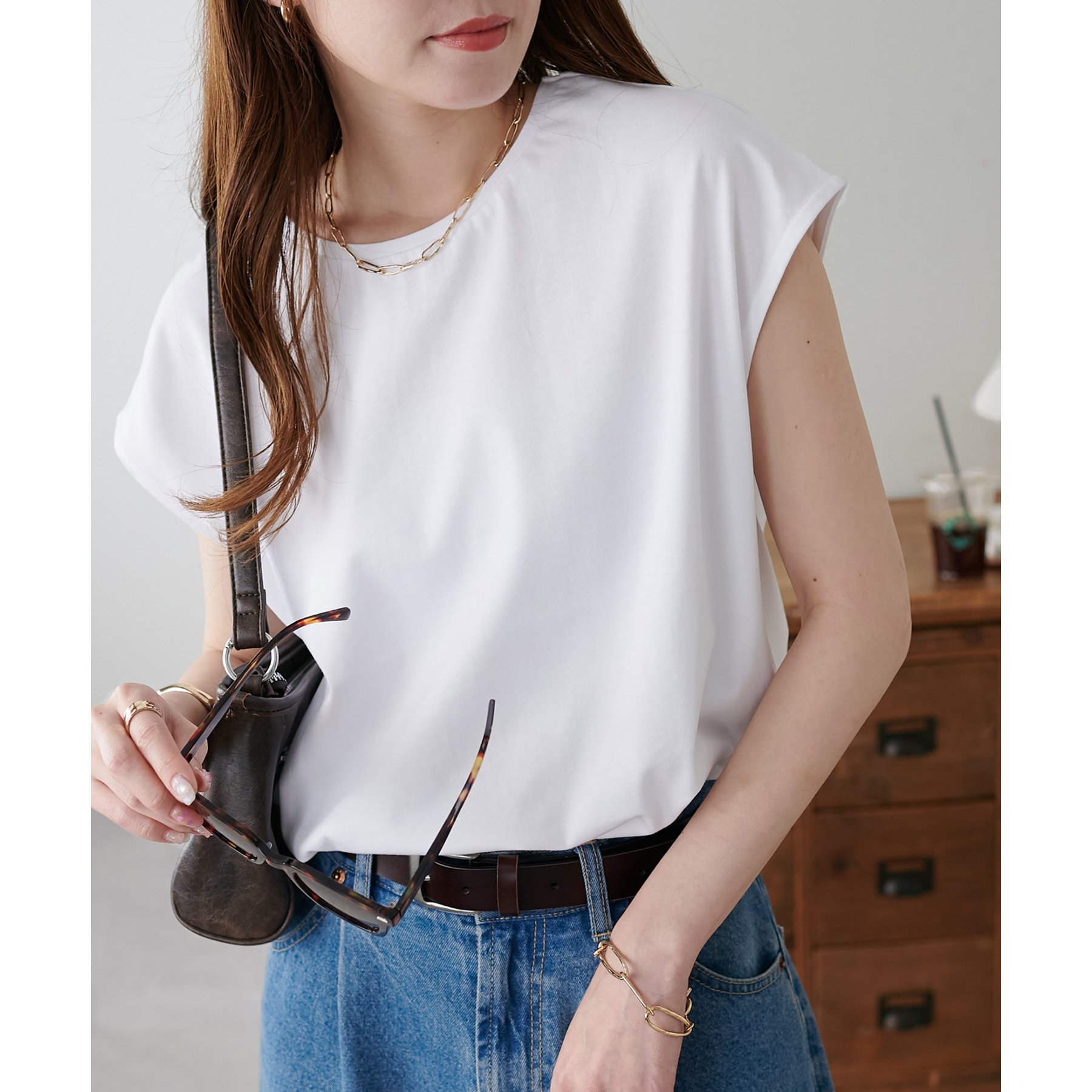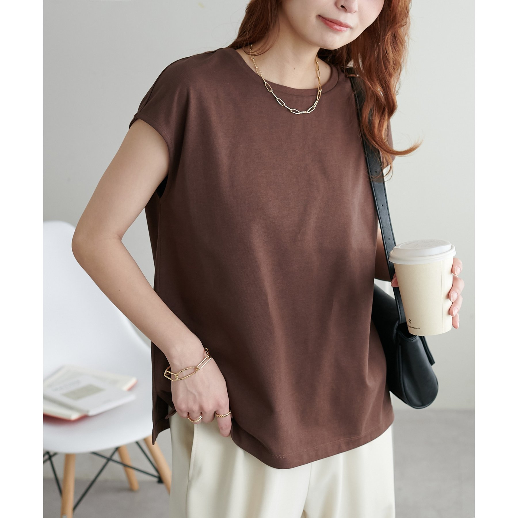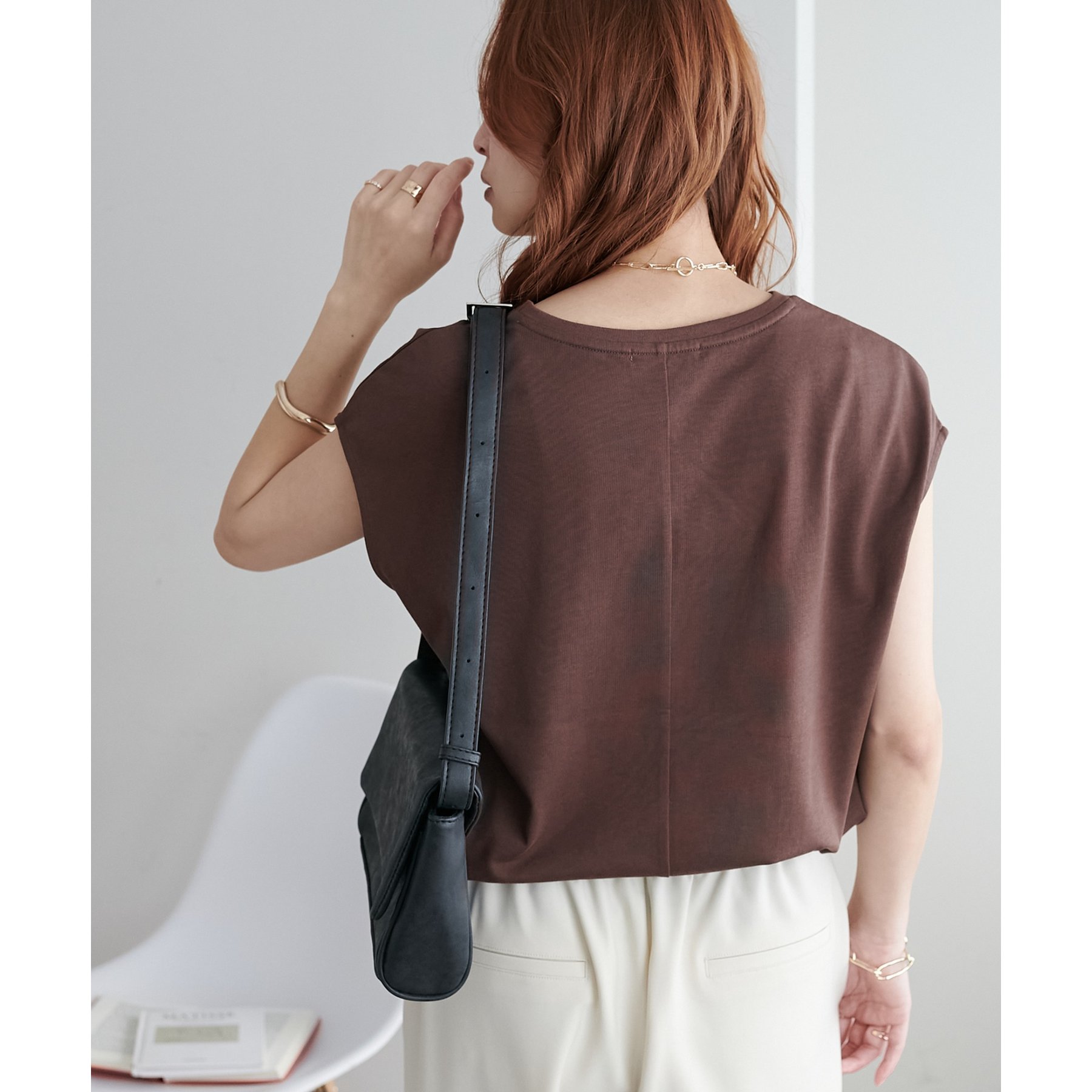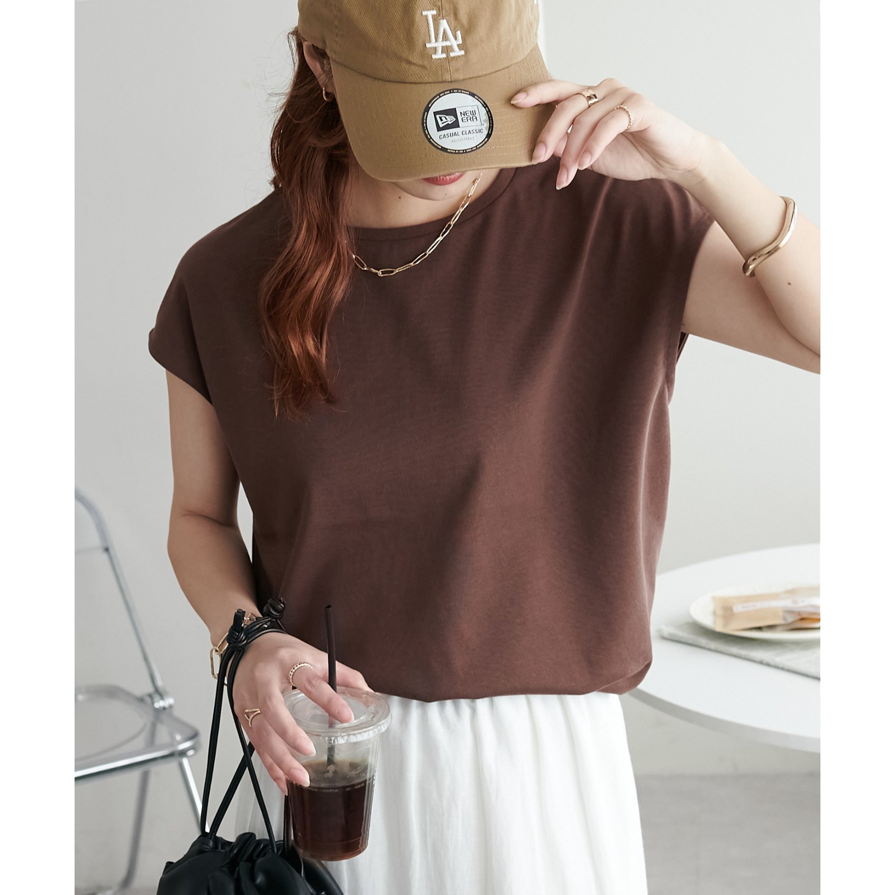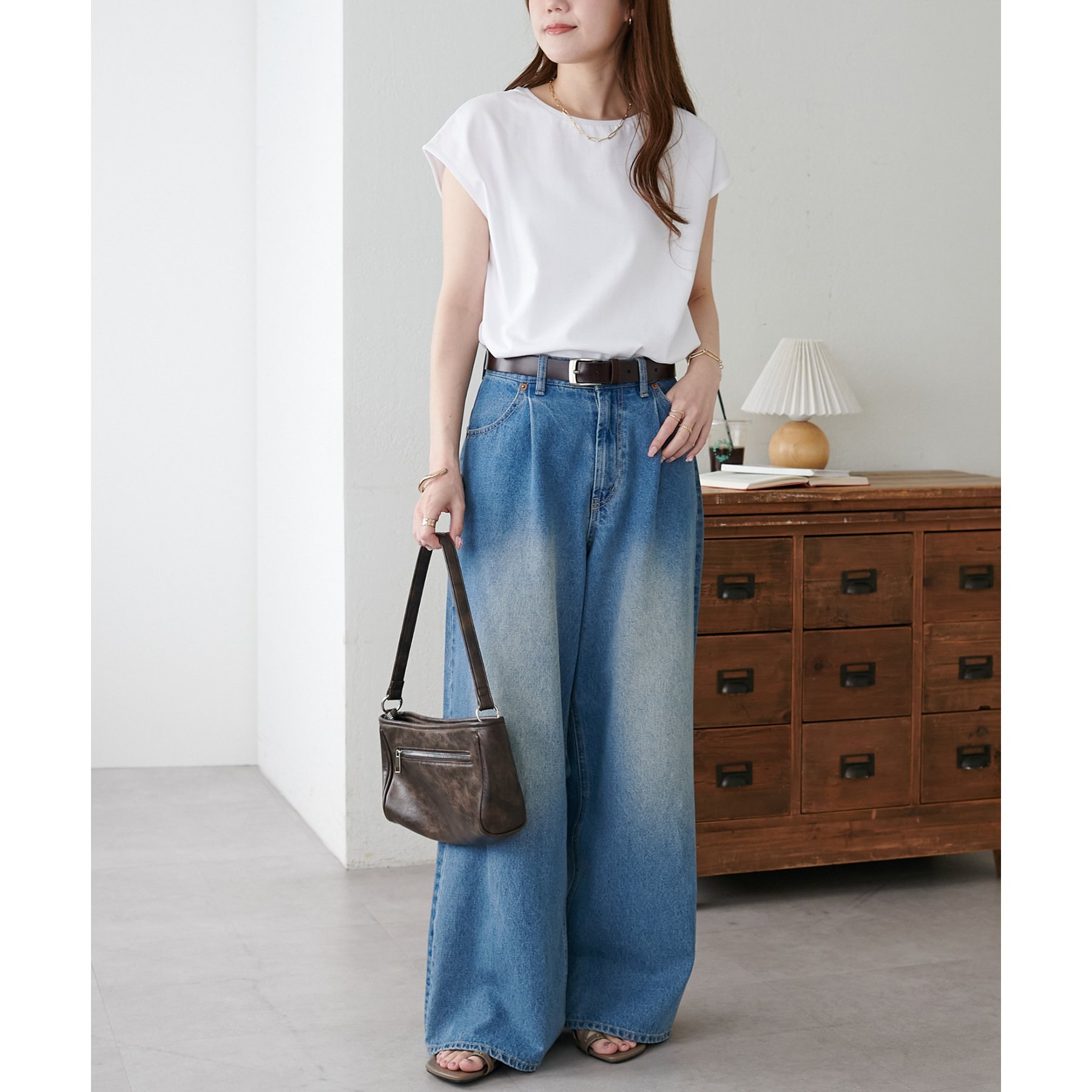 シンプルなトップスなので、デザインのあるアイテムとも合わせやすいです!