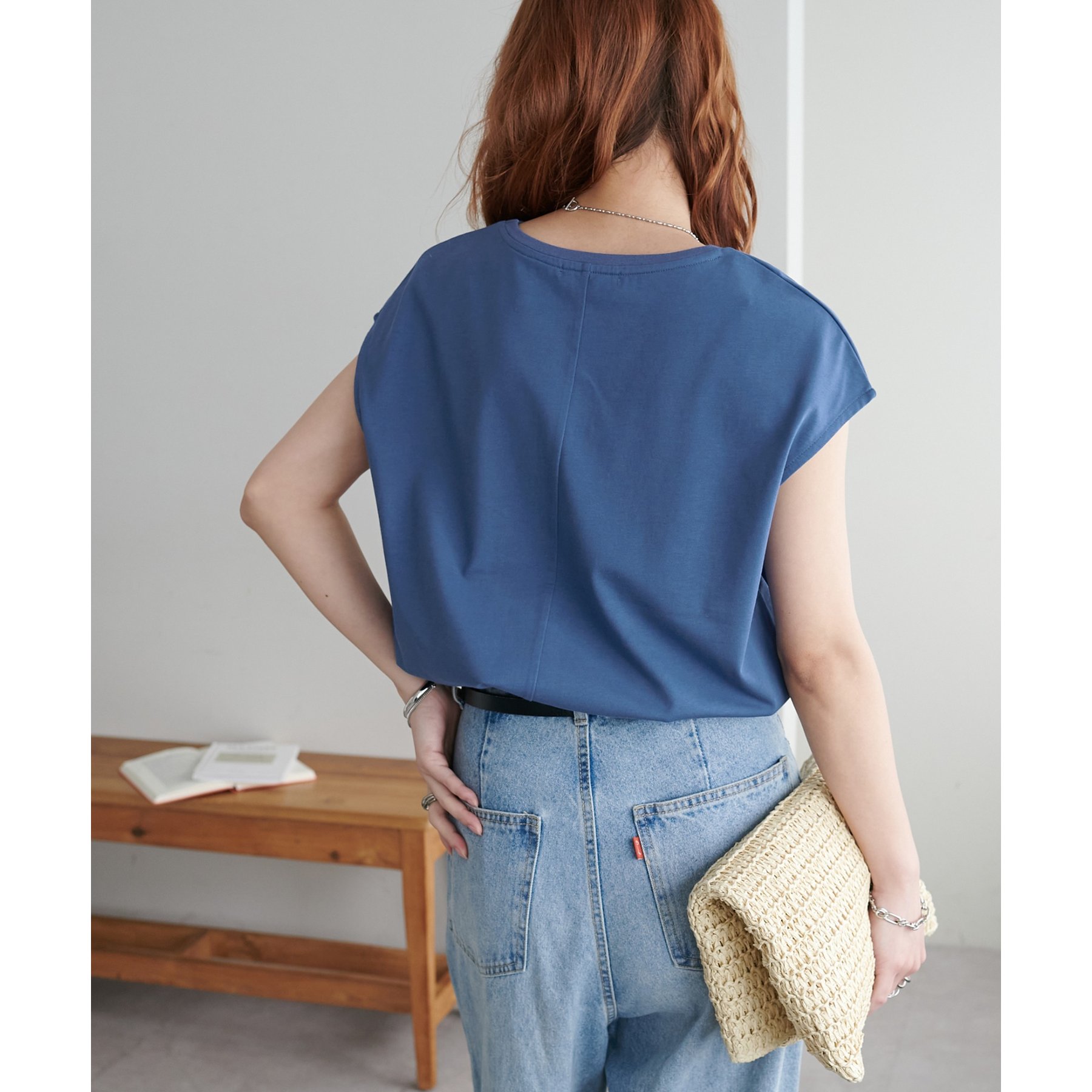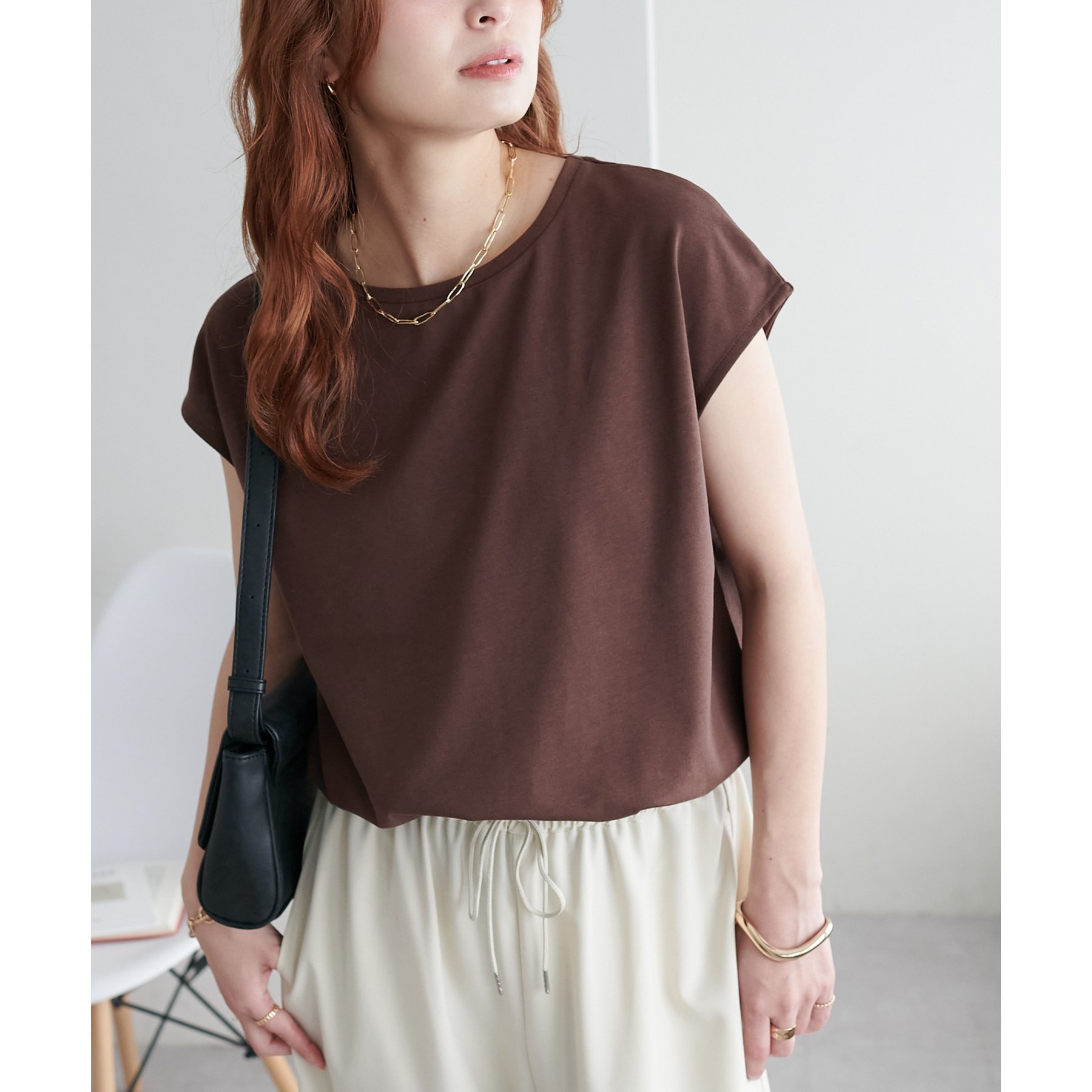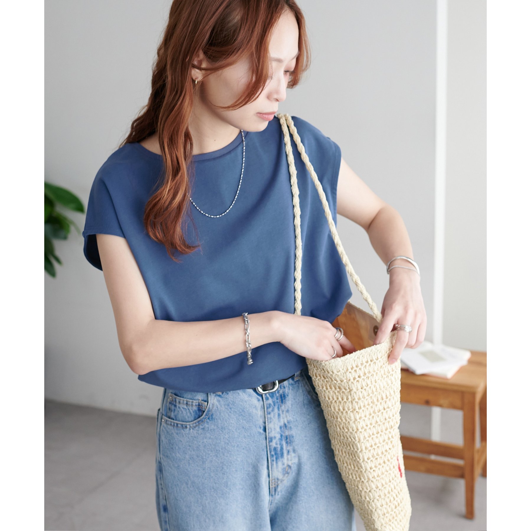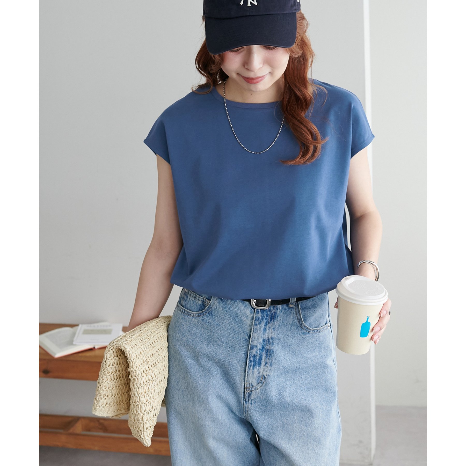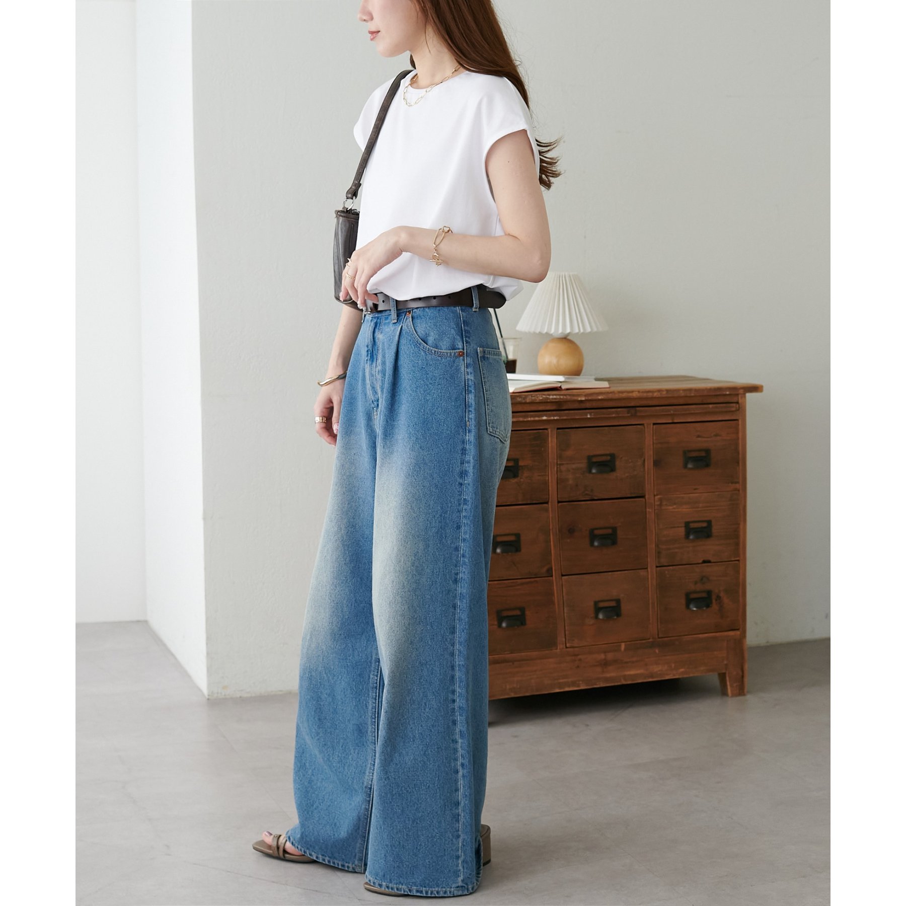 シンプルなトップスなので、デザインのあるアイテムとも合わせやすいです!