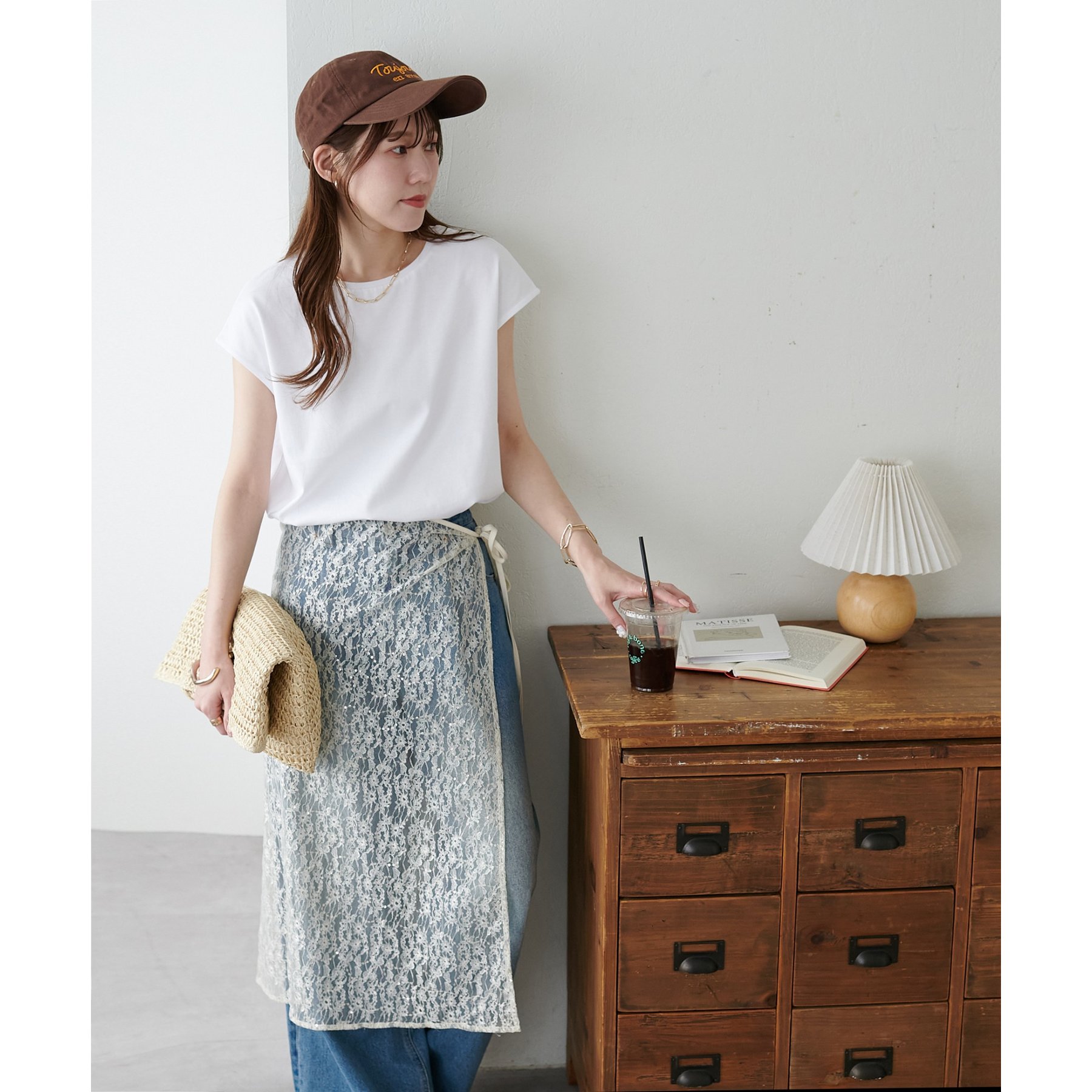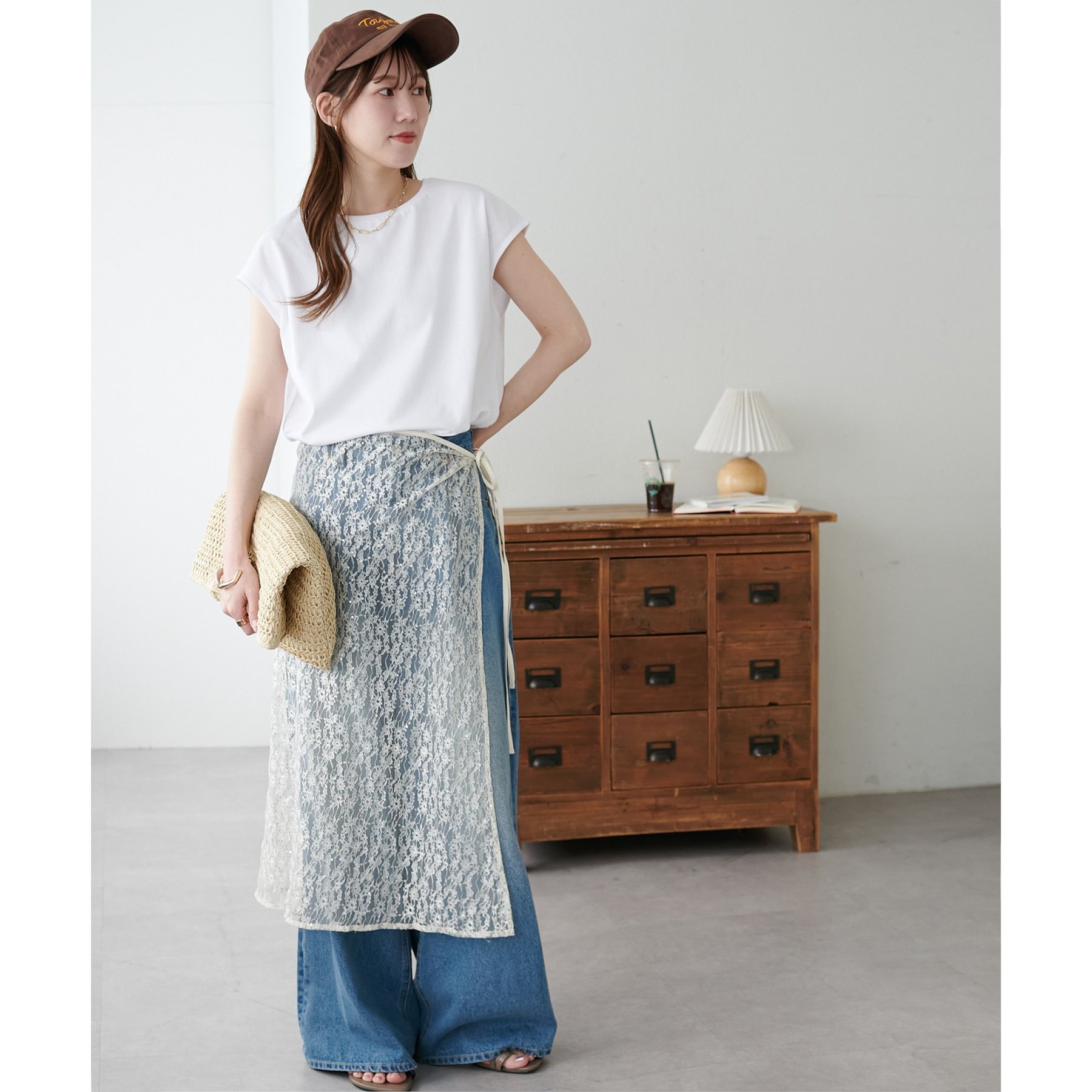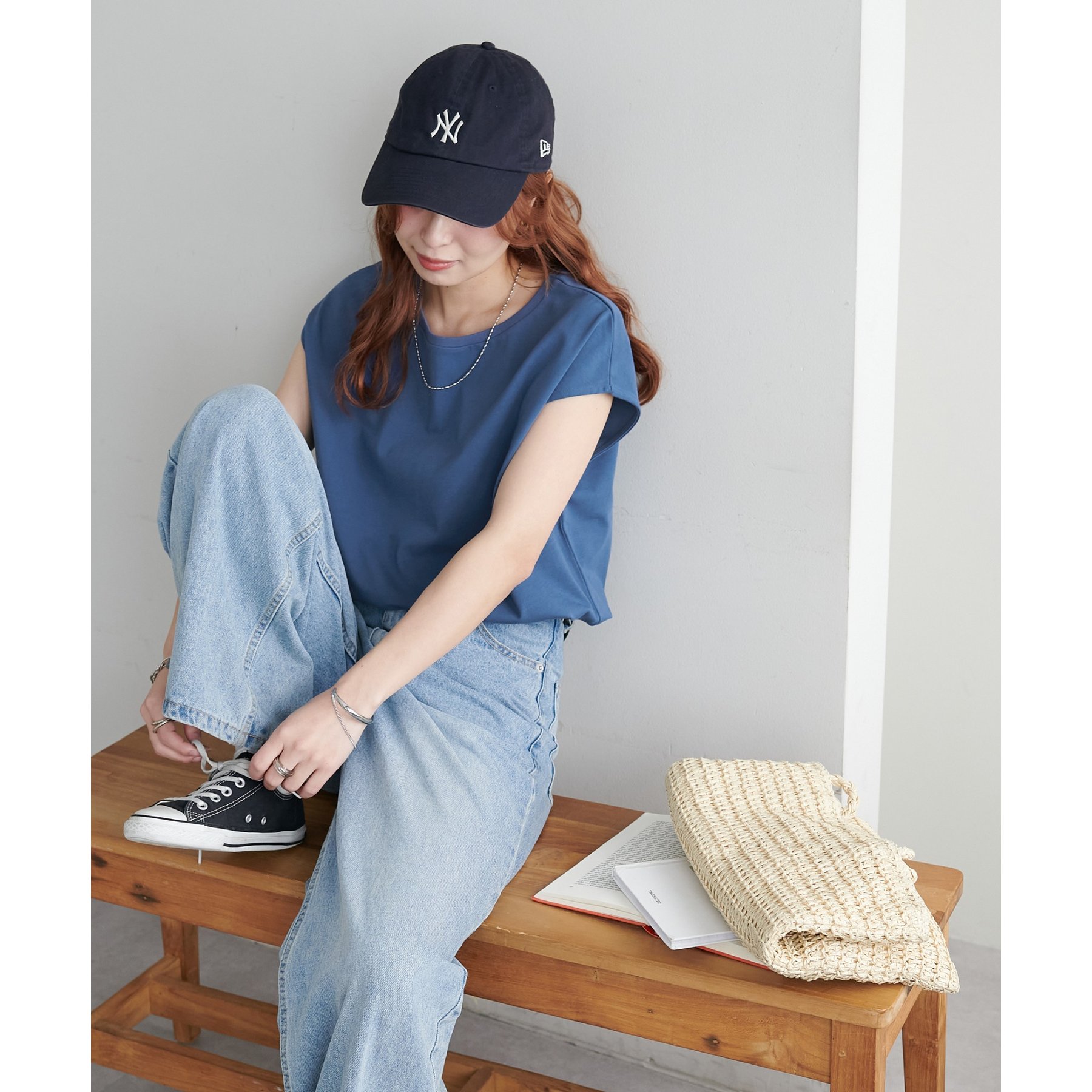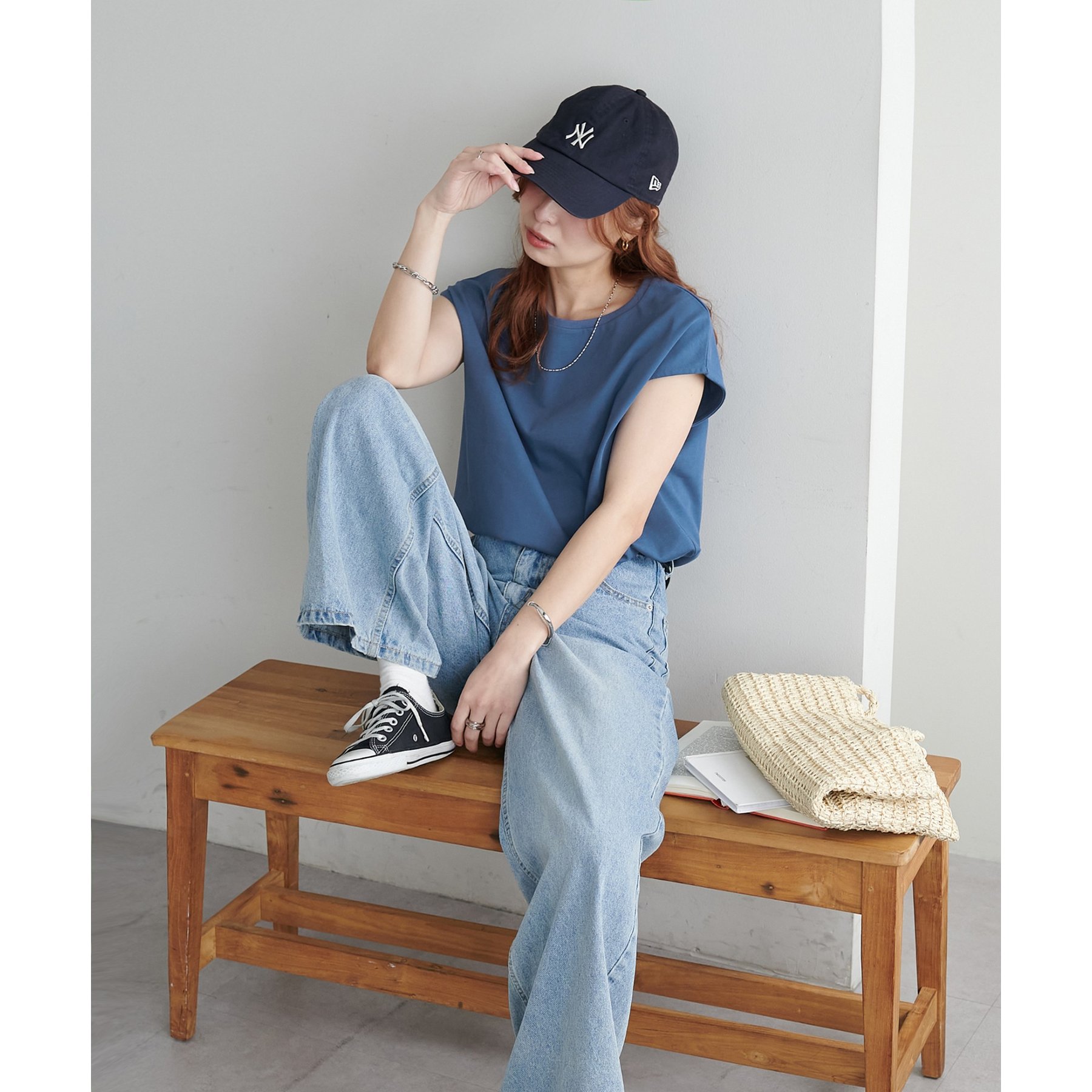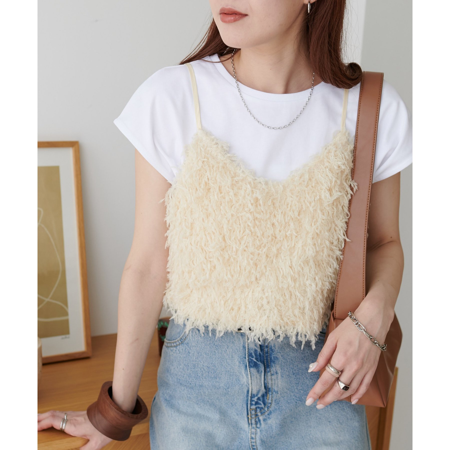 シンプルなトップスなので、デザインのあるアイテムとも合わせやすいです!