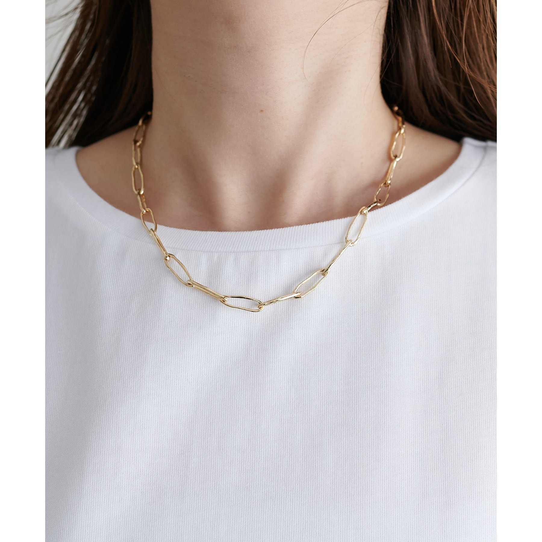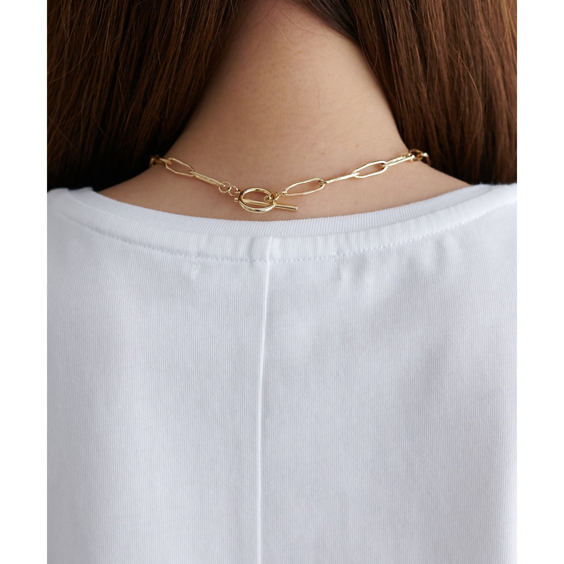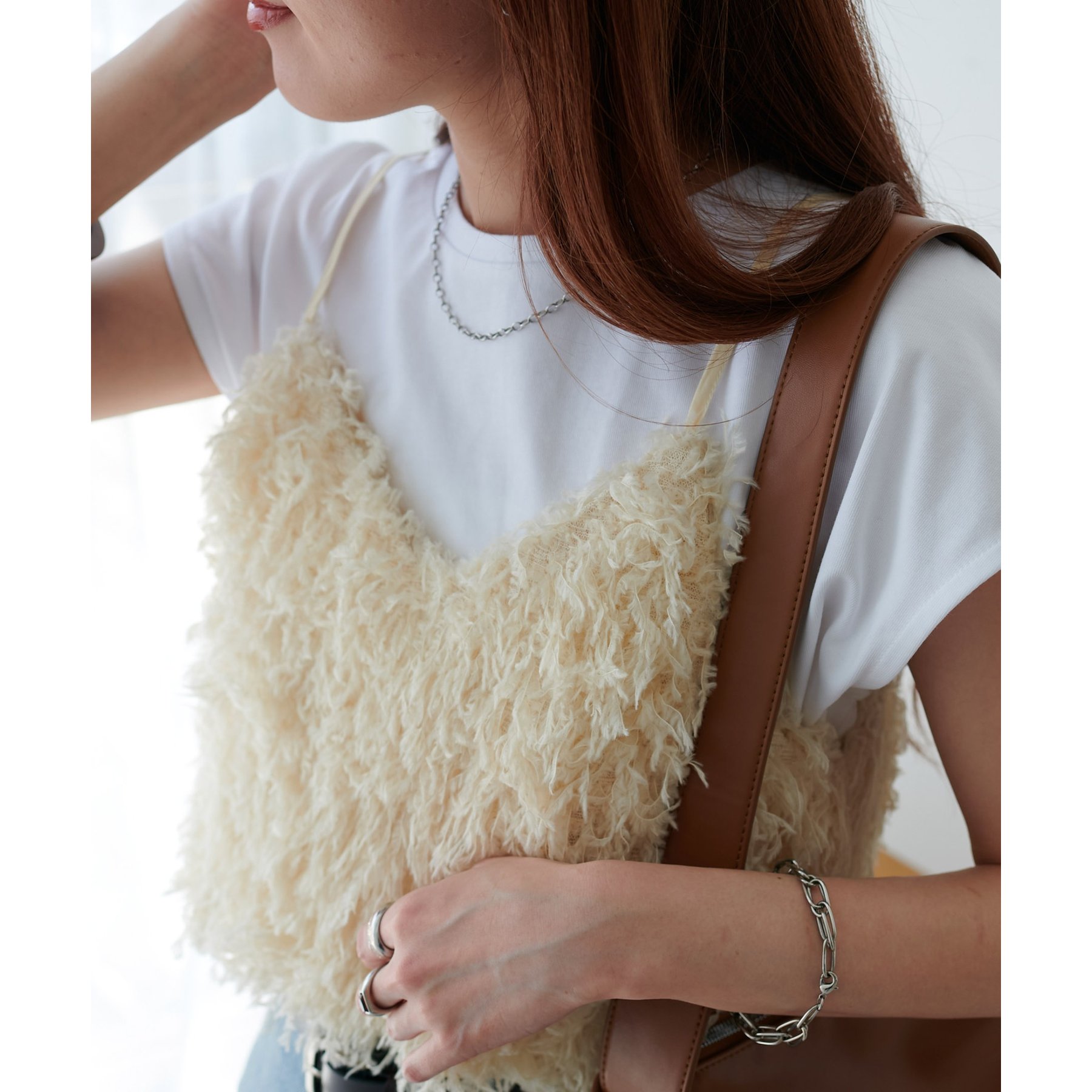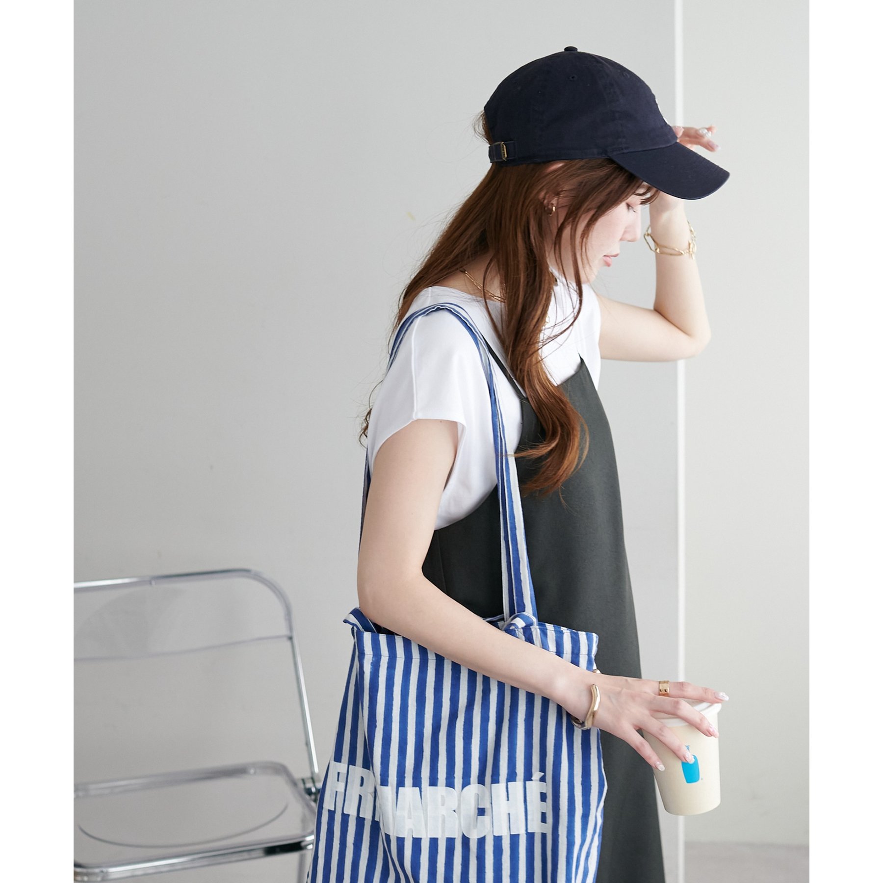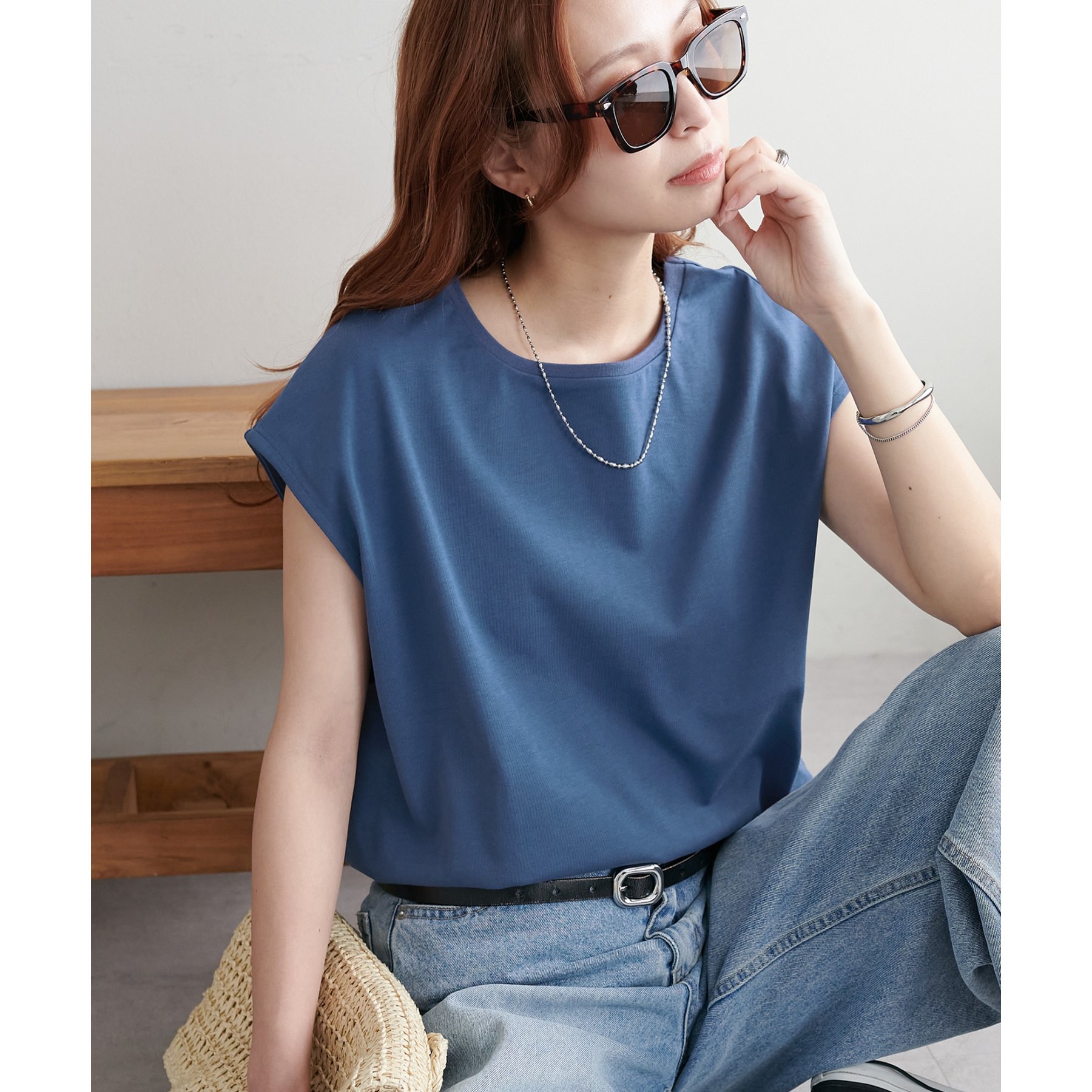 シンプルなトップスなので、デザインのあるアイテムとも合わせやすいです!