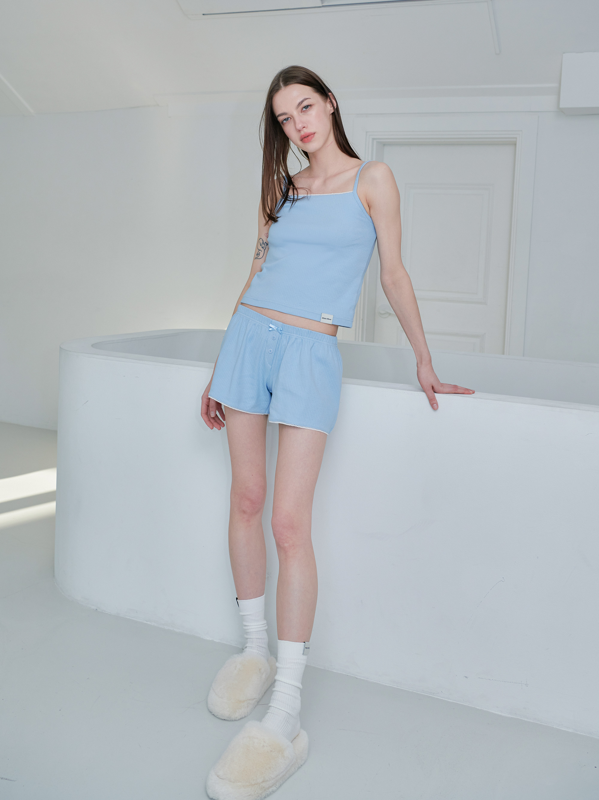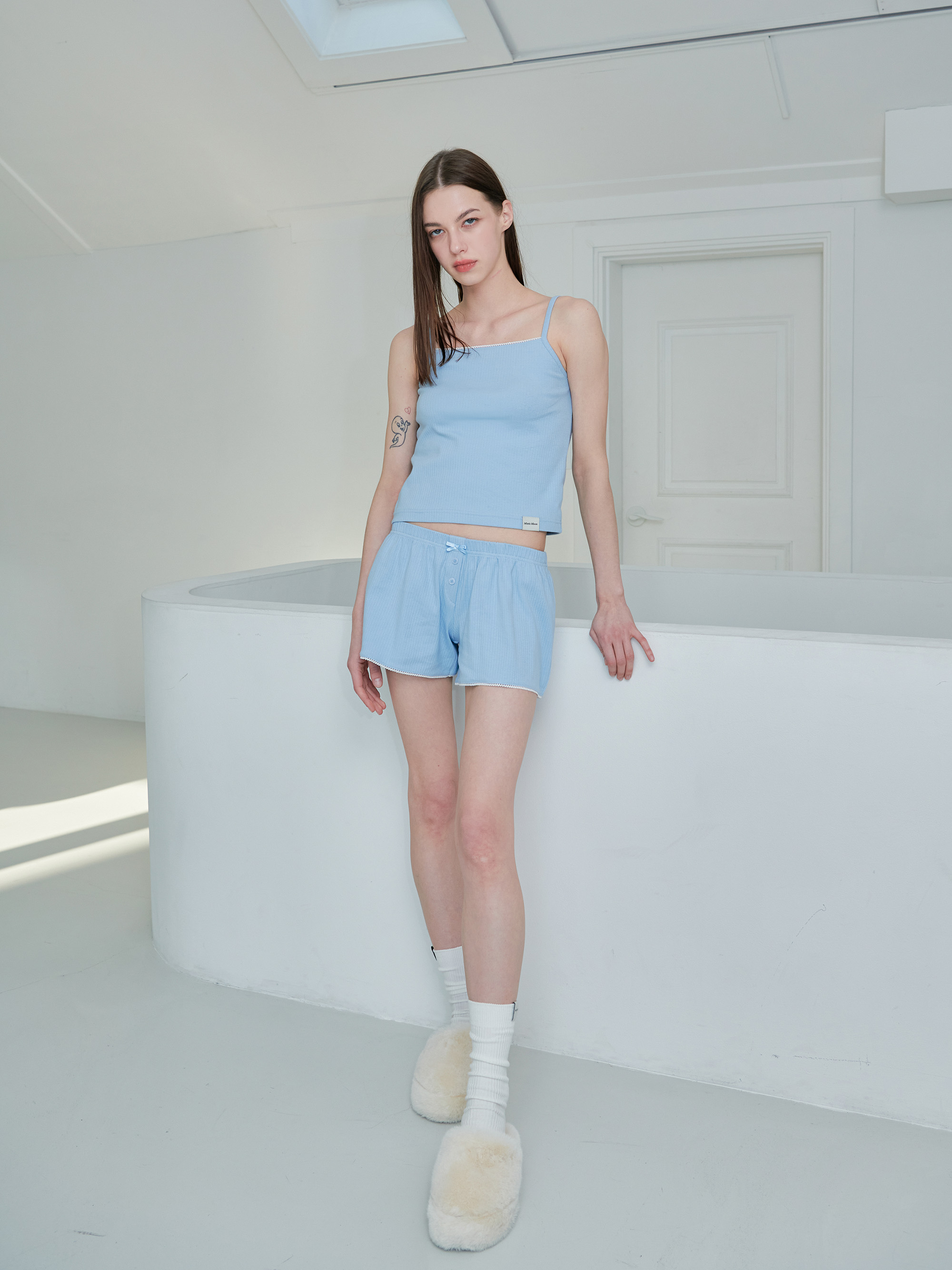 セミAラインのシルエットがすっきりとした印象のミニショーツです。 ローライズ仕様と軽やかな素材で、まるで穿いていないかのような軽い着用感を実現しています。 型崩れしにくくやわらかなリブ素材に、リボン・レース・ラベルのディテールをあしらい、ラブリーなムードをプラスしました。 ルームウェアとしてはもちろん、デイリーウェアとしてもさまざまなスタイリングをお楽しみください。