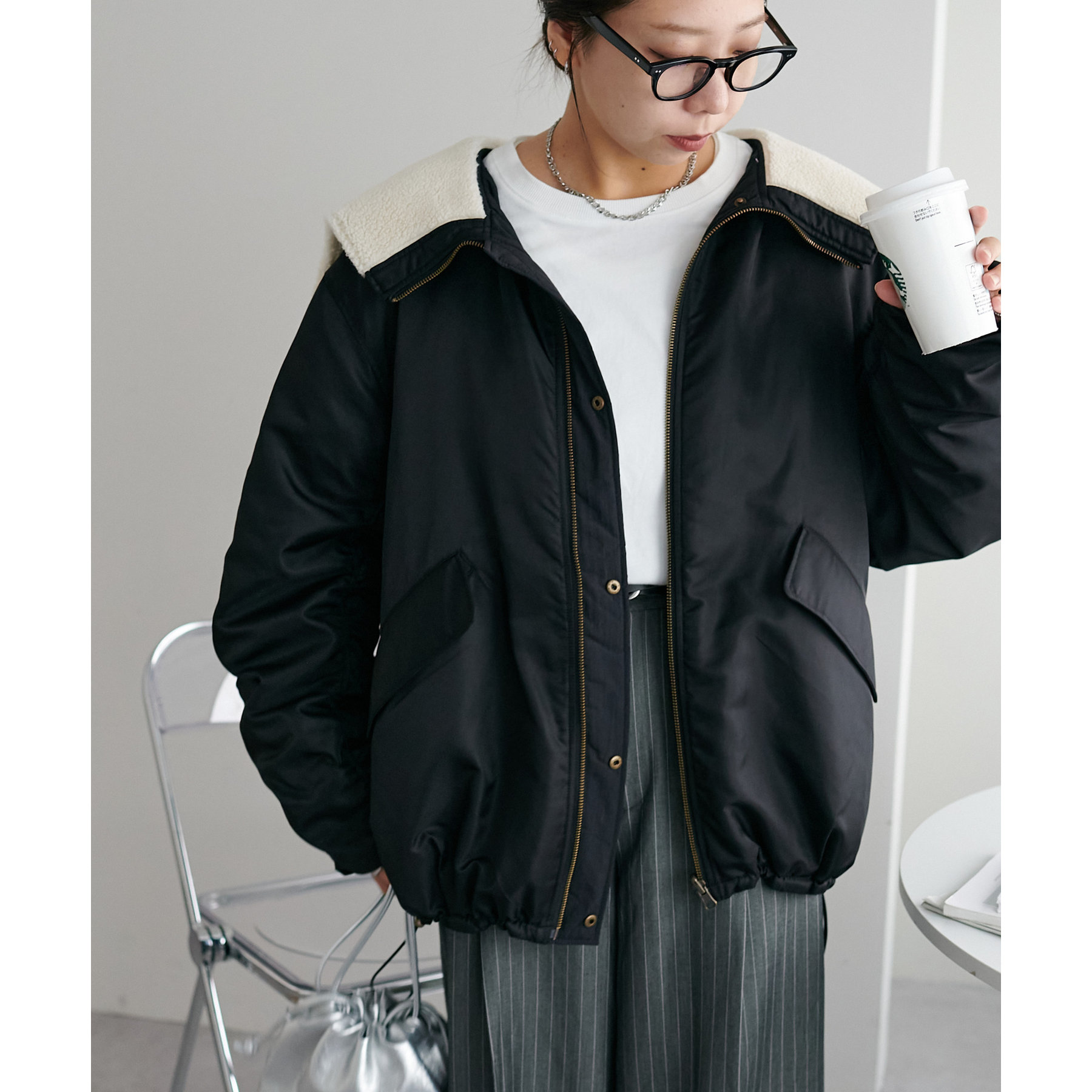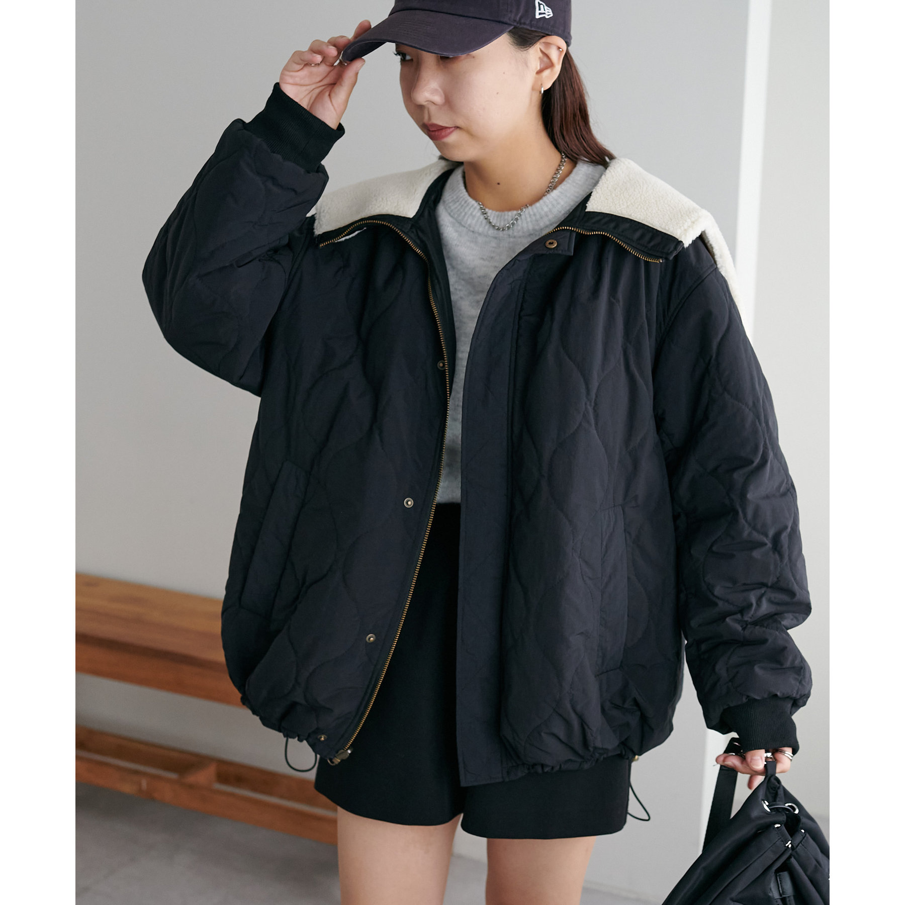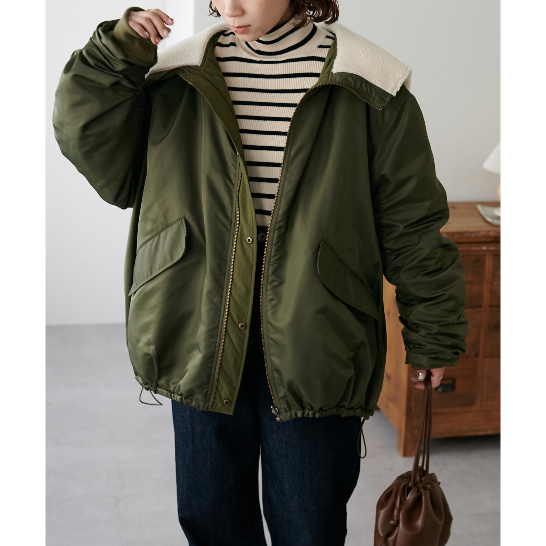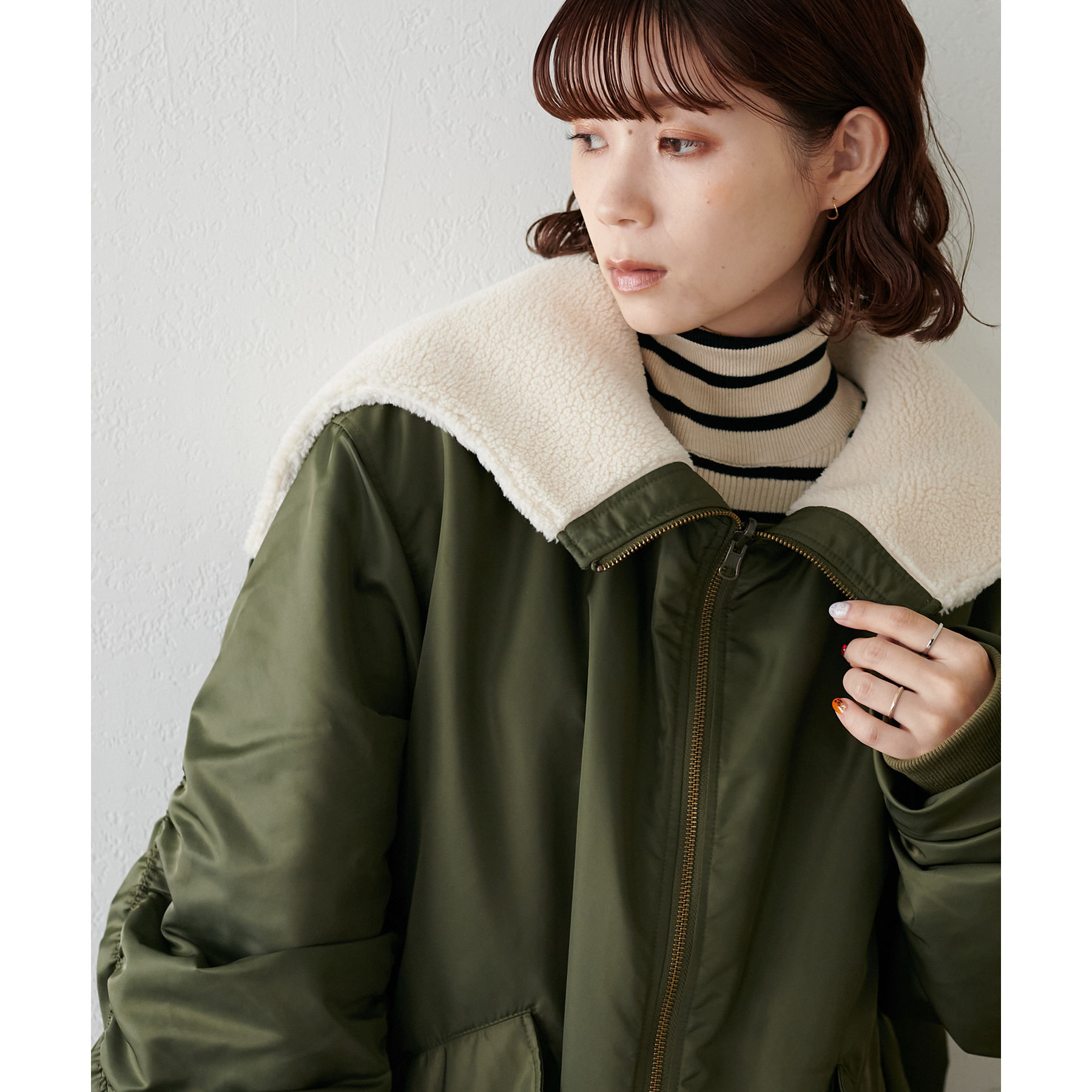 オーバーサイズですが、軽い着心地なのでリラックスして着用できます◎ダブルジップで抜け感が足せるので、低身長も着られてる感を抑えて楽しめます。