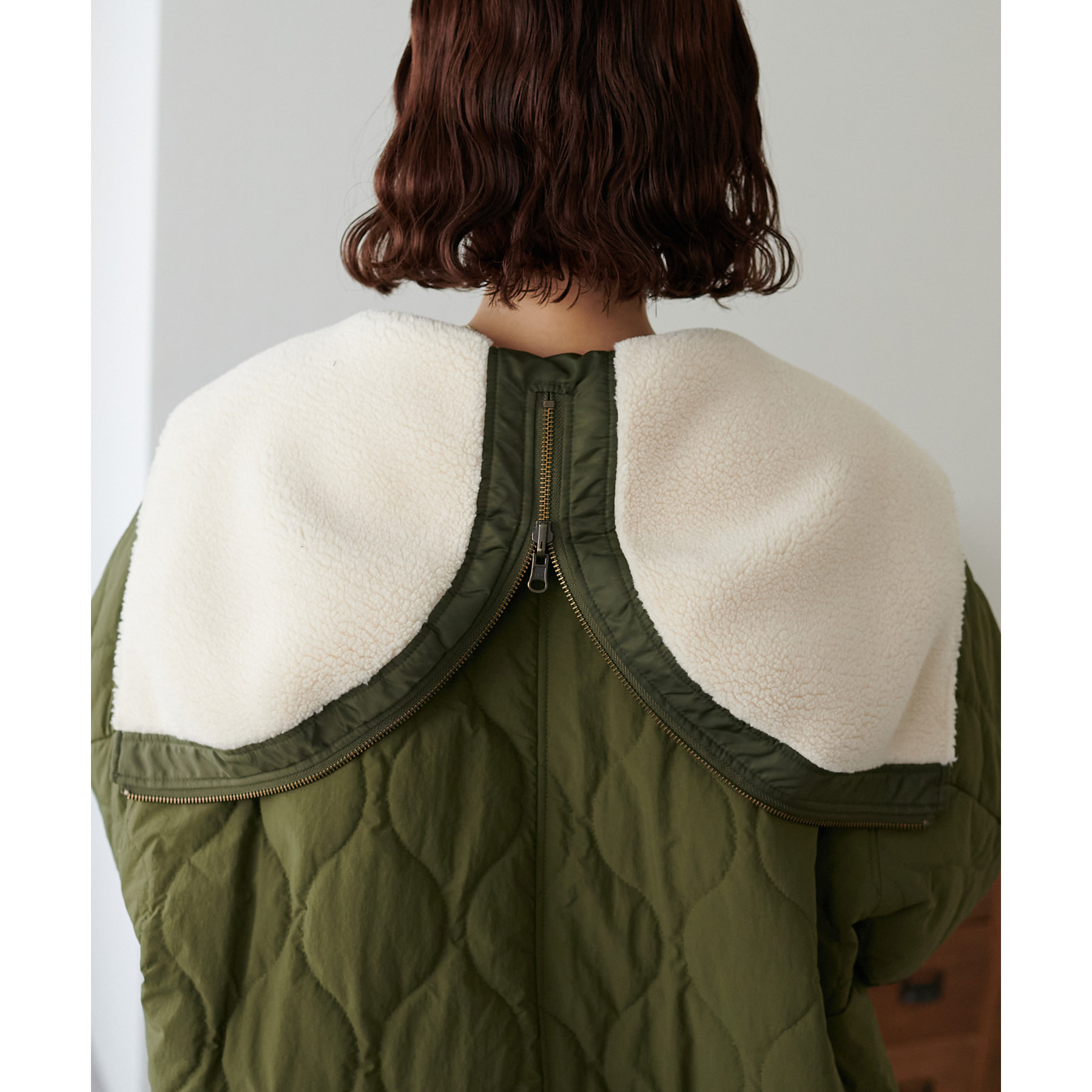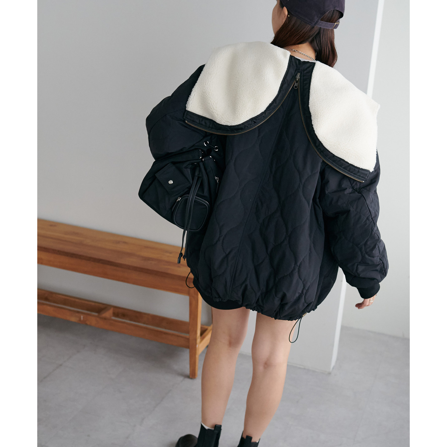 目を惹くビックカラーは、ファスナーを閉めるとフードに大変身!ボア仕様なので、暖かく着ていただけます◎
