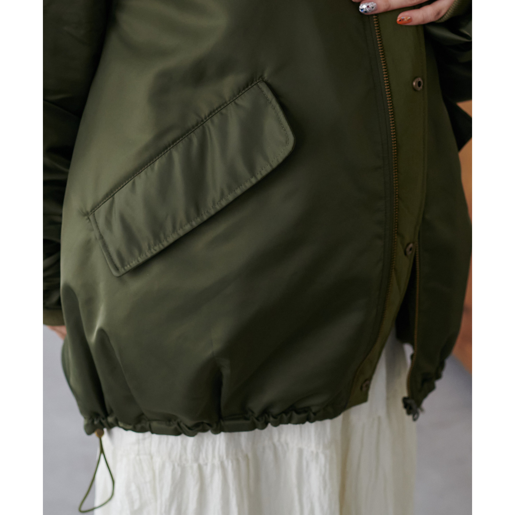 ・150cmスタッフ:ヒップがすっぽり隠れるサイズ感のアウターです。
