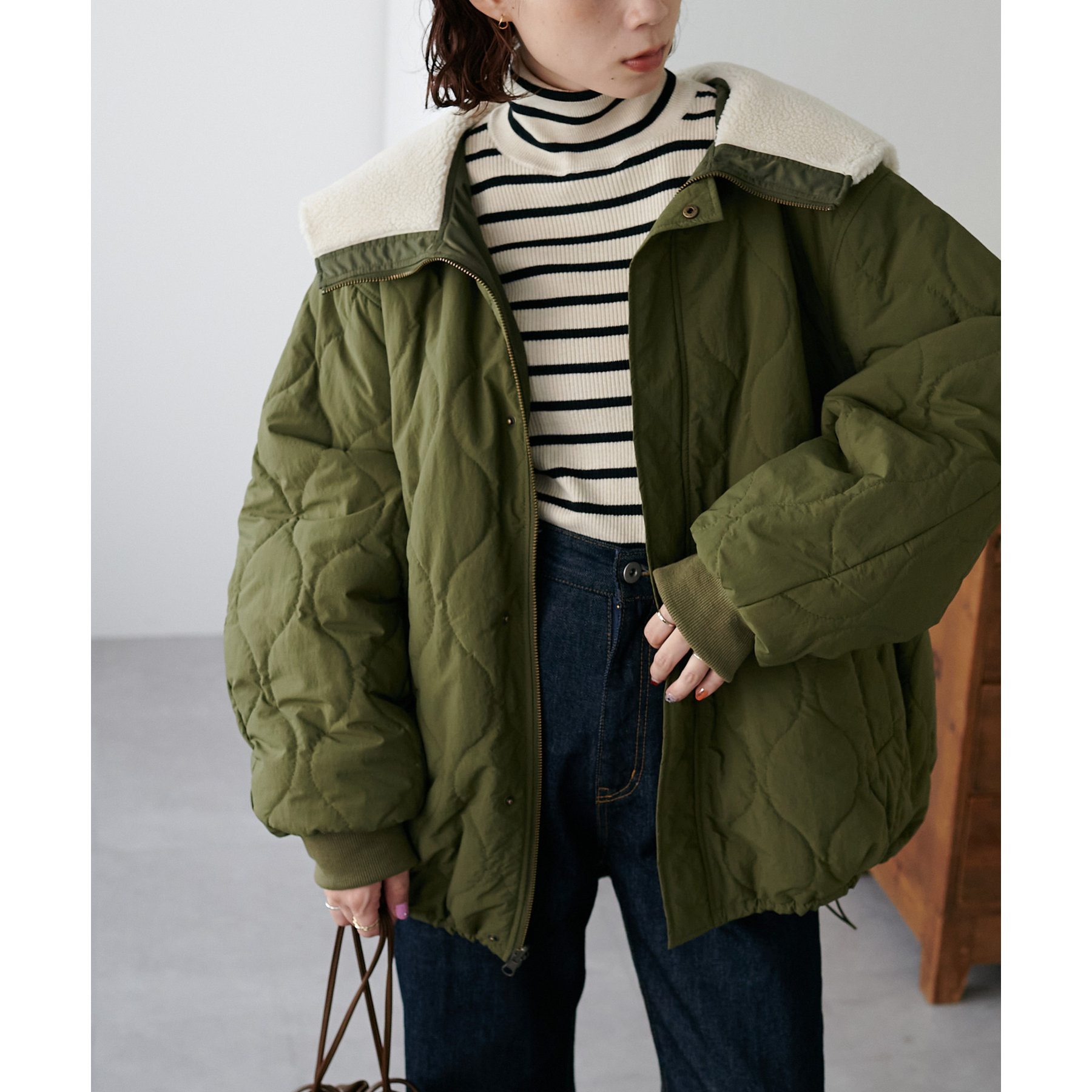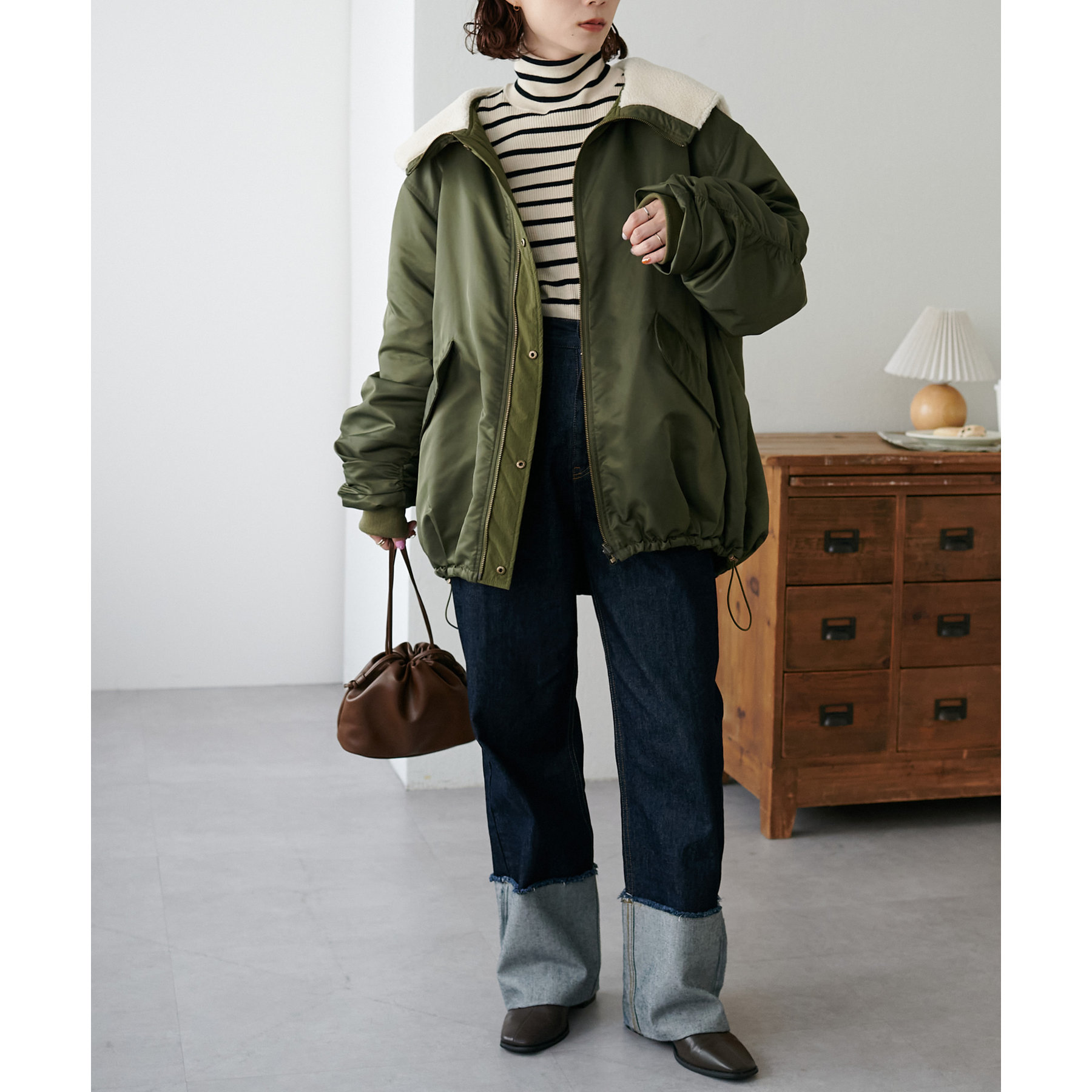 オーバーサイズなので、スウェットや厚手のニットとも楽に合わせていただけます。