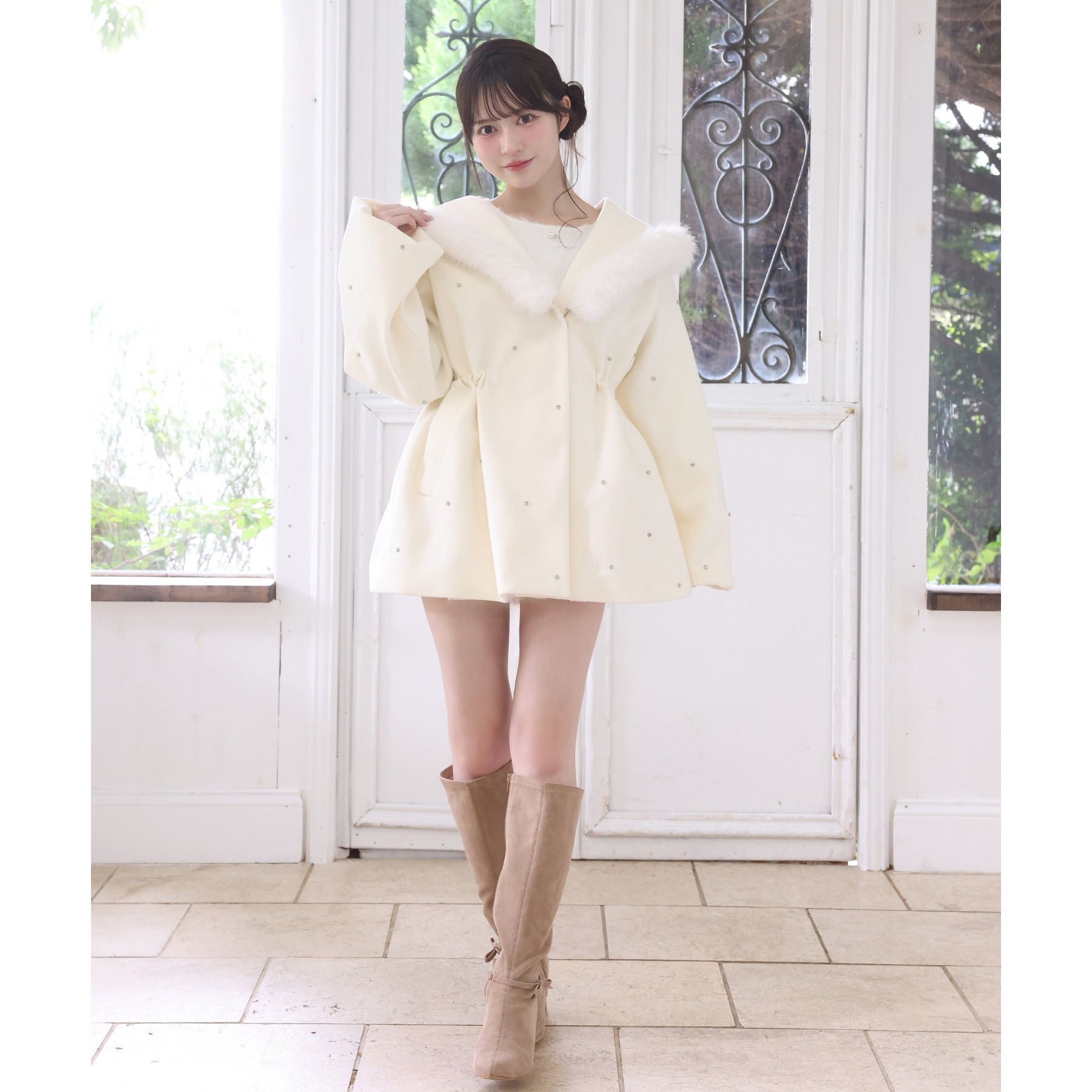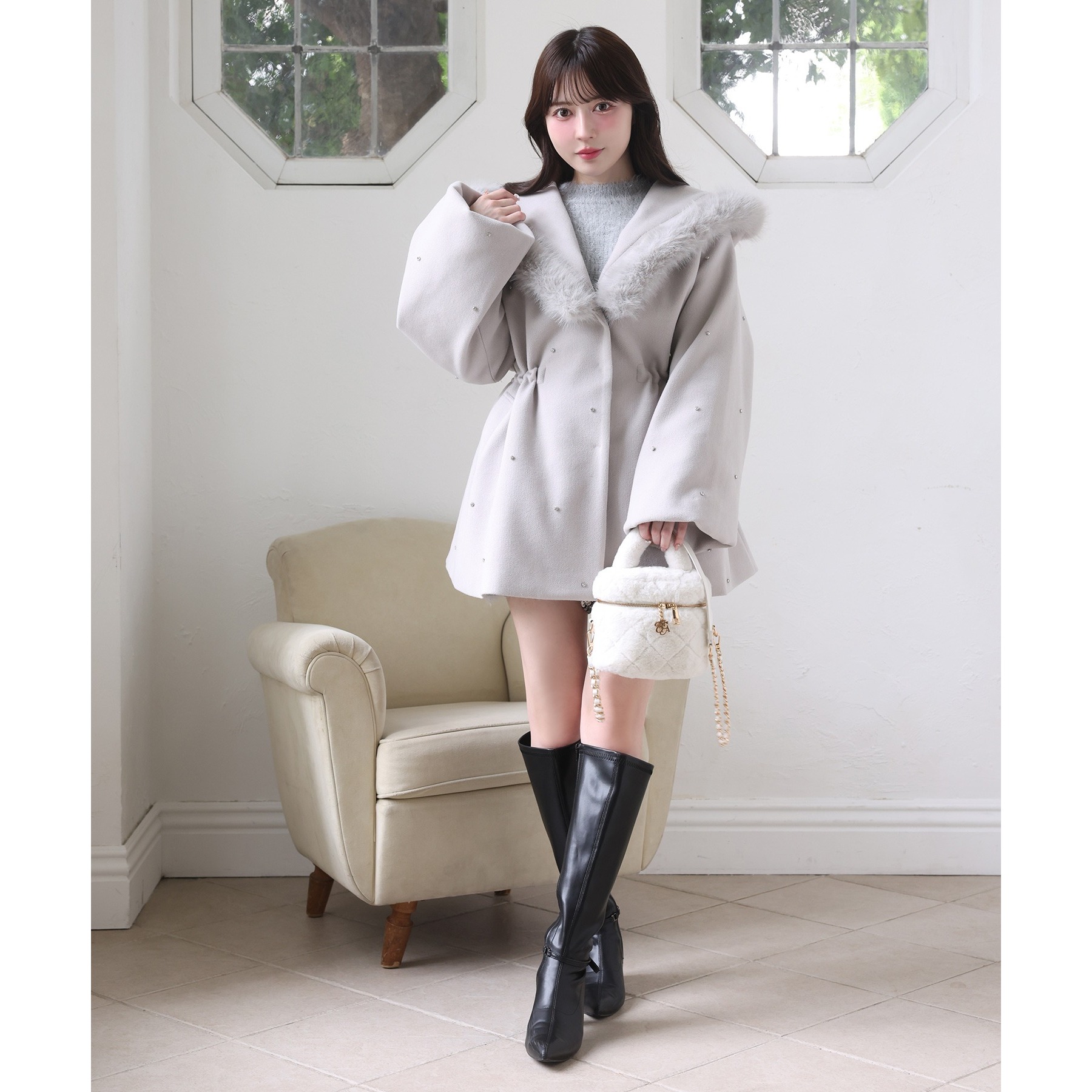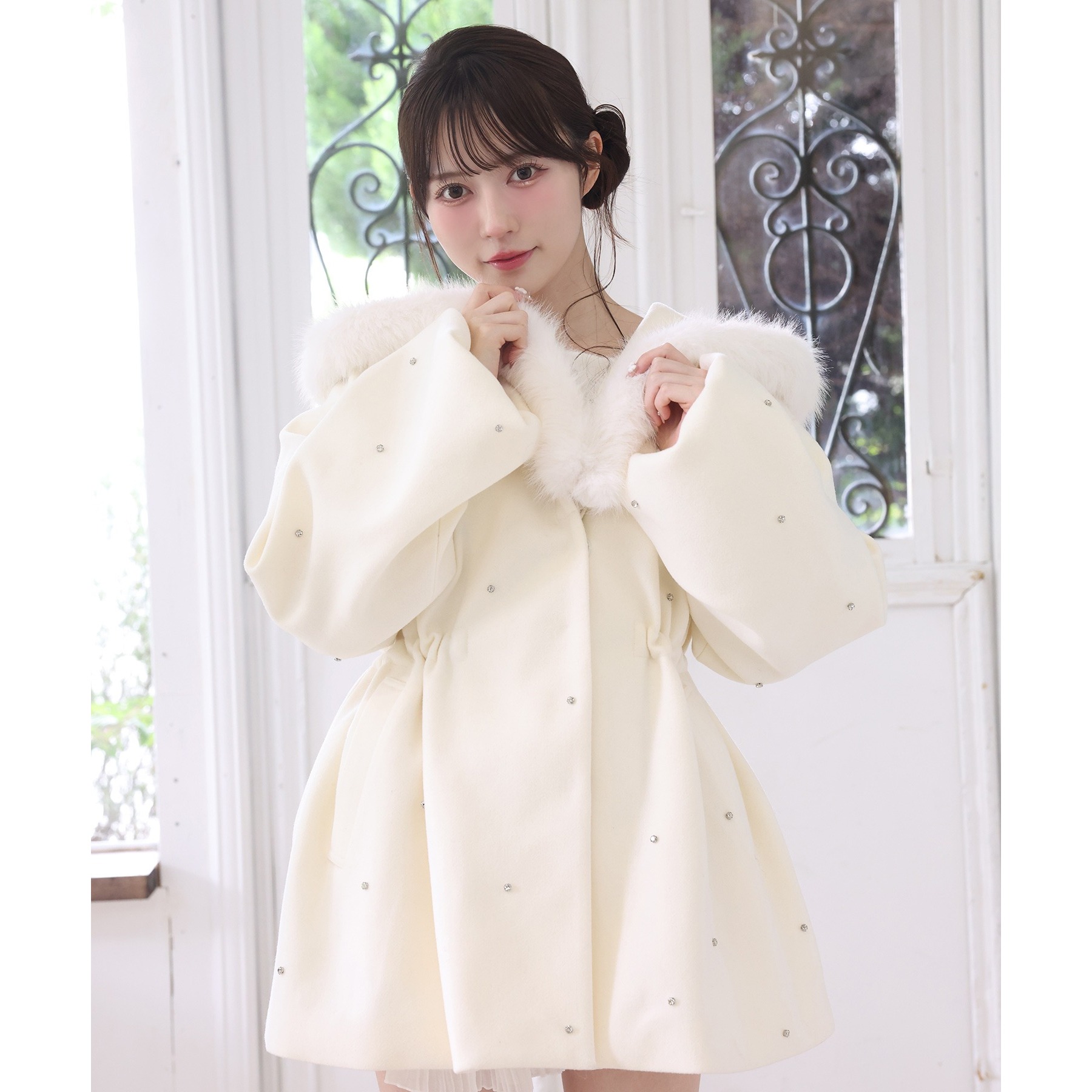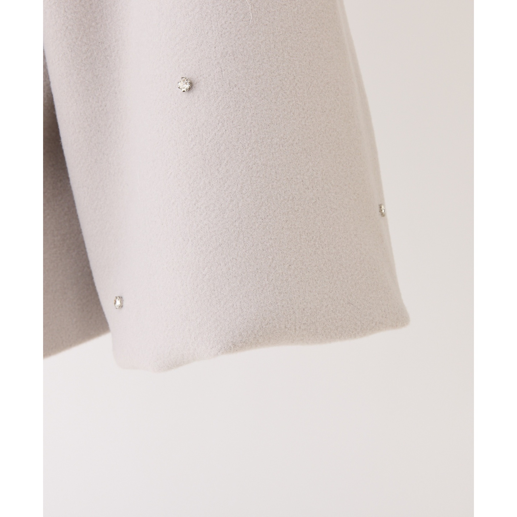 キラキラビジューが華やかさをプラスするミドル丈コート。