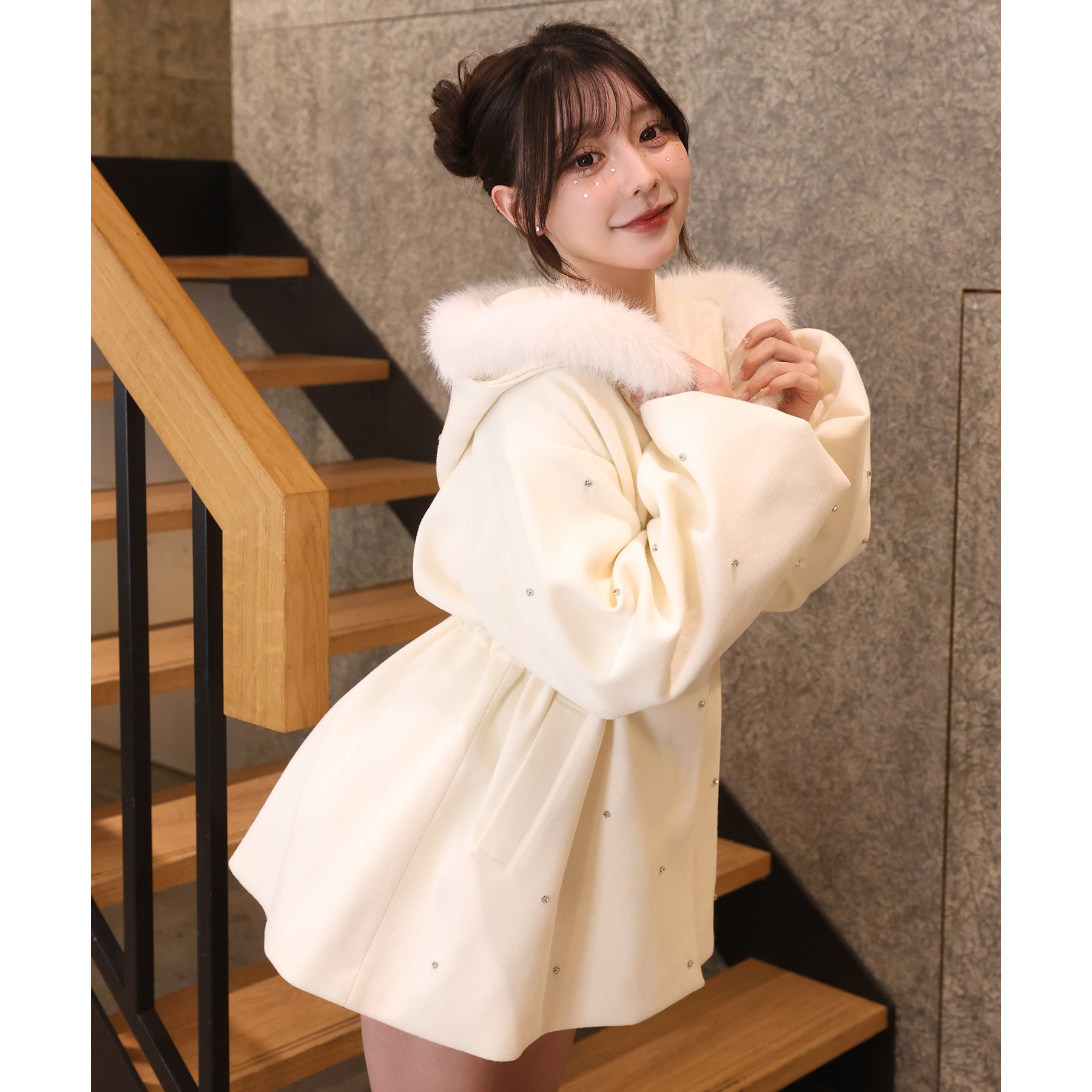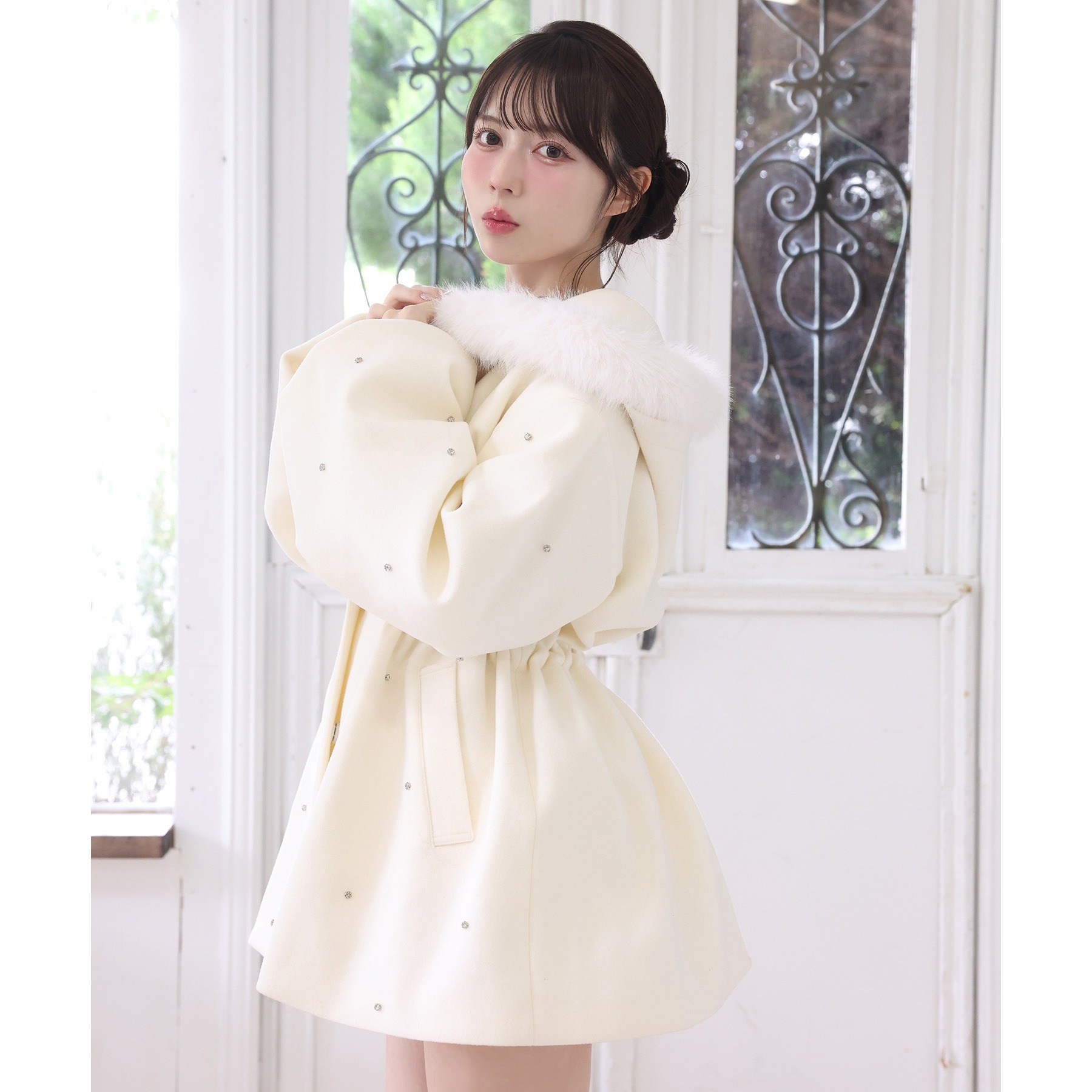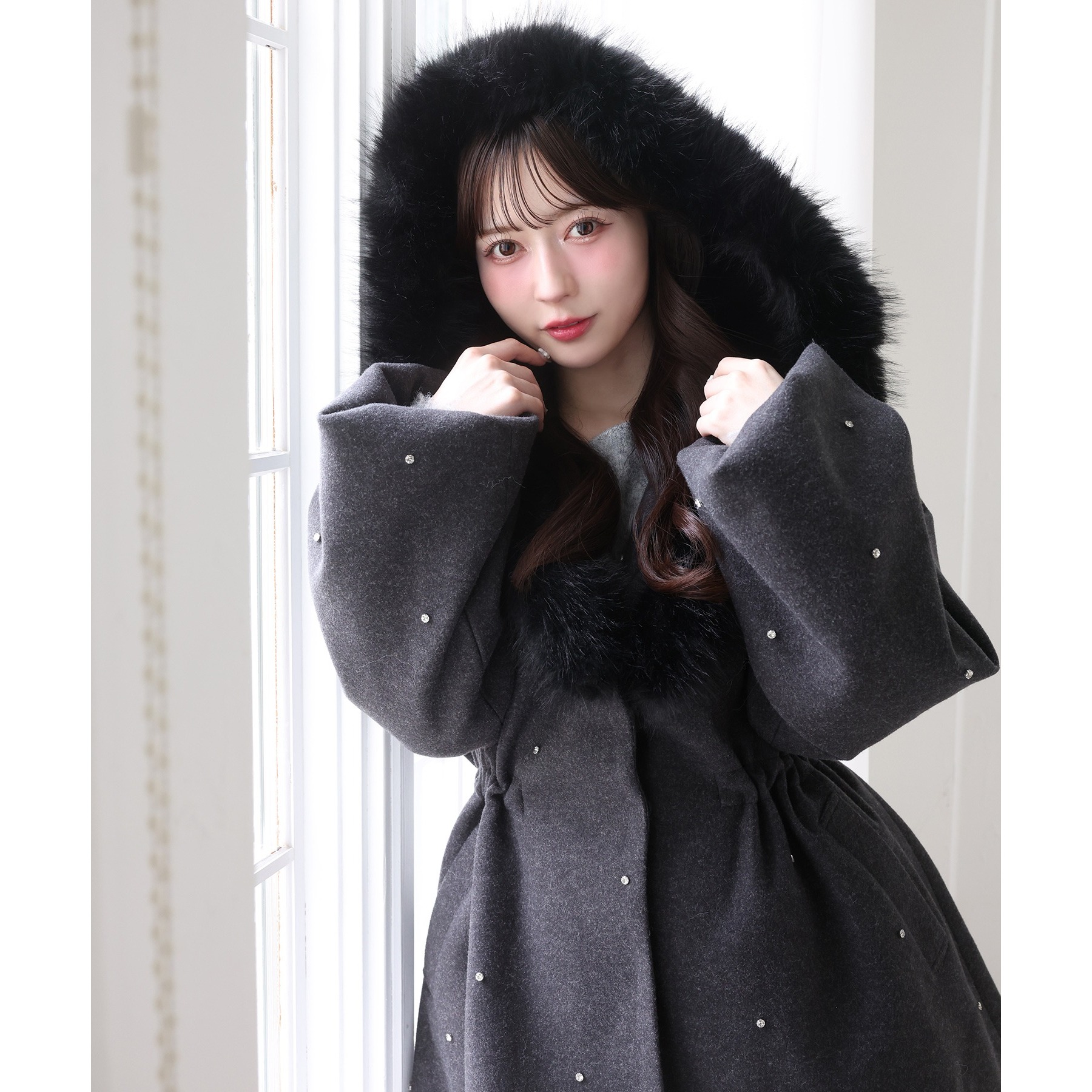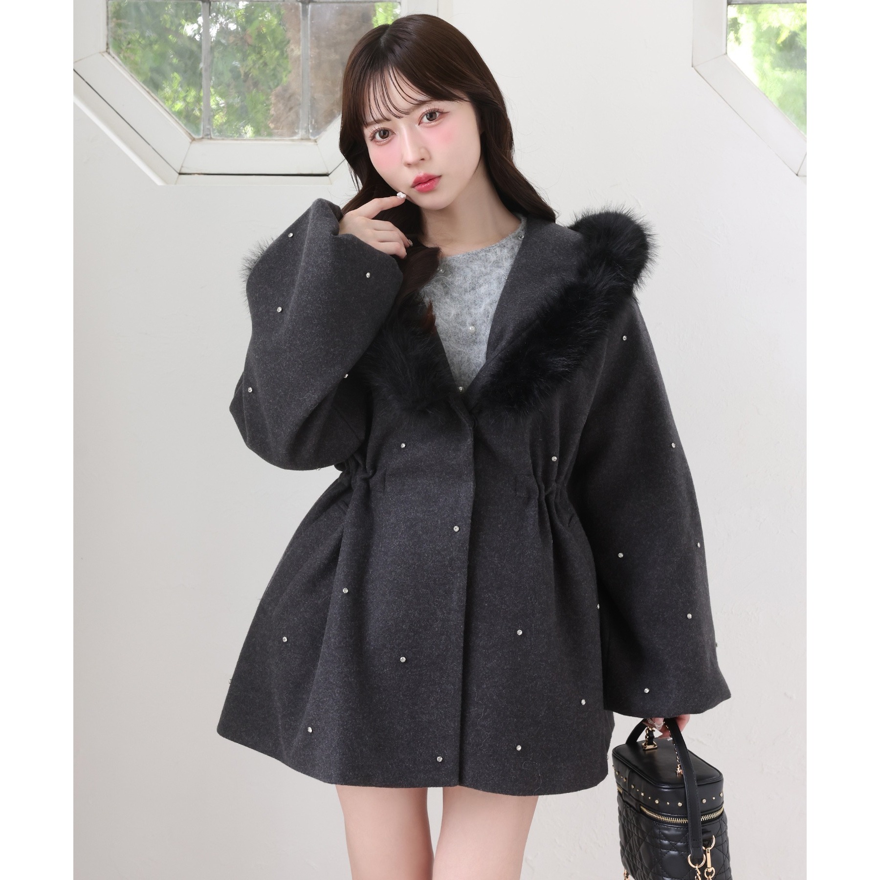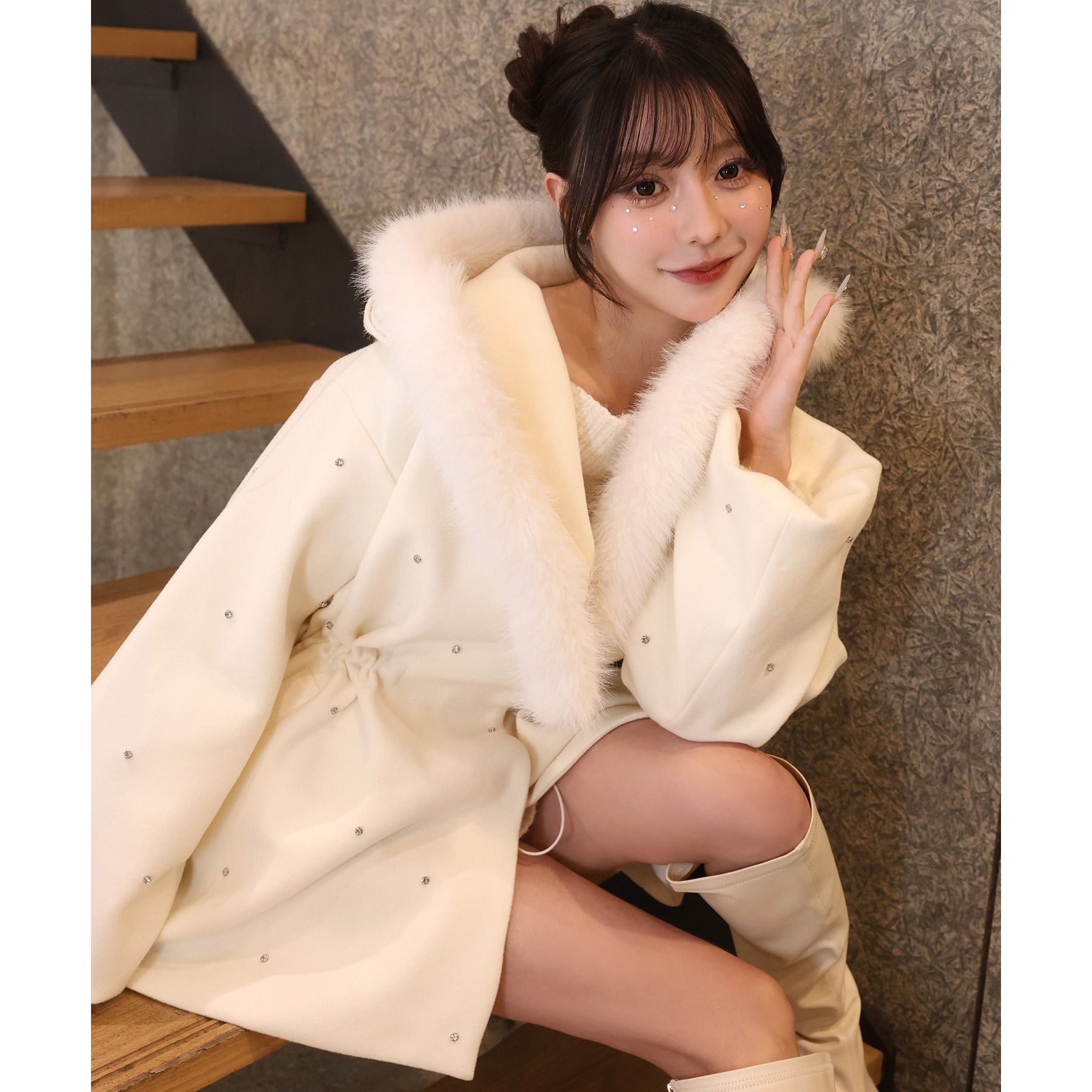 キラキラビジューが華やかさをプラスするミドル丈コート。