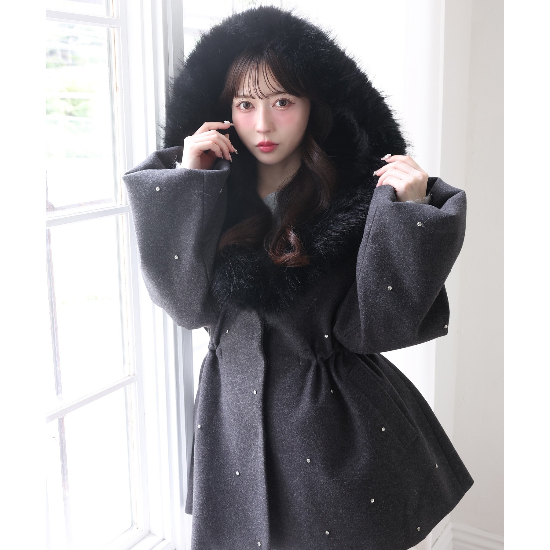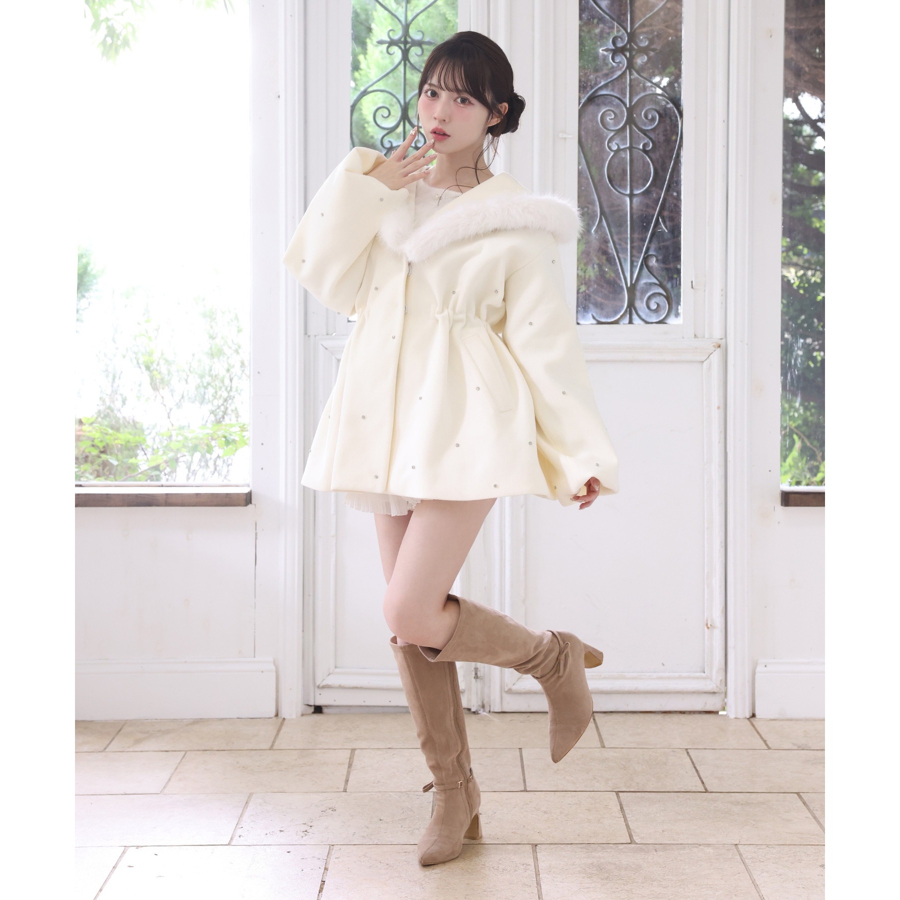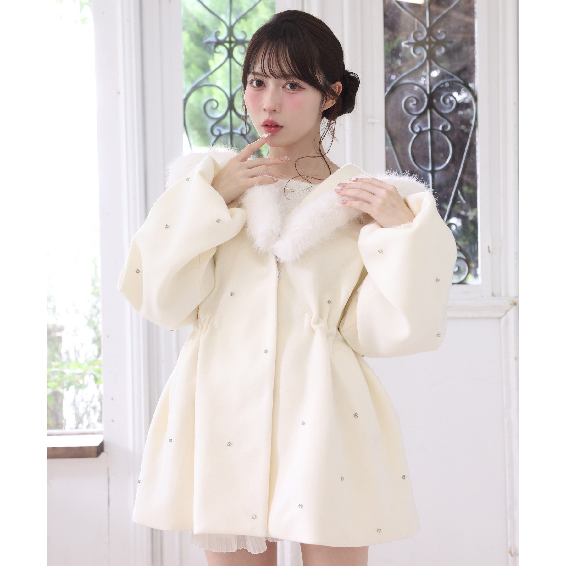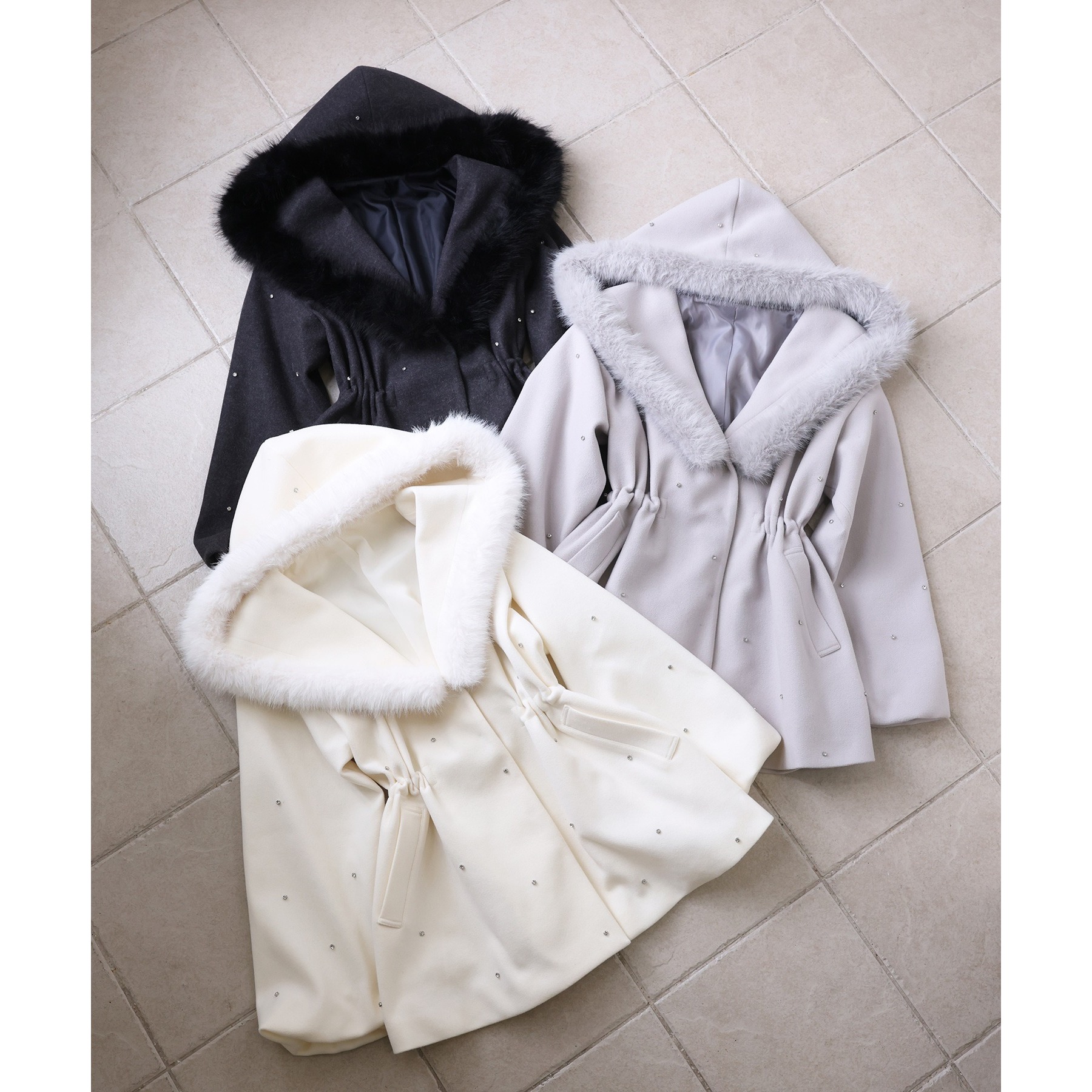 キラキラビジューが華やかさをプラスするミドル丈コート。