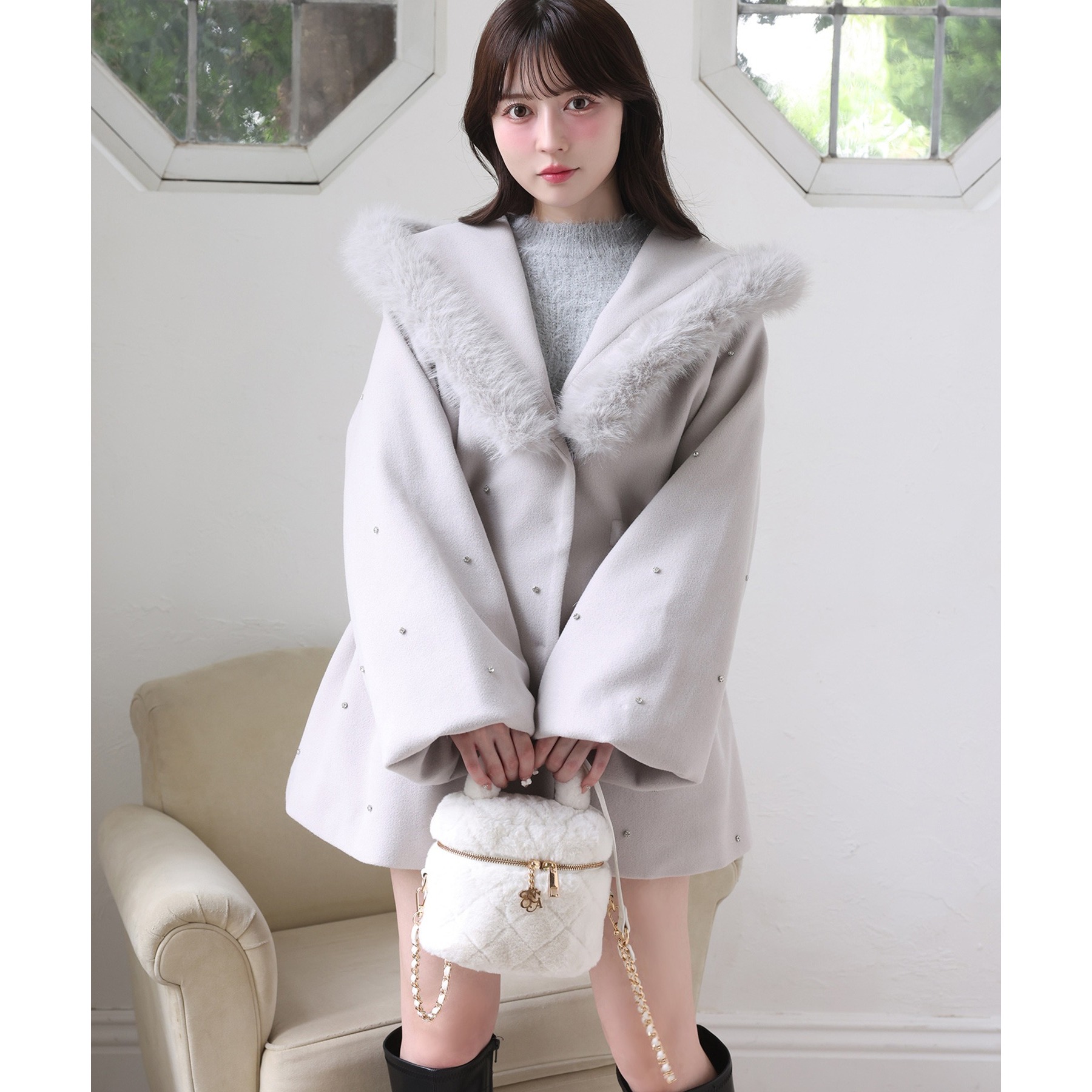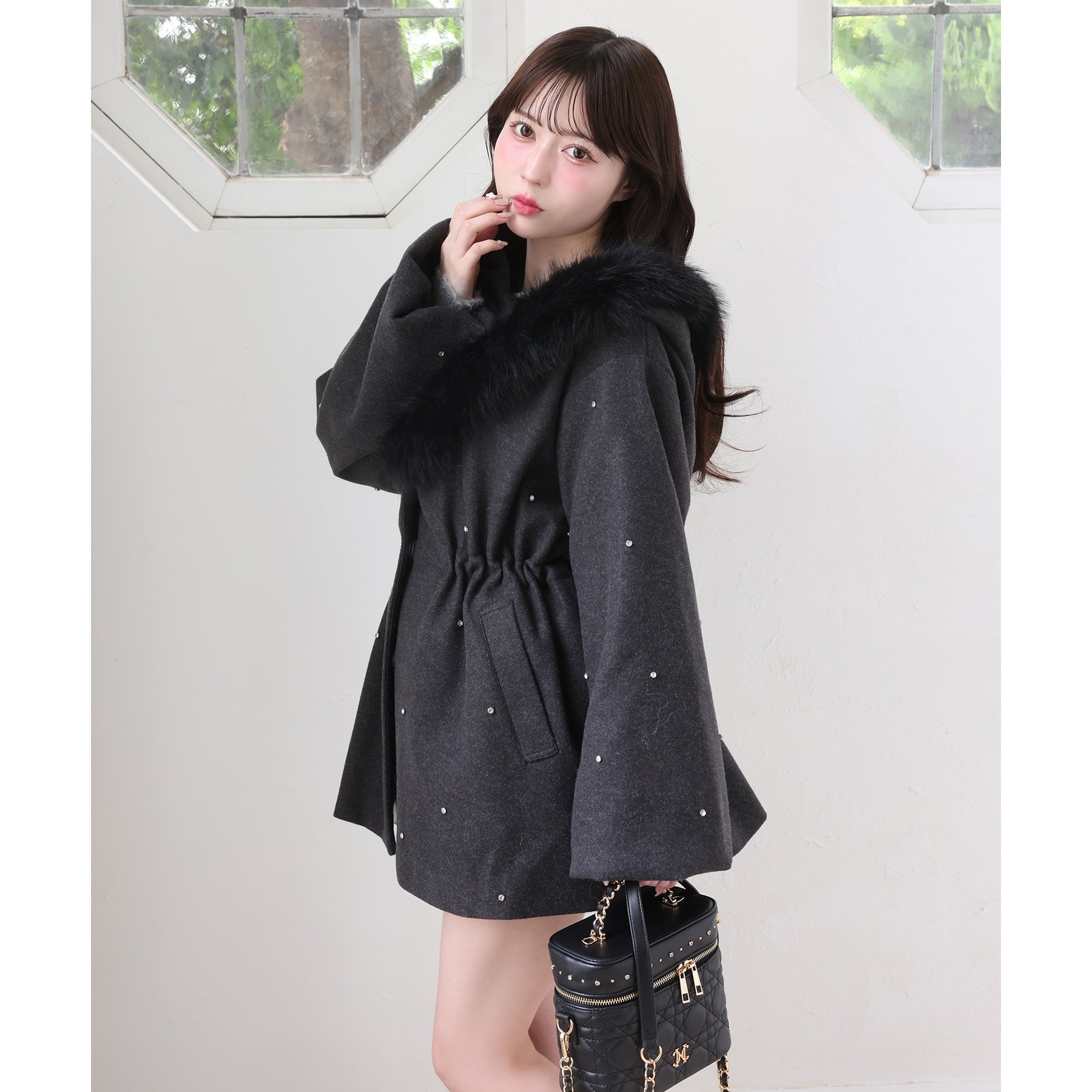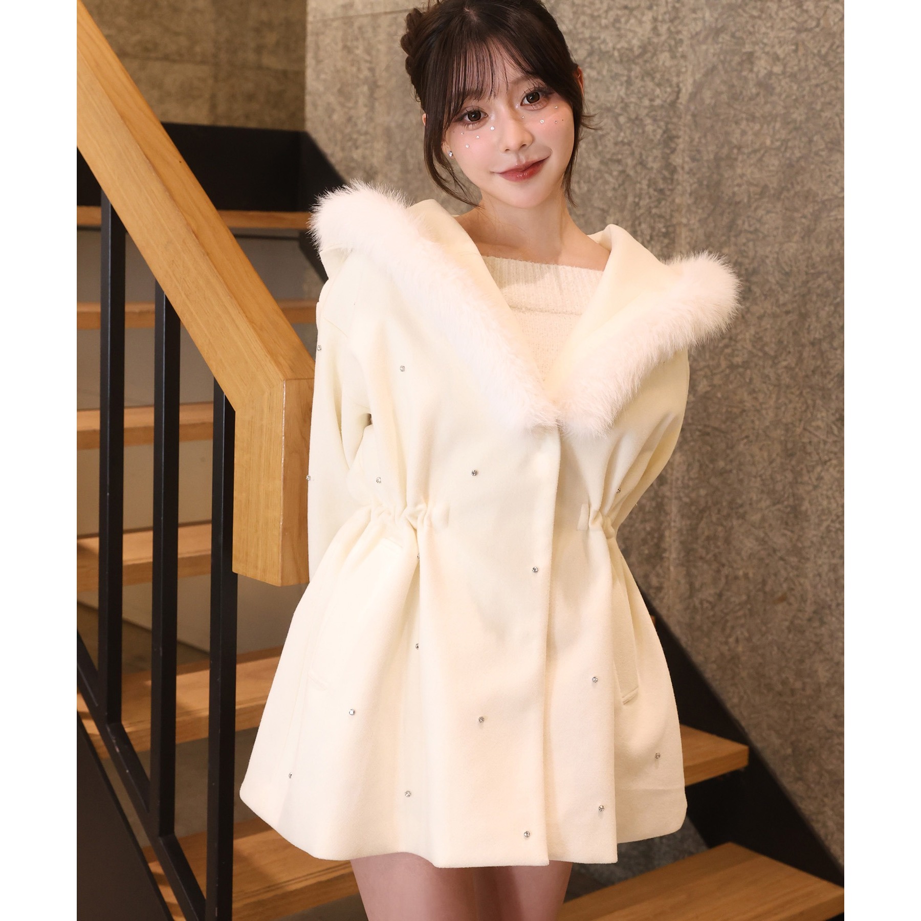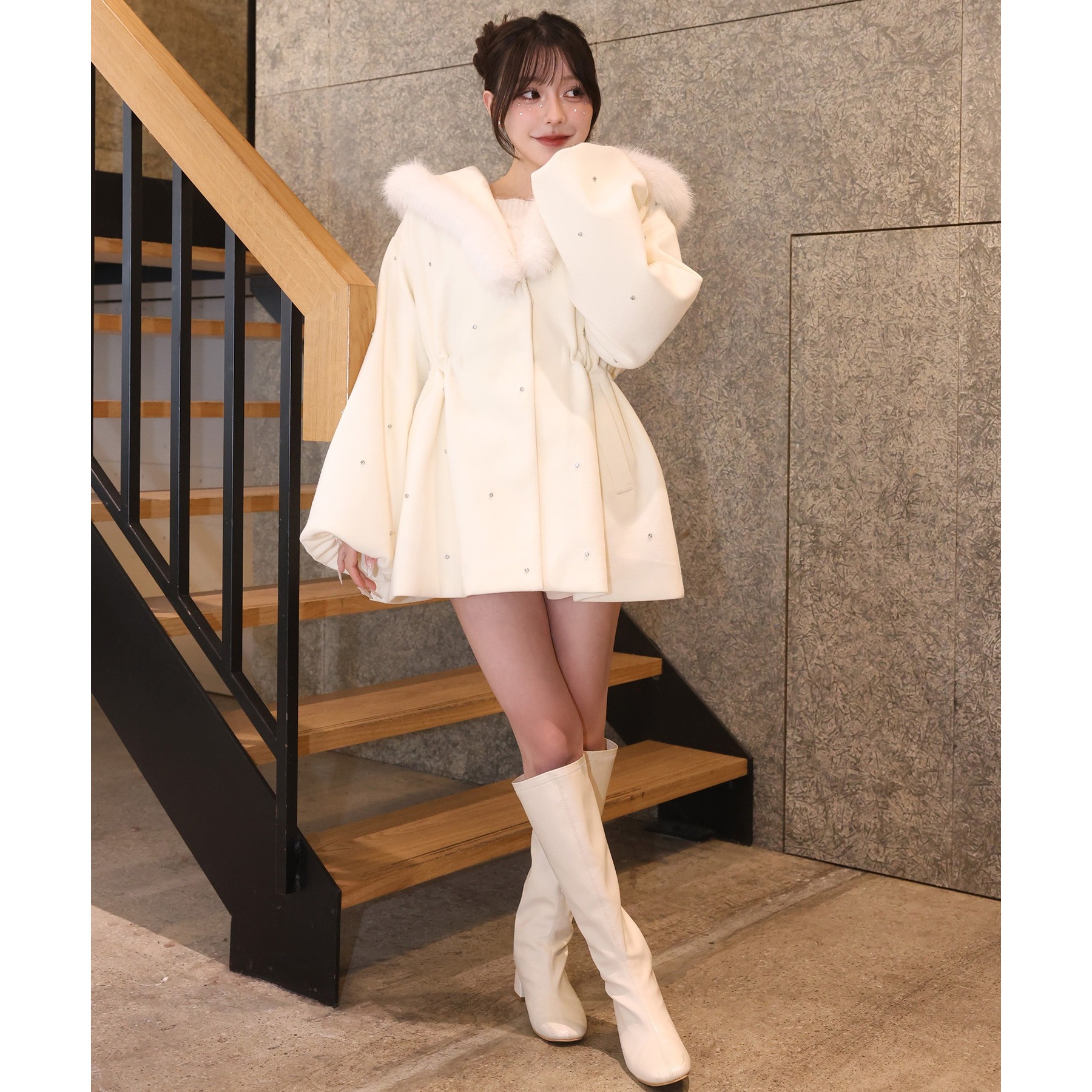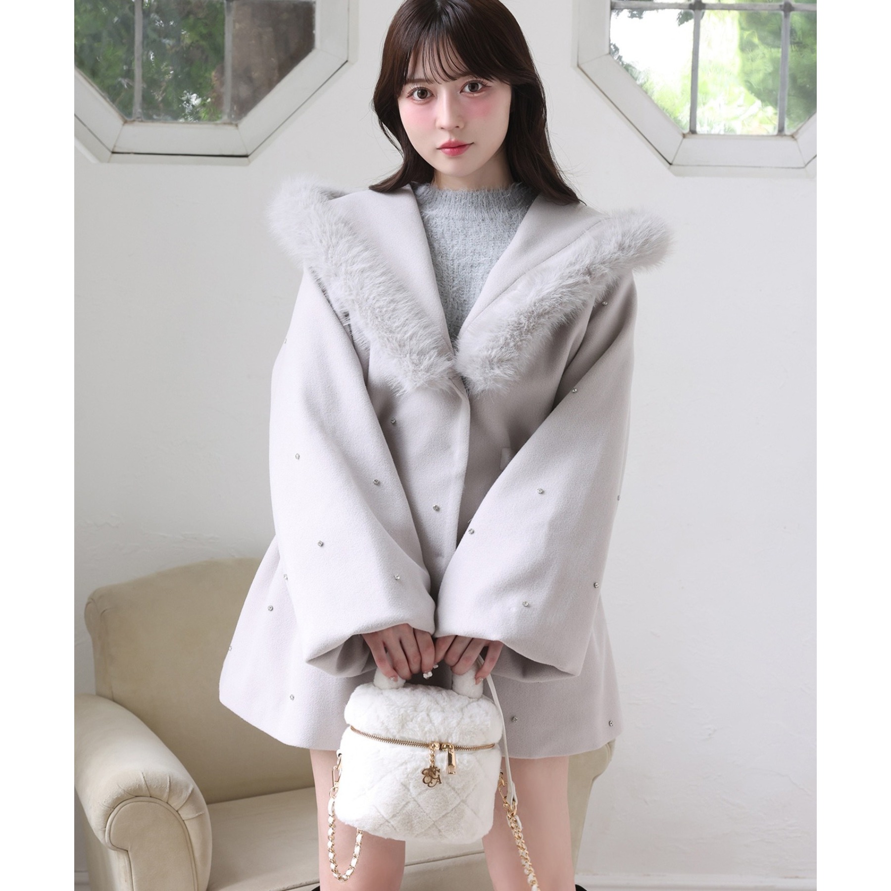 キラキラビジューが華やかさをプラスするミドル丈コート。