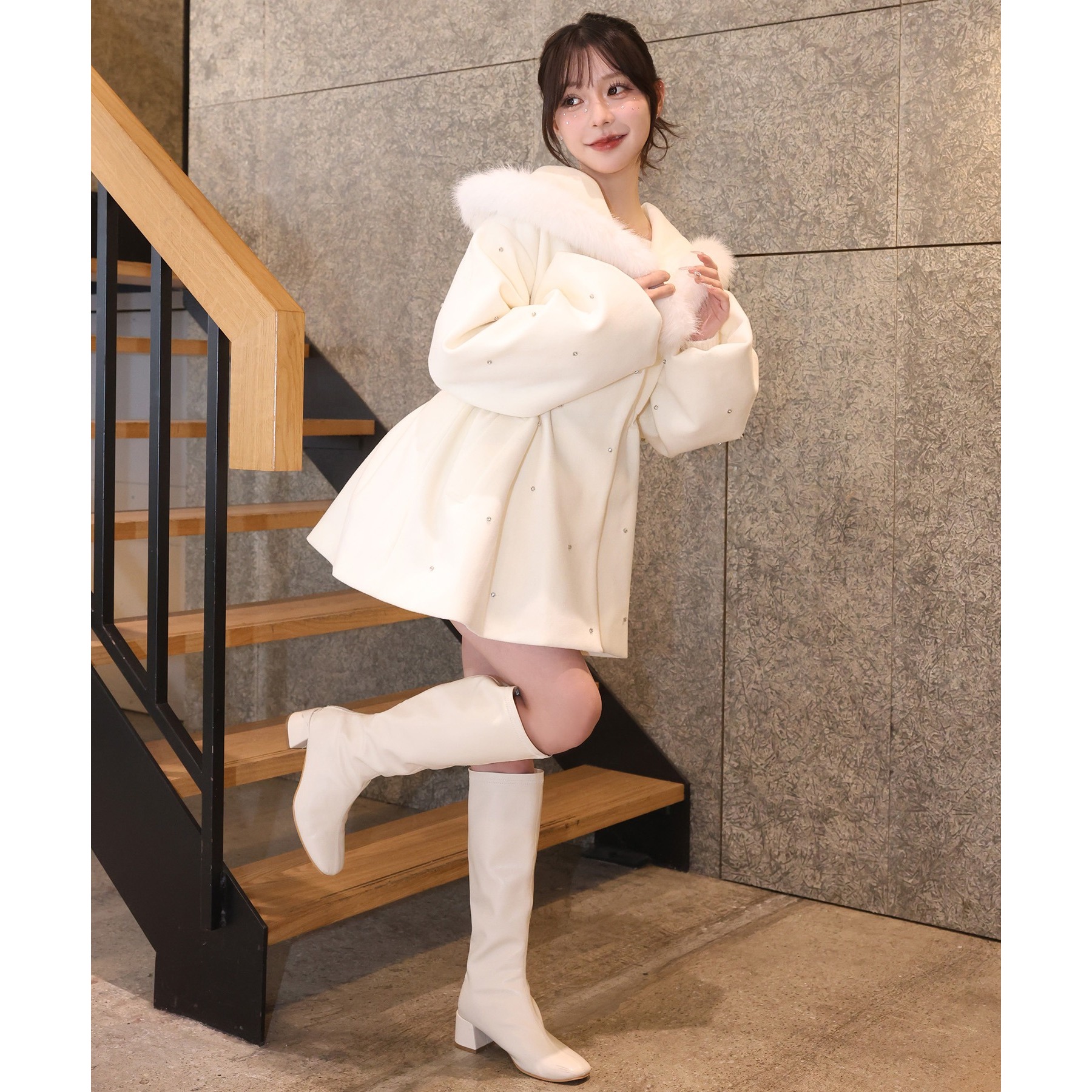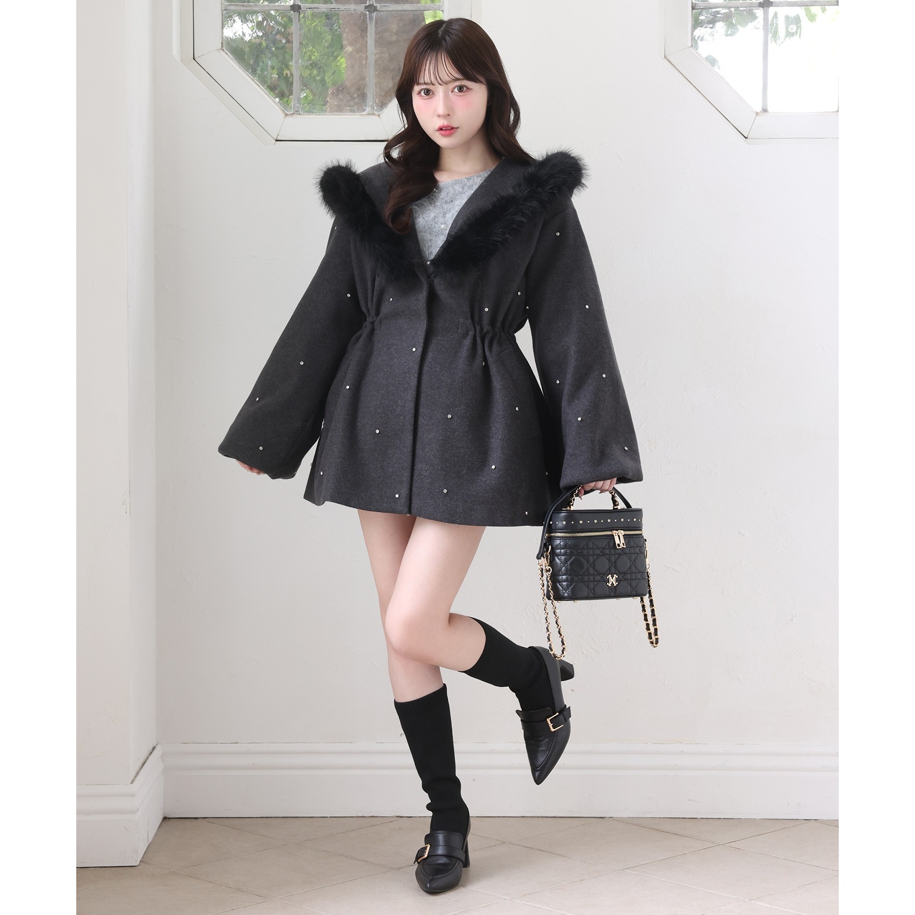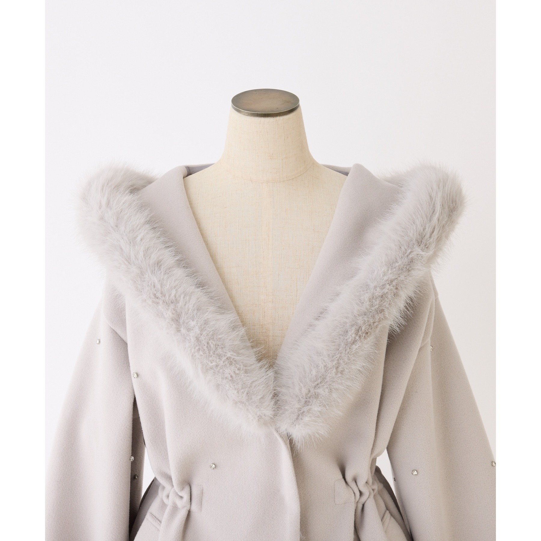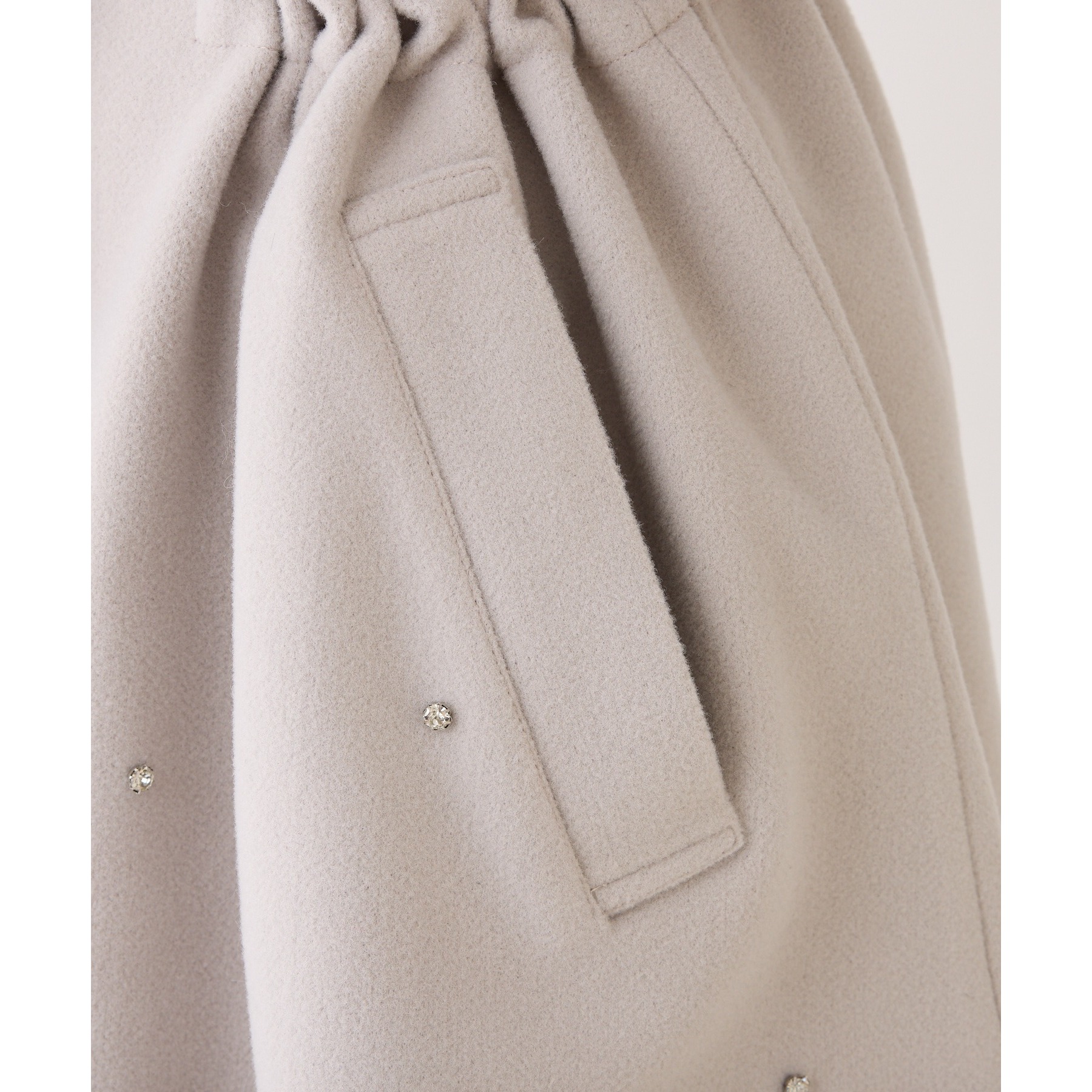 キラキラビジューが華やかさをプラスするミドル丈コート。