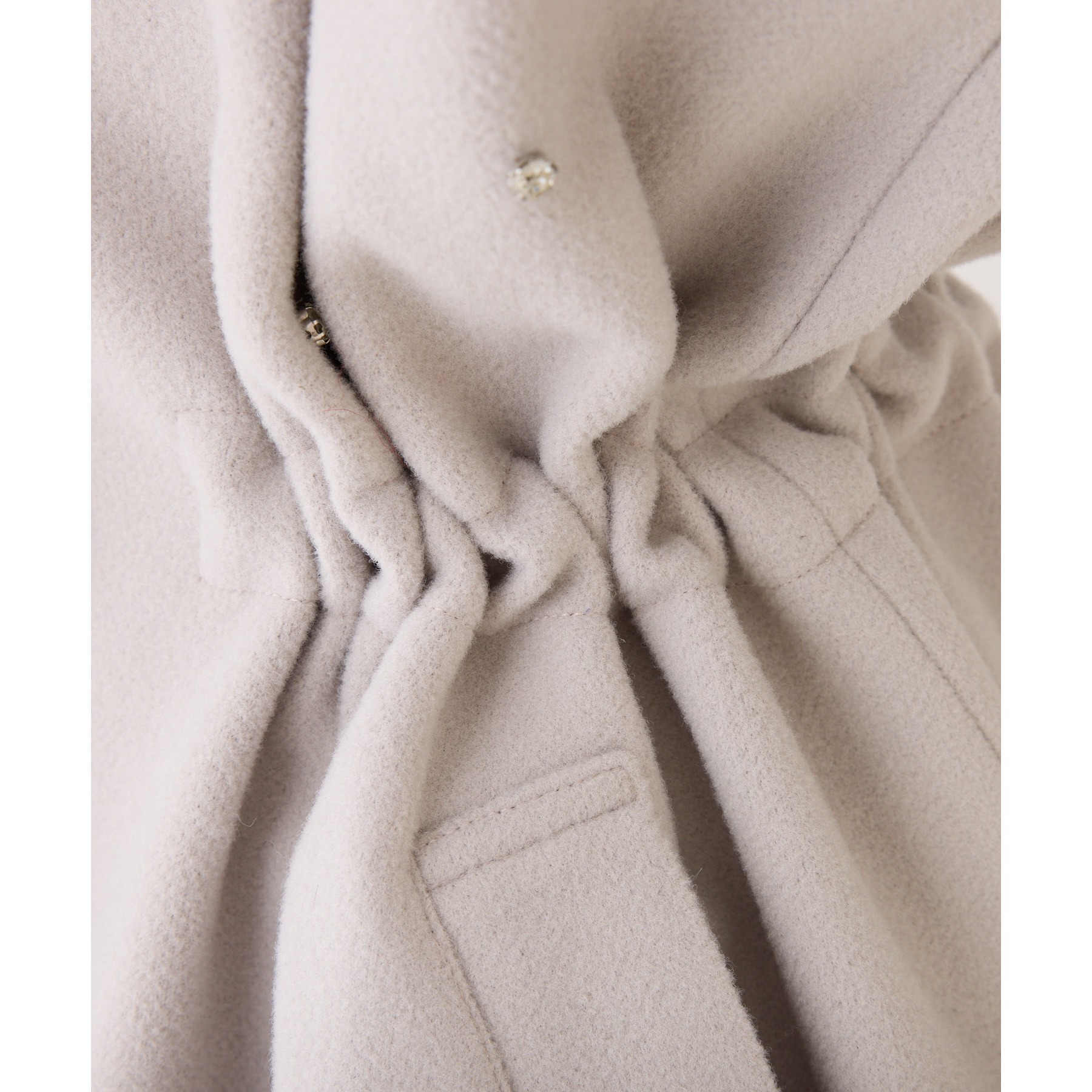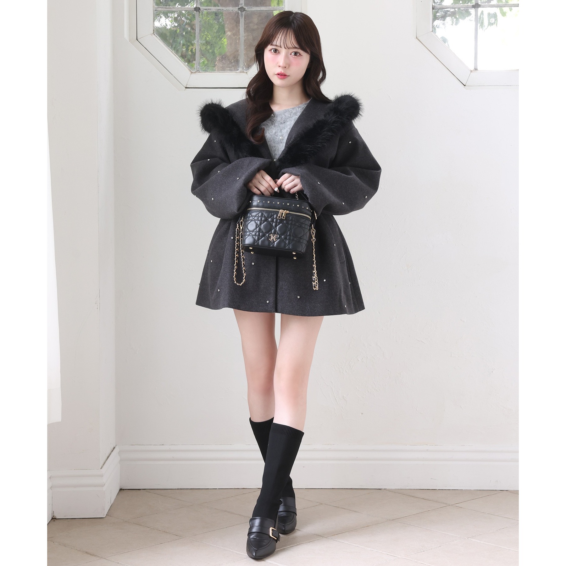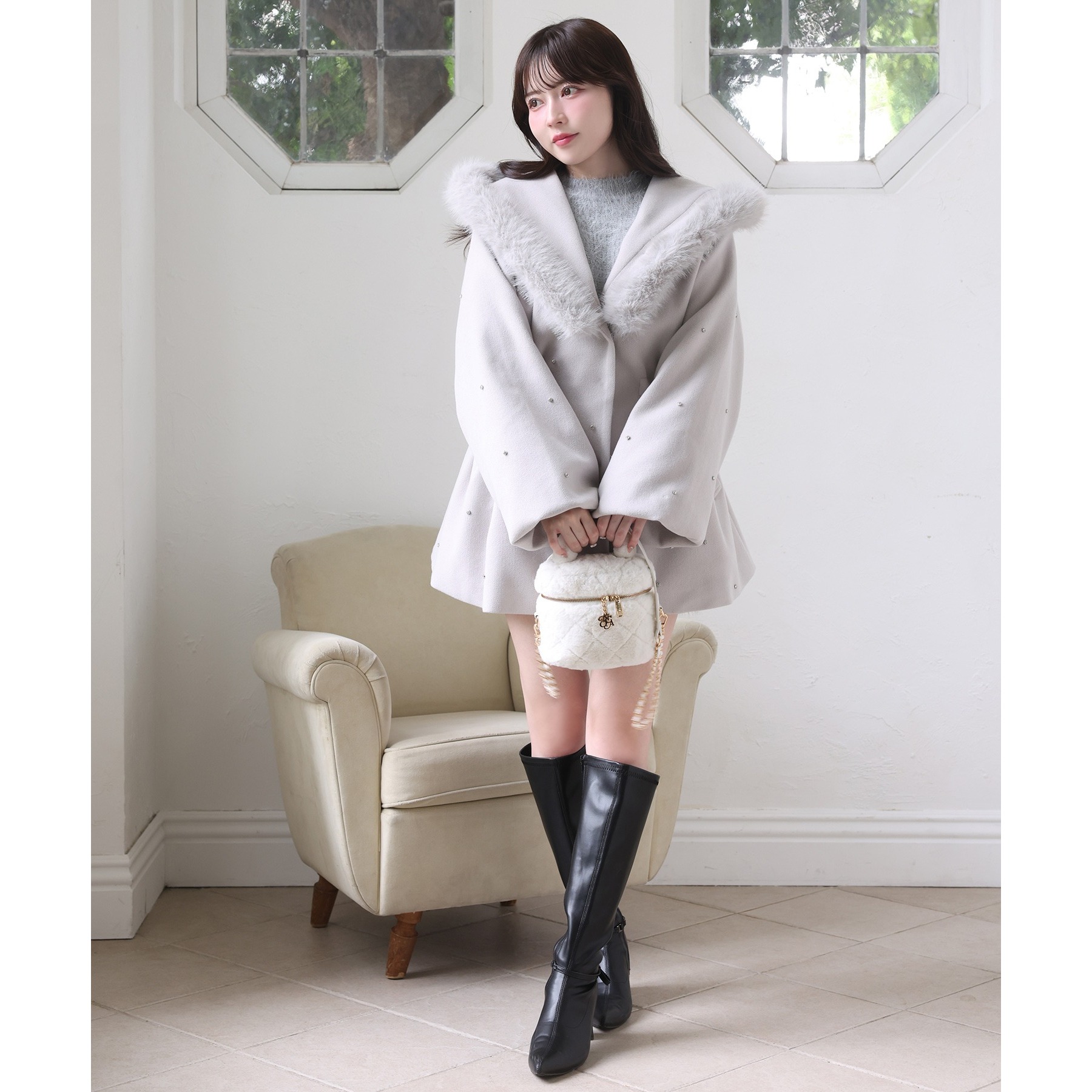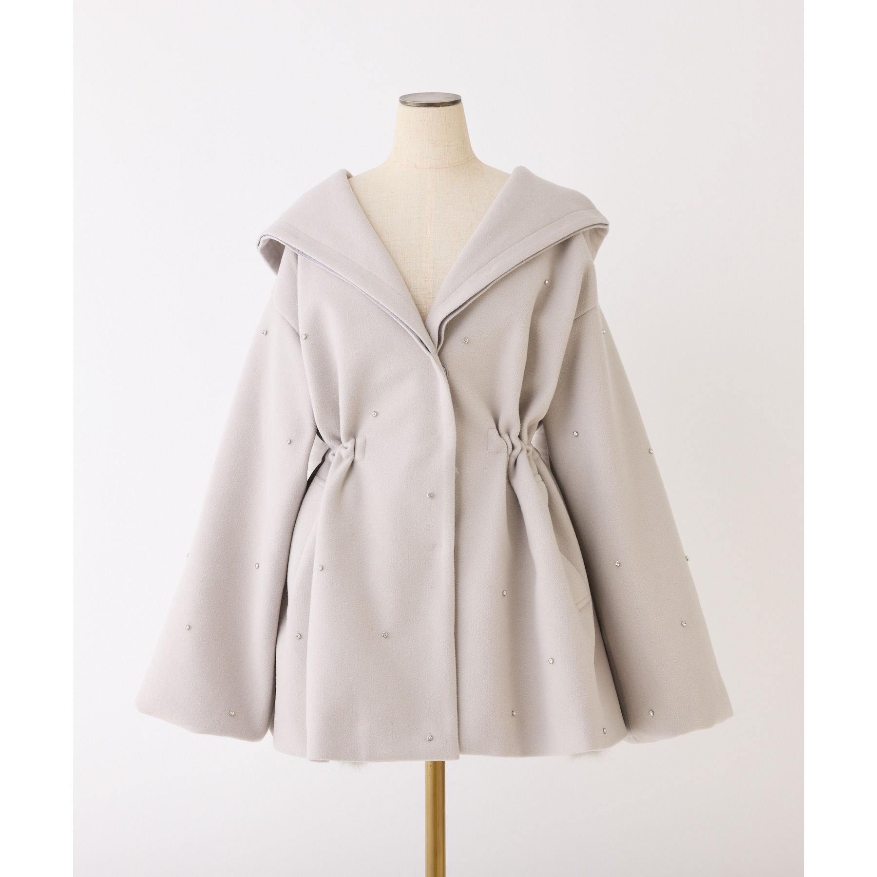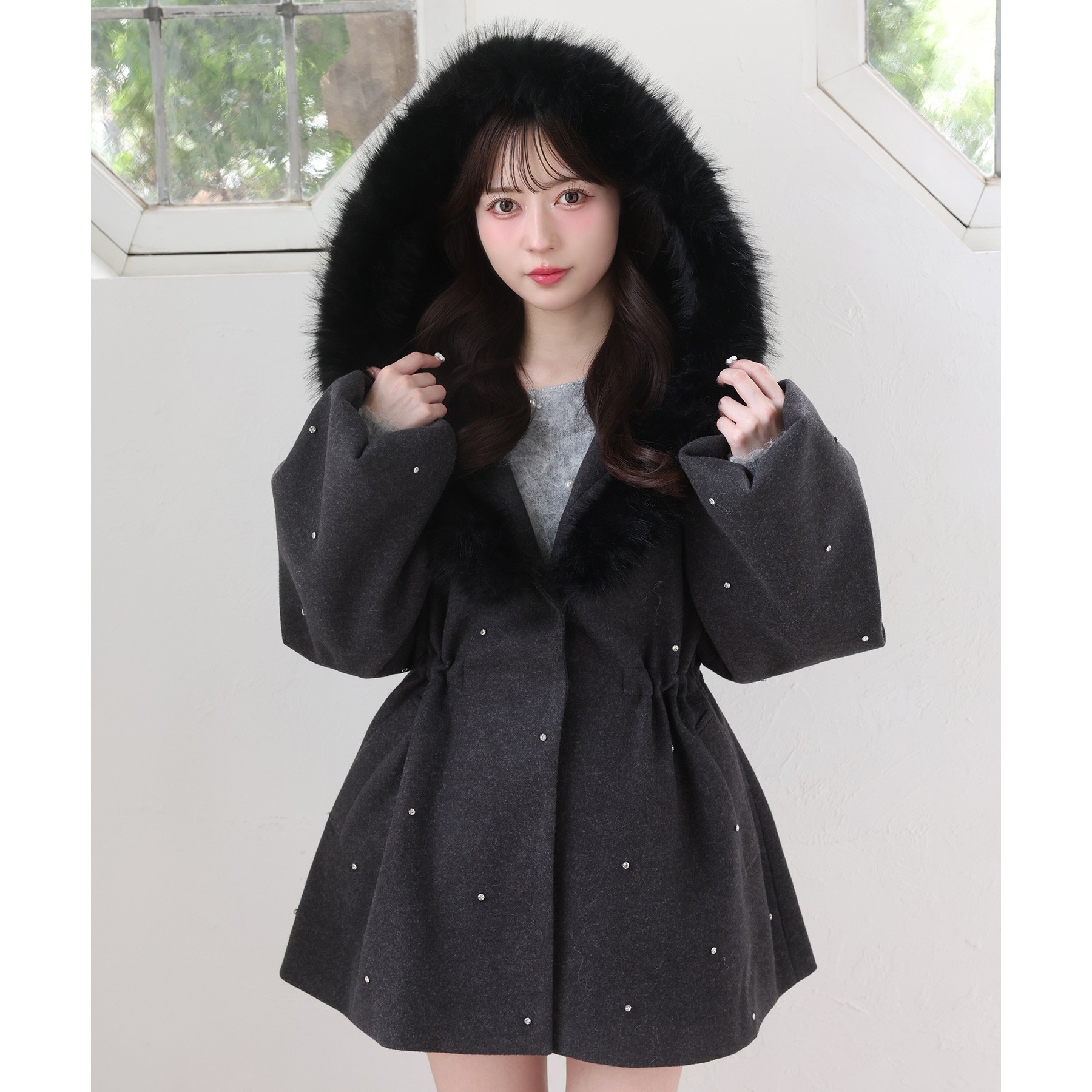 キラキラビジューが華やかさをプラスするミドル丈コート。
