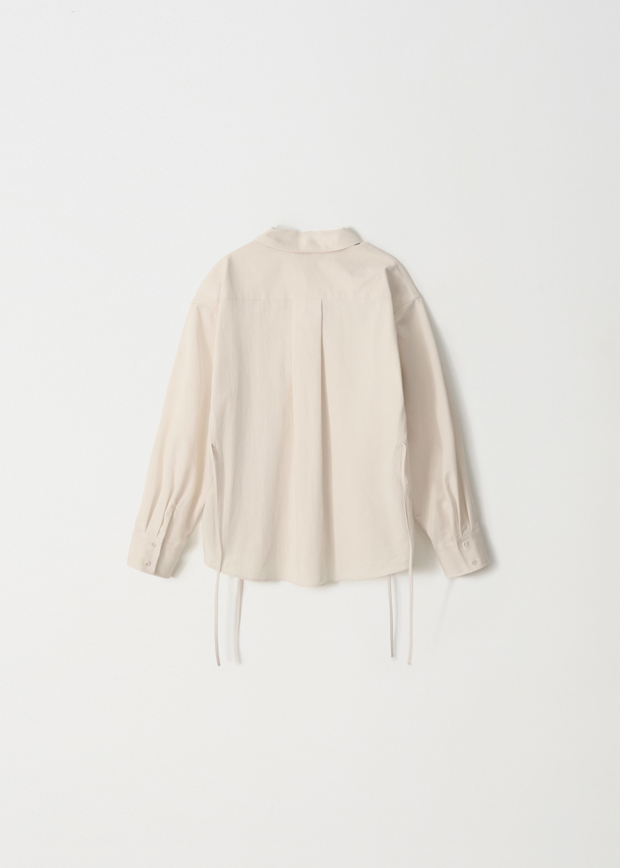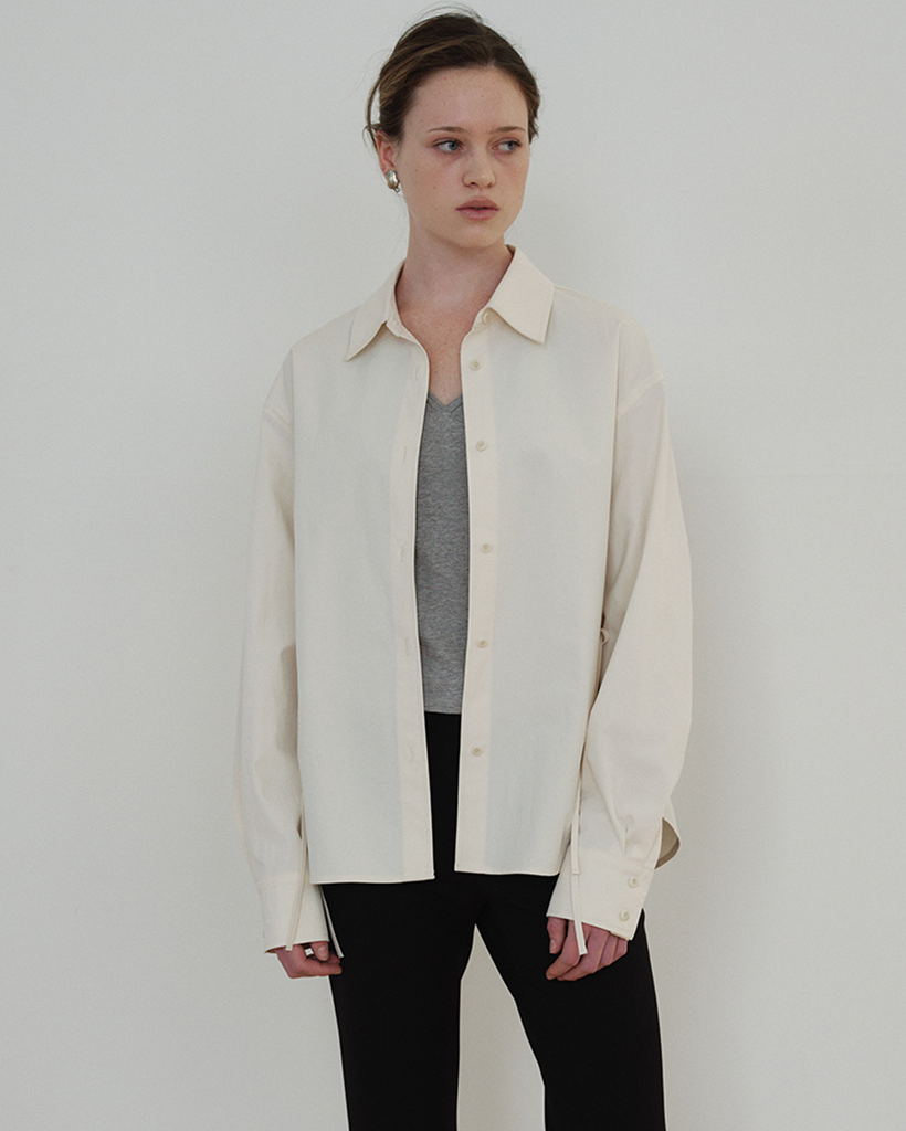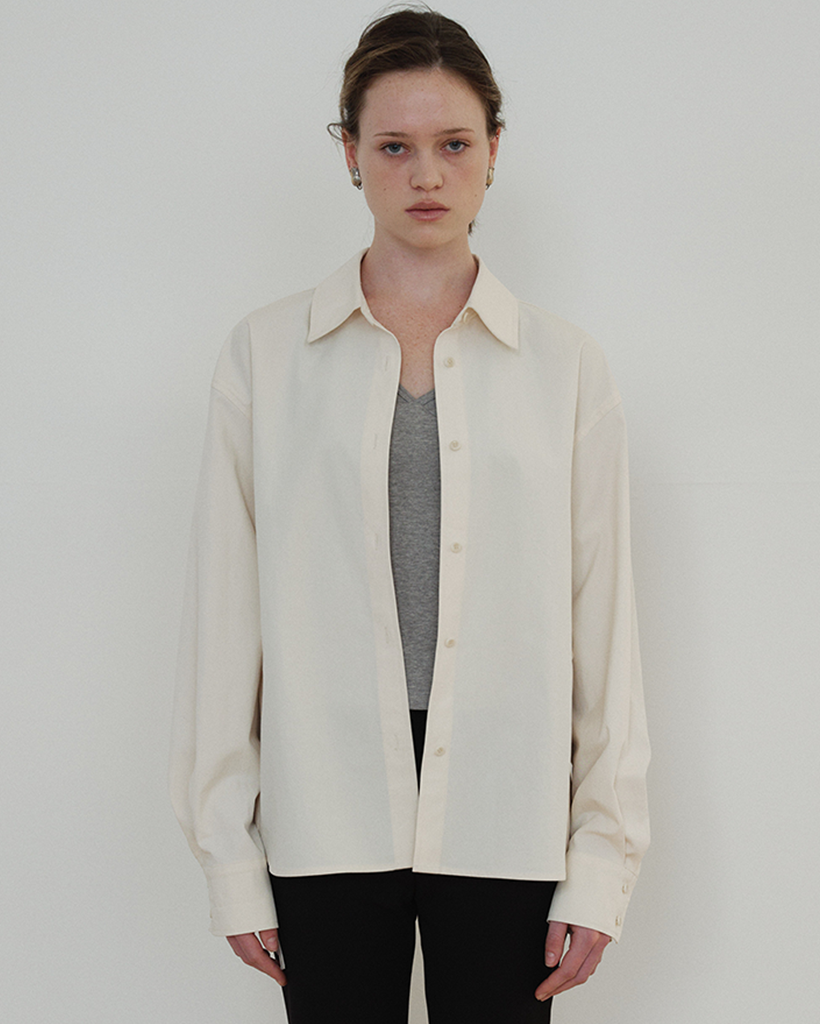 コットンの柔らかさとポリのハリ感をバランスよくミックスした素材で仕立てたシャツです。光沢のないドライなテクスチャーと密度のある組織が、端正で安定したシルエットをキープします。軽やかな厚みで、季節の変わり目の単体着用はもちろん、インナー/アウターのスタイリングにも適しています。
