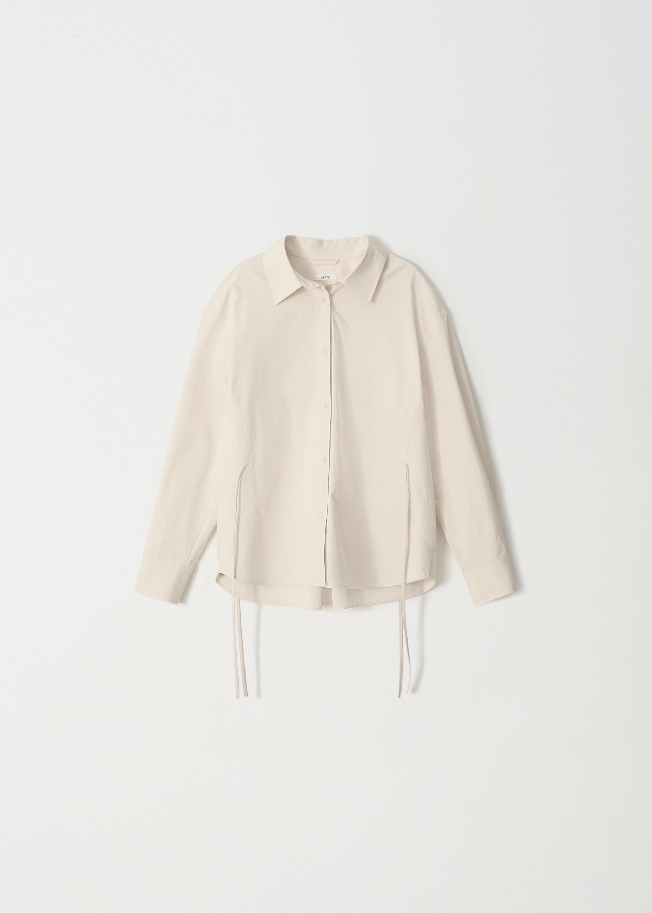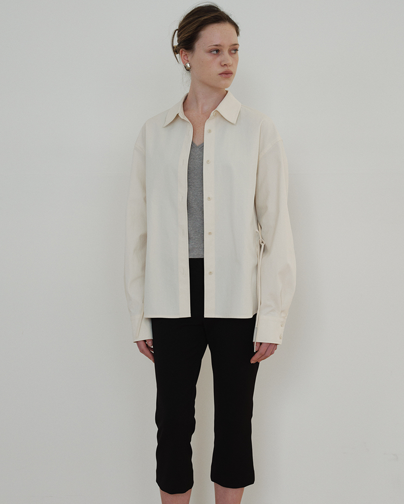 両サイドには同素材のストラップが自然につながっており、リボンのように結んだり垂らしたりとさまざまなムードでスタイリングできます。スラックス、デニム、スカートなど幅広いボトムともバランスよく馴染む、シーズンレスなアイテムです。
