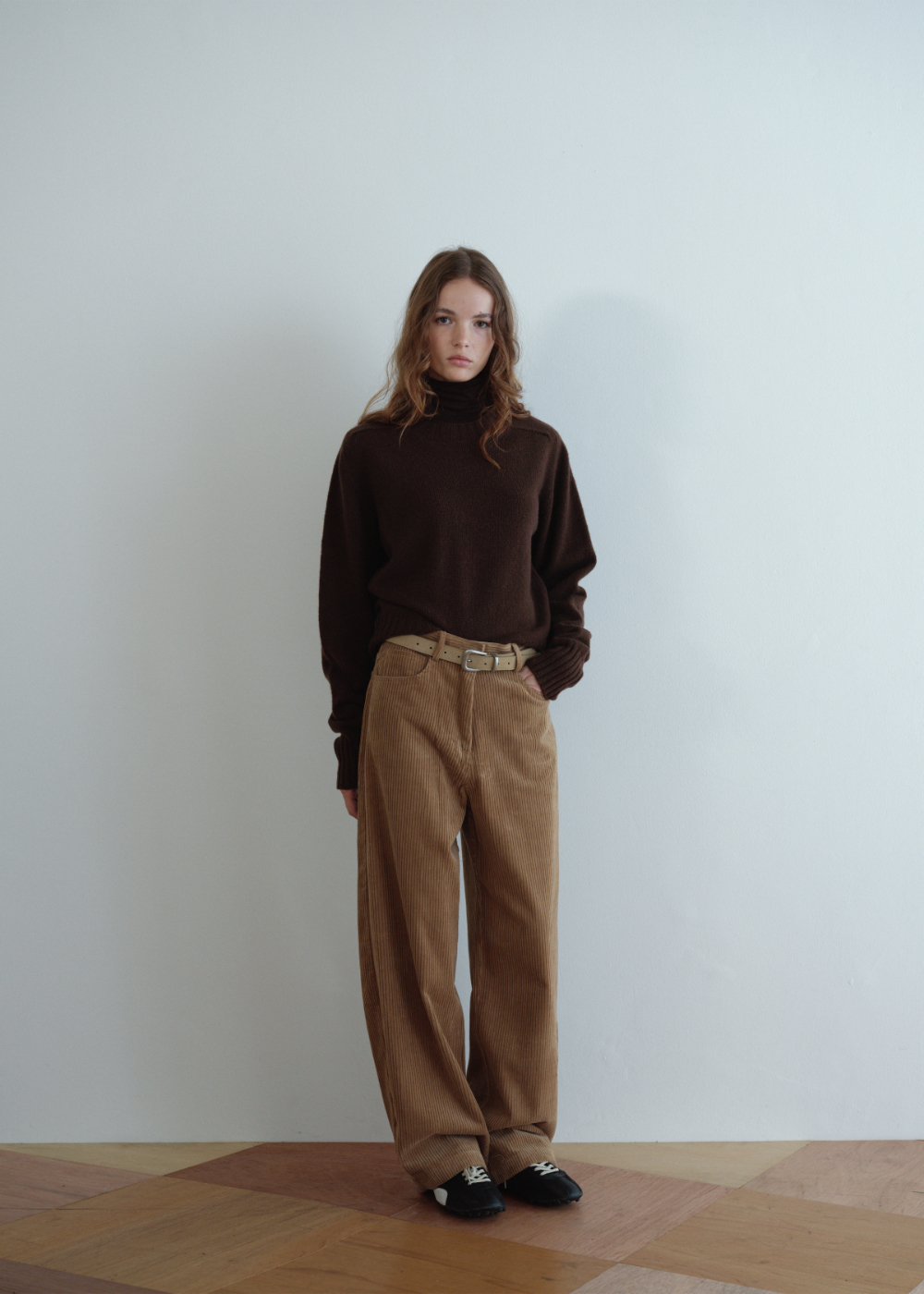 すっきりと落ちるストレートフィットがレッグラインをきれいに整え、甲にかかるロング丈が全体のシルエットバランスを引き締めます。ウエストはゴム仕様ではなく、フックとYKKジッパーで安定感のある仕様に。サイドポケットとヒップポケットを備え、実用性にも配慮しました。