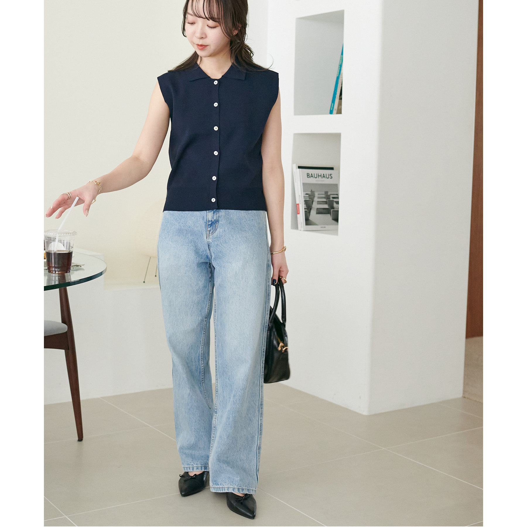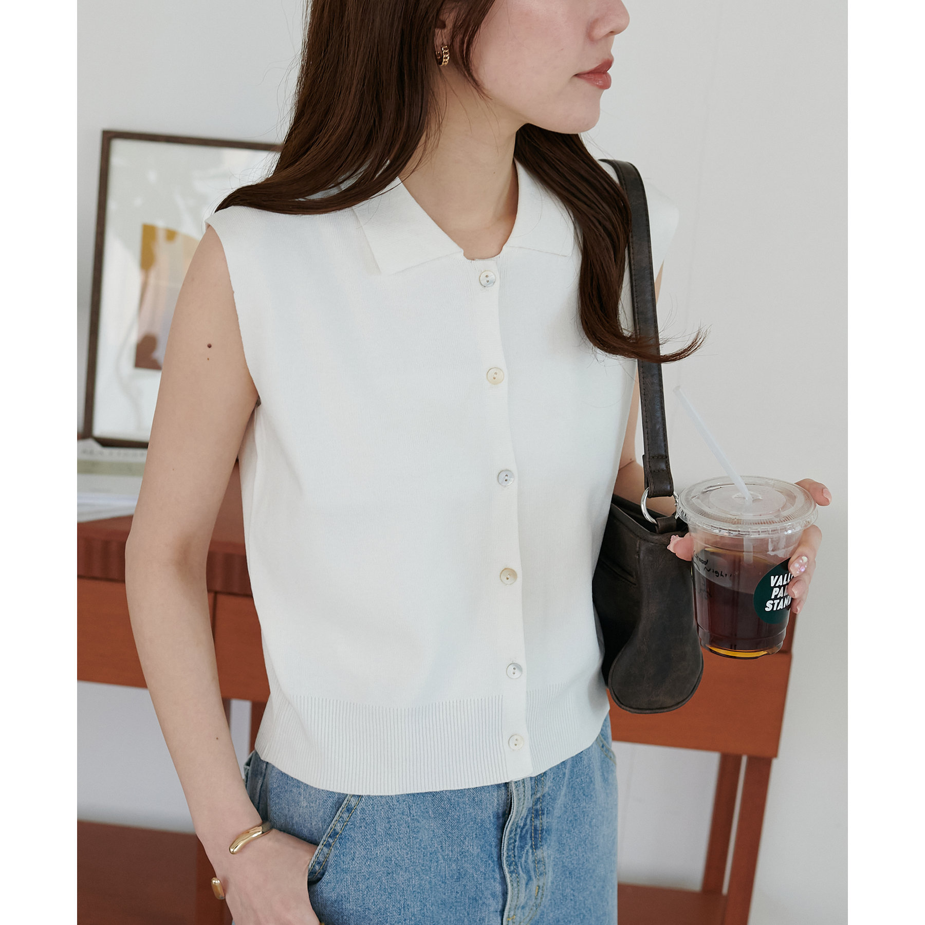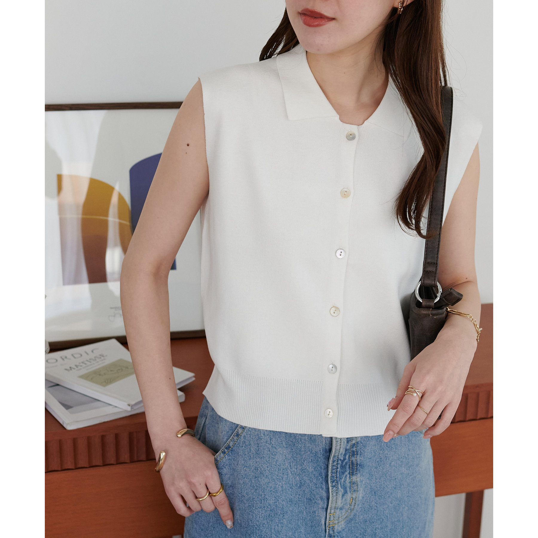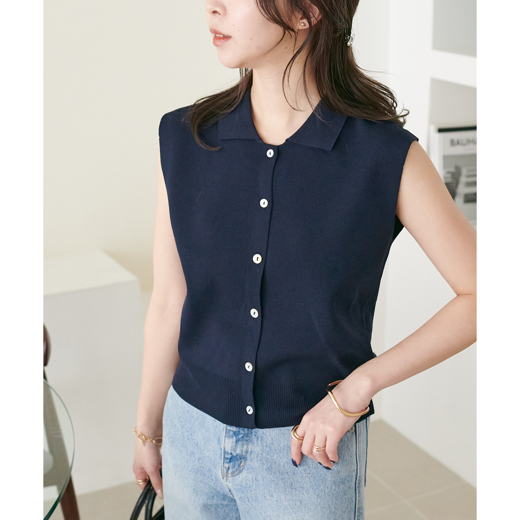 襟付きのデザインになっていることで、キレイメな印象になるのでデニムと合わせた大人カジュアルなコーデに取り入れたいです!