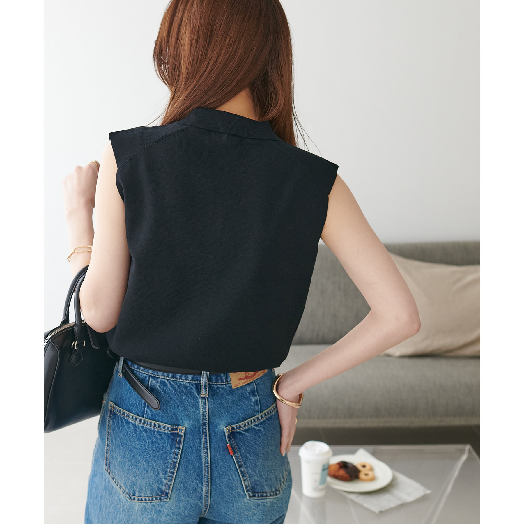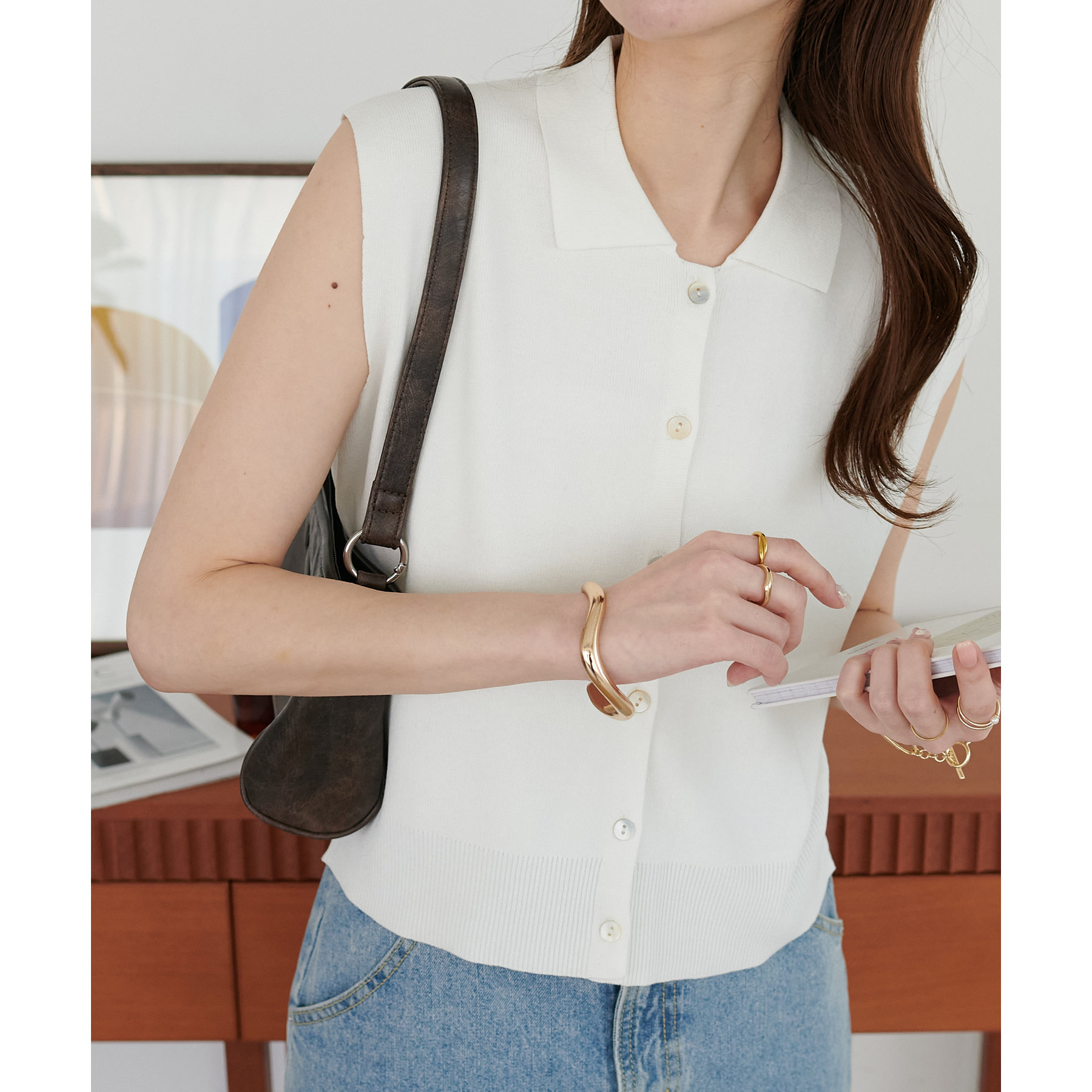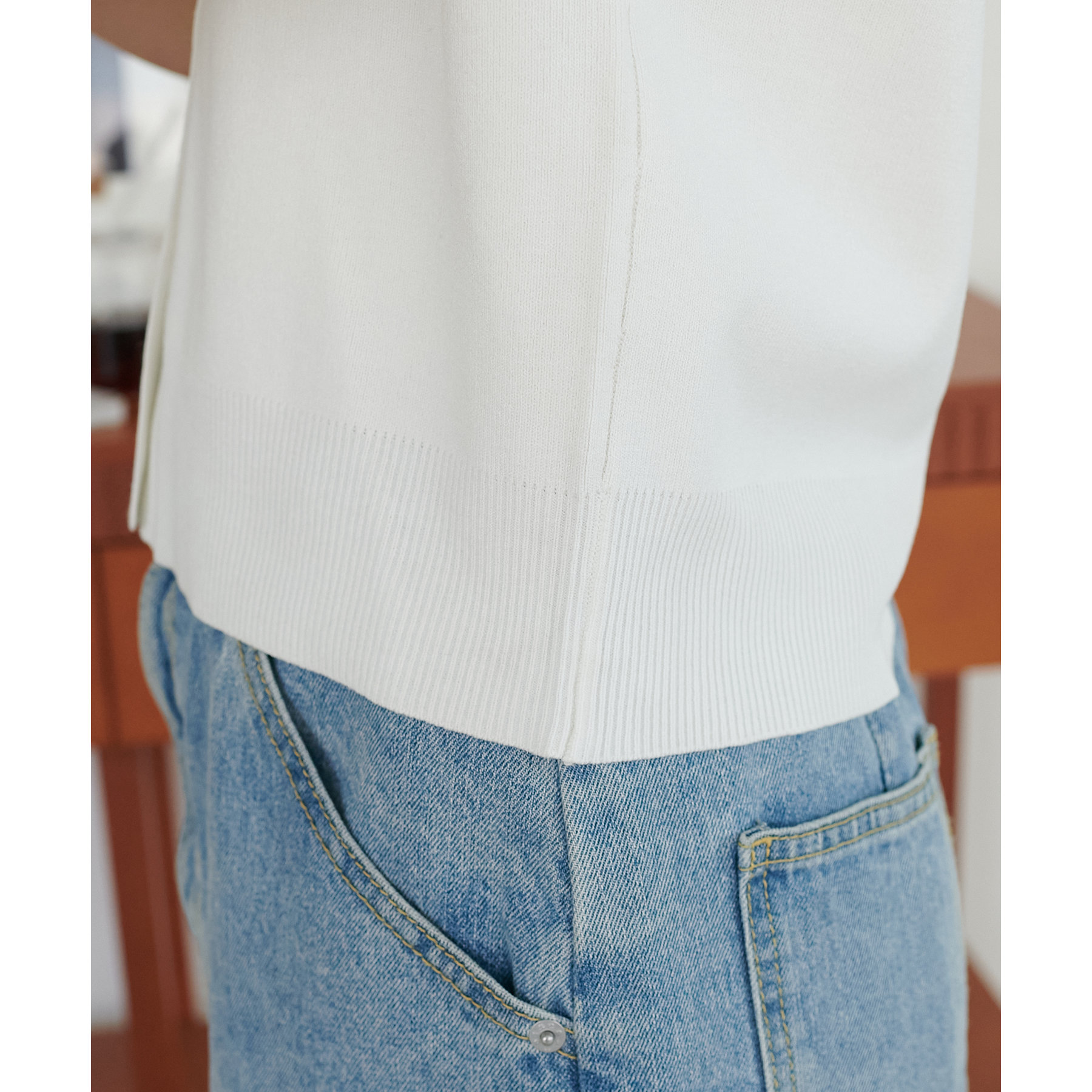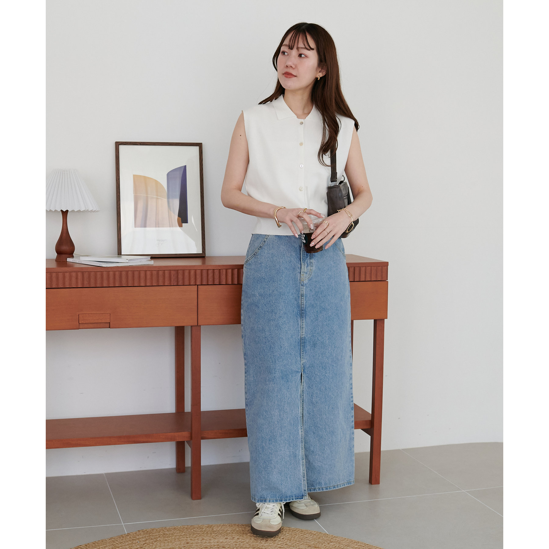 襟付きのデザインになっていることで、キレイメな印象になるのでデニムと合わせた大人カジュアルなコーデに取り入れたいです!