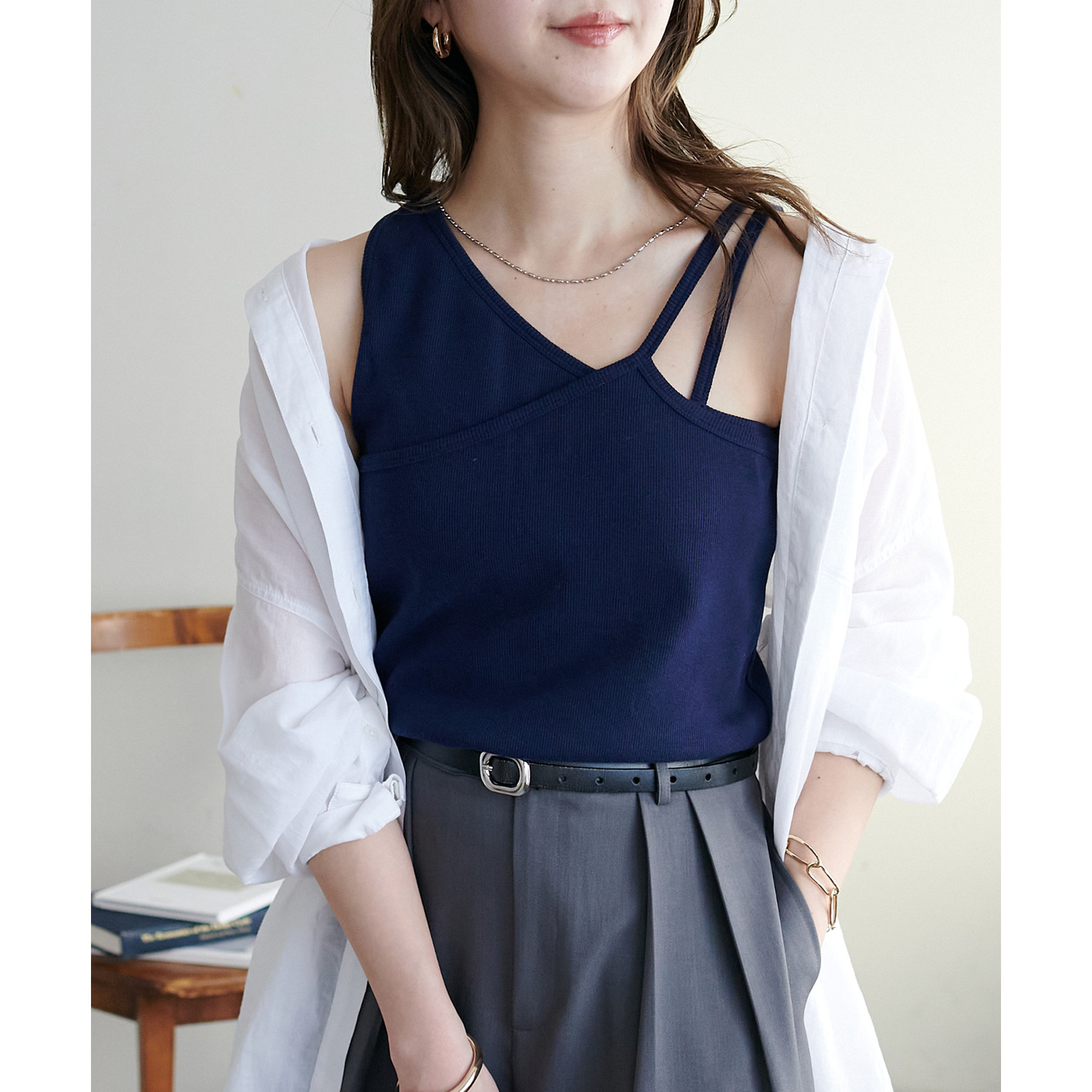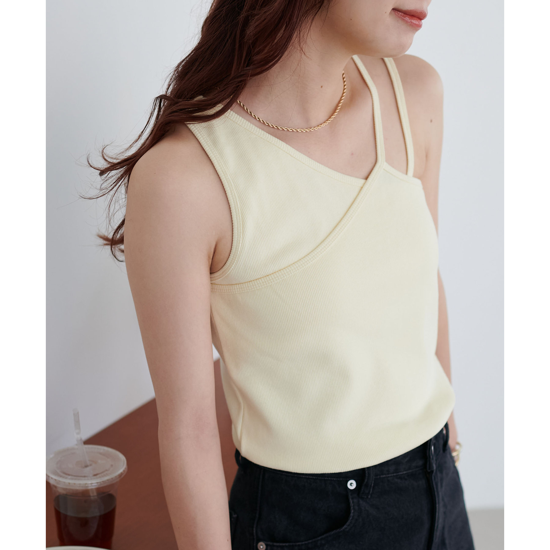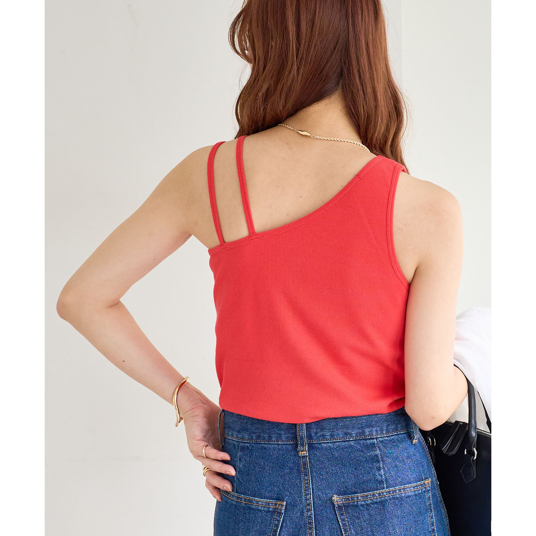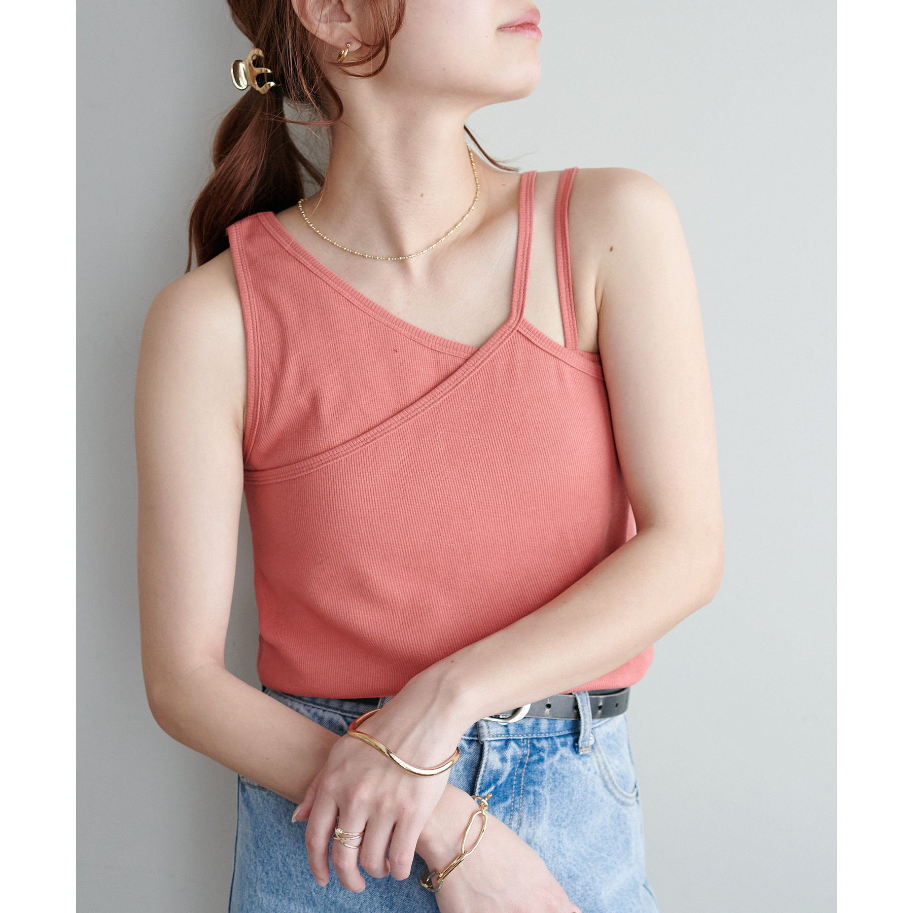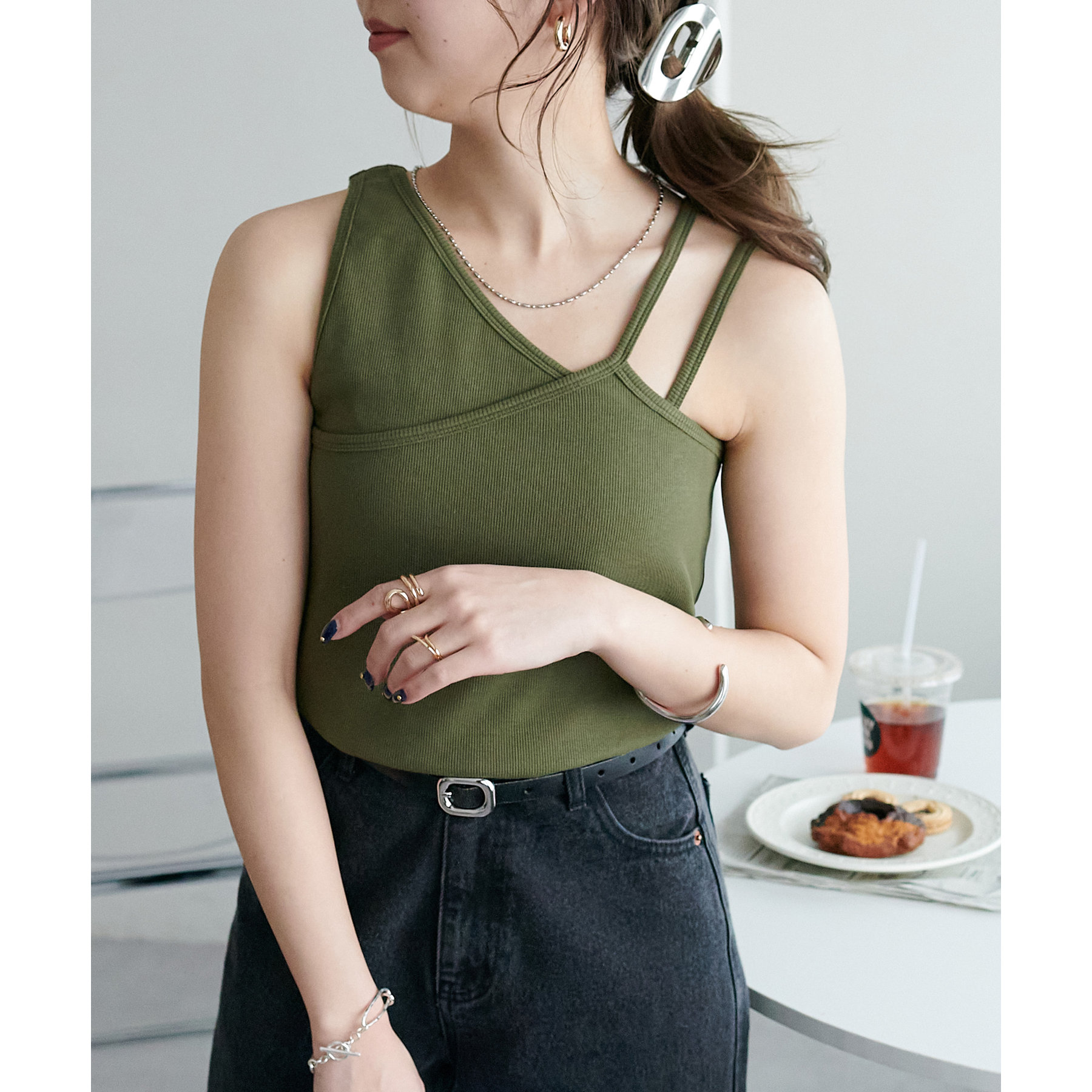 ・ワンショル×ダブルストラップのレイヤード風デザインが目を惹くカップ付きタンクトップ
