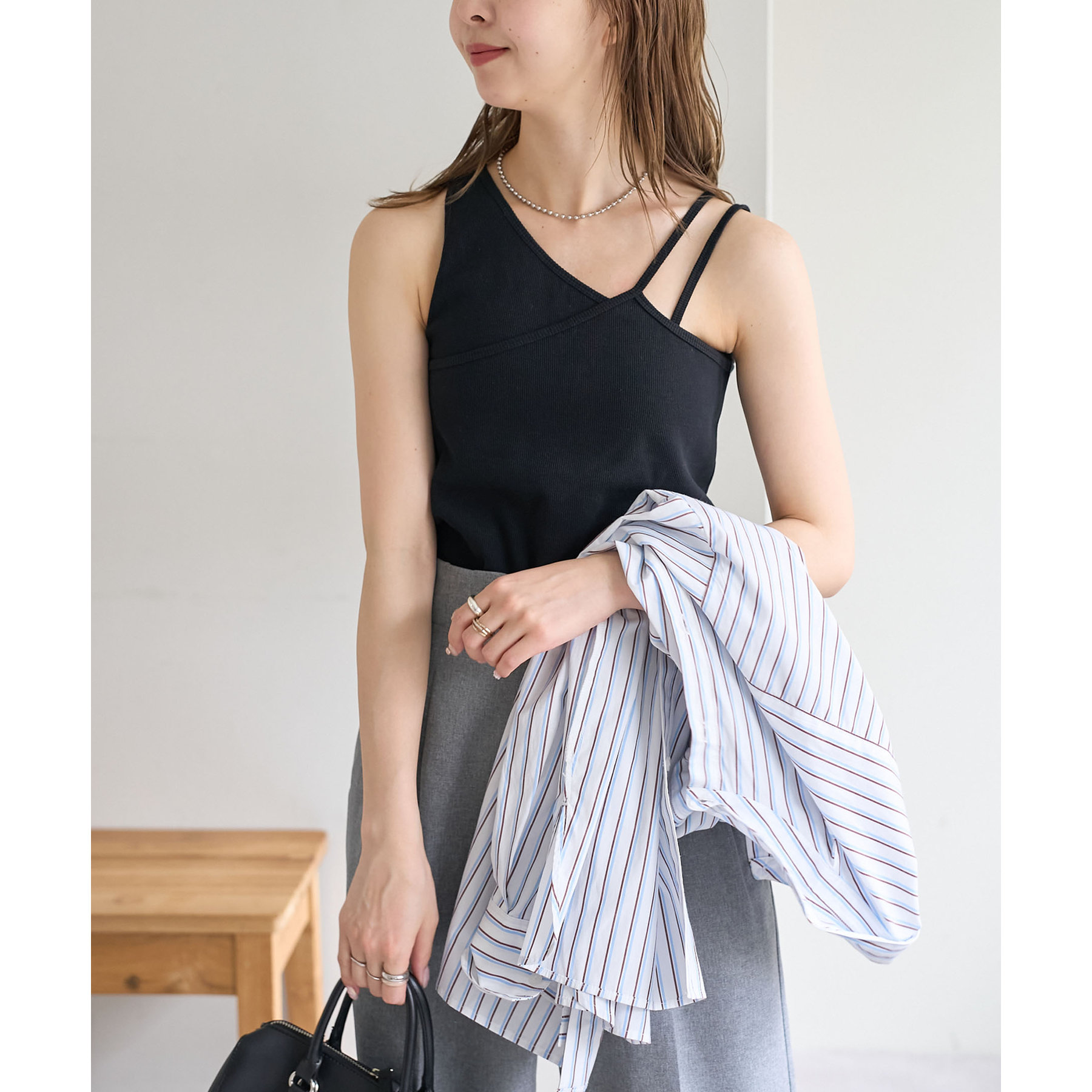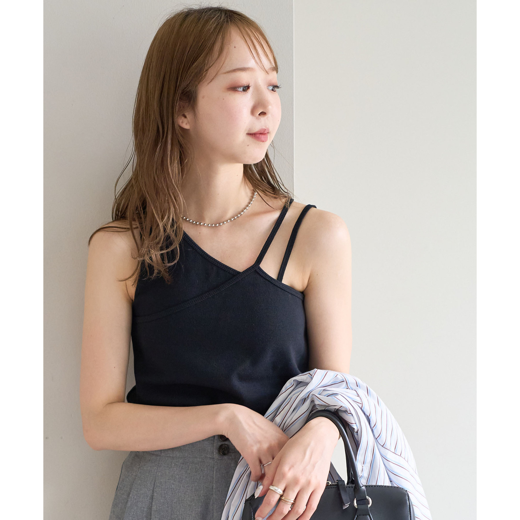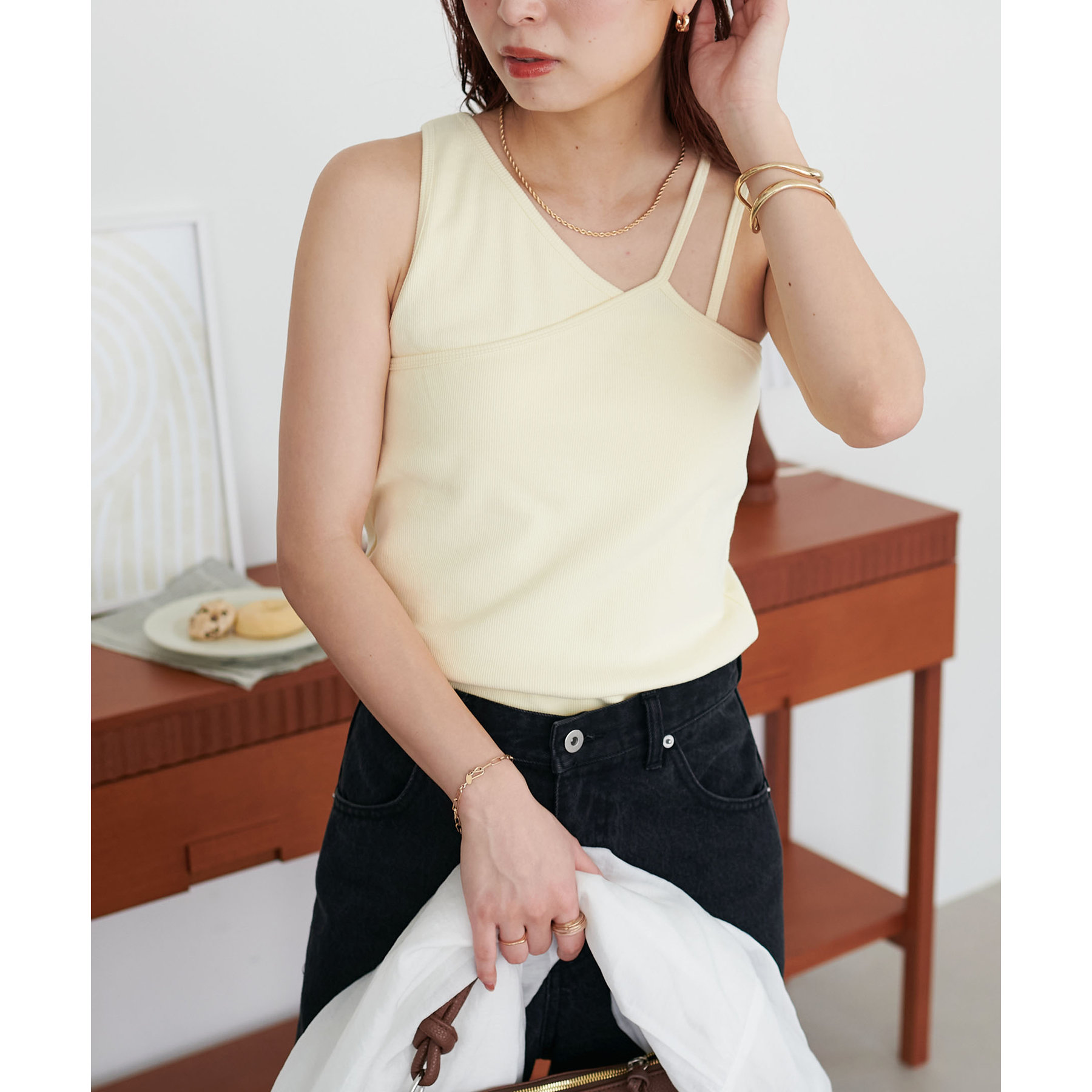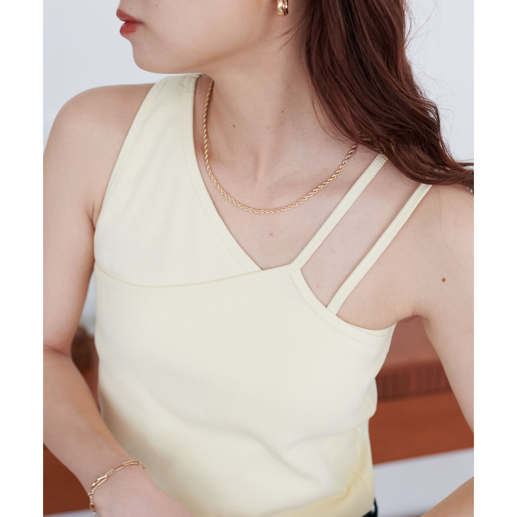 ・ワンショル×ダブルストラップのレイヤード風デザインが目を惹くカップ付きタンクトップ