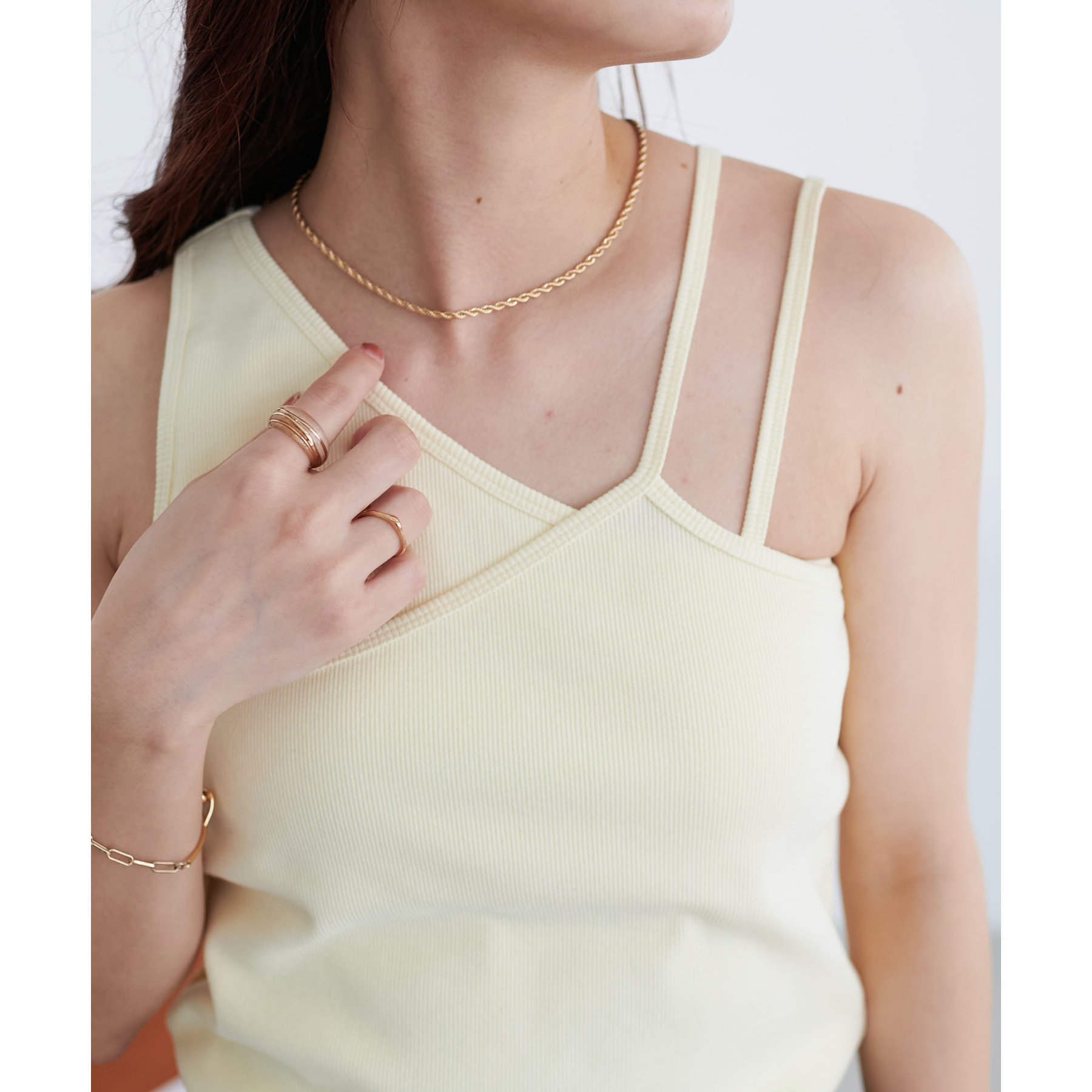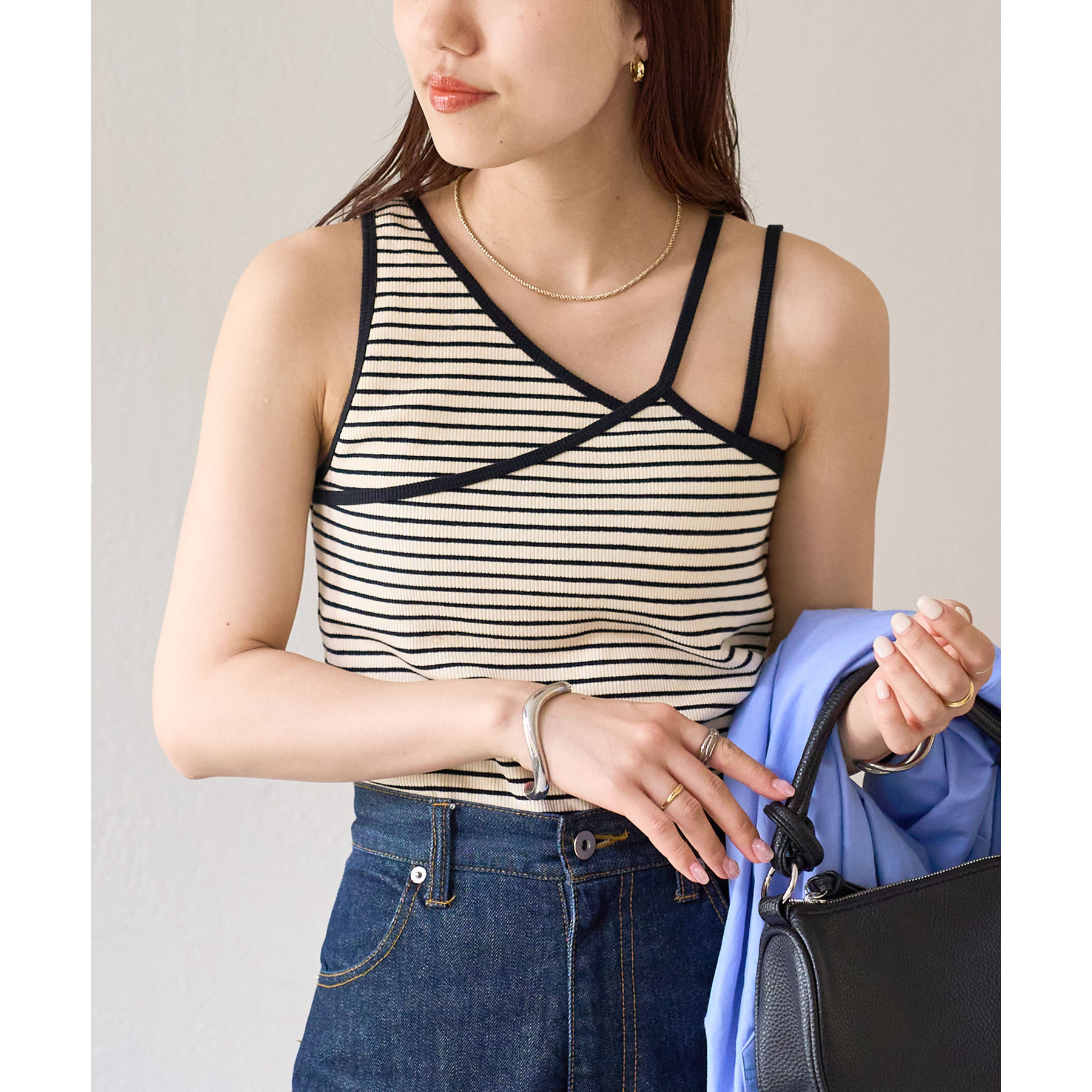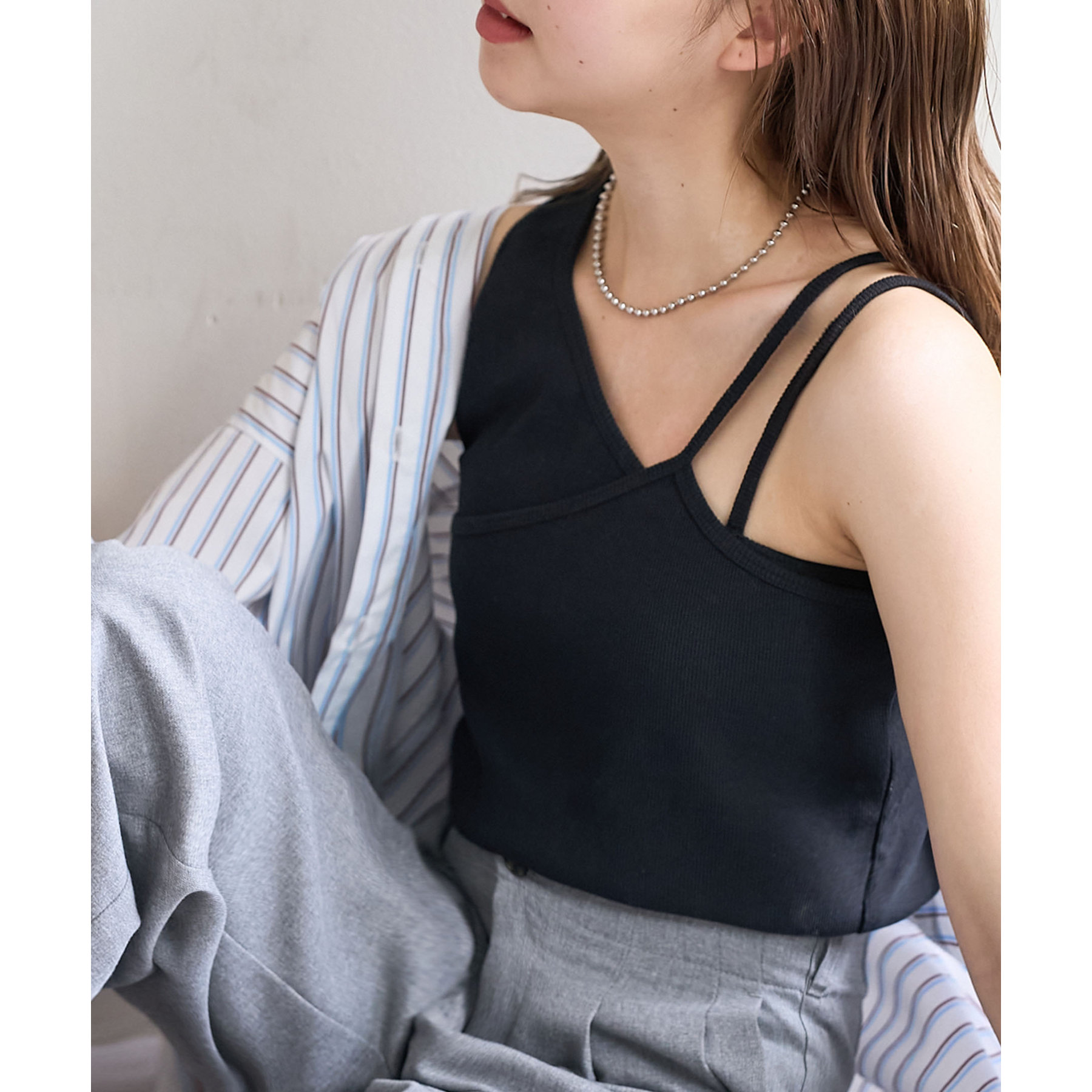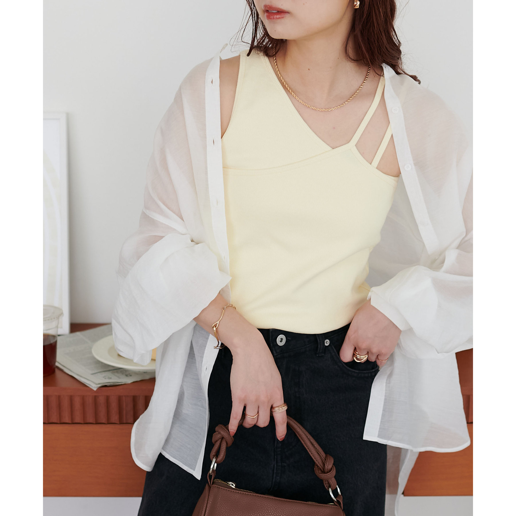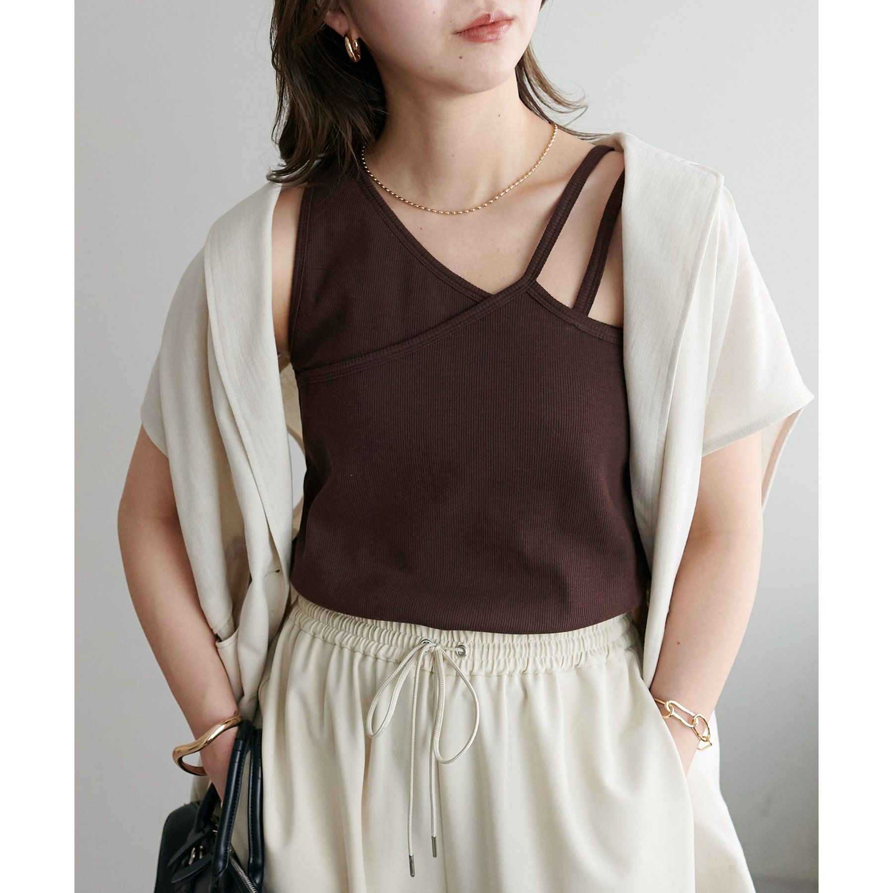 ・ワンショル×ダブルストラップのレイヤード風デザインが目を惹くカップ付きタンクトップ