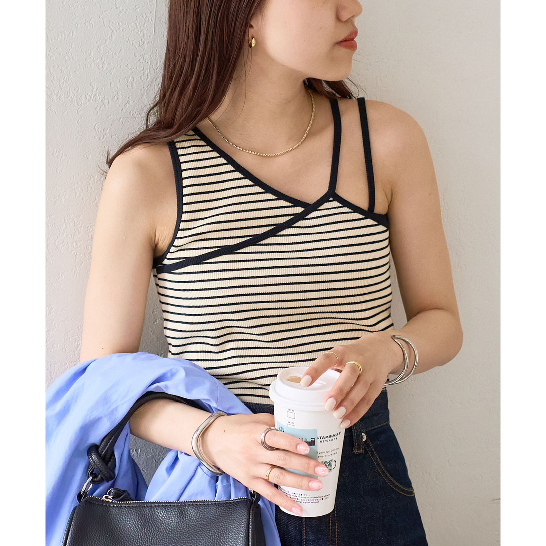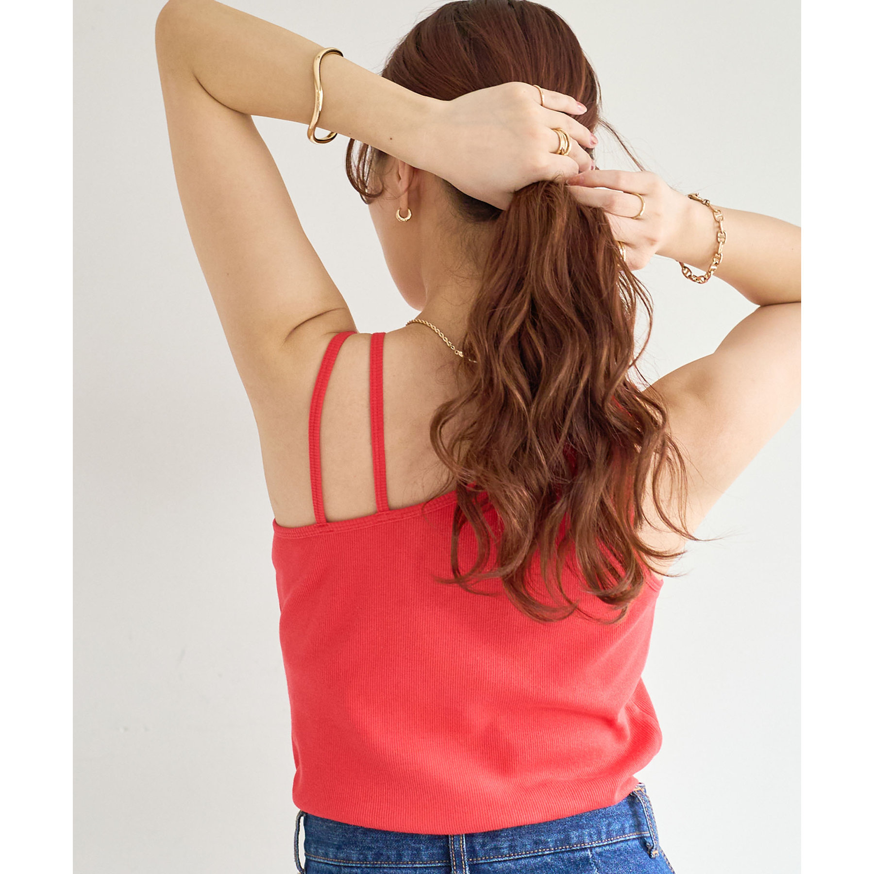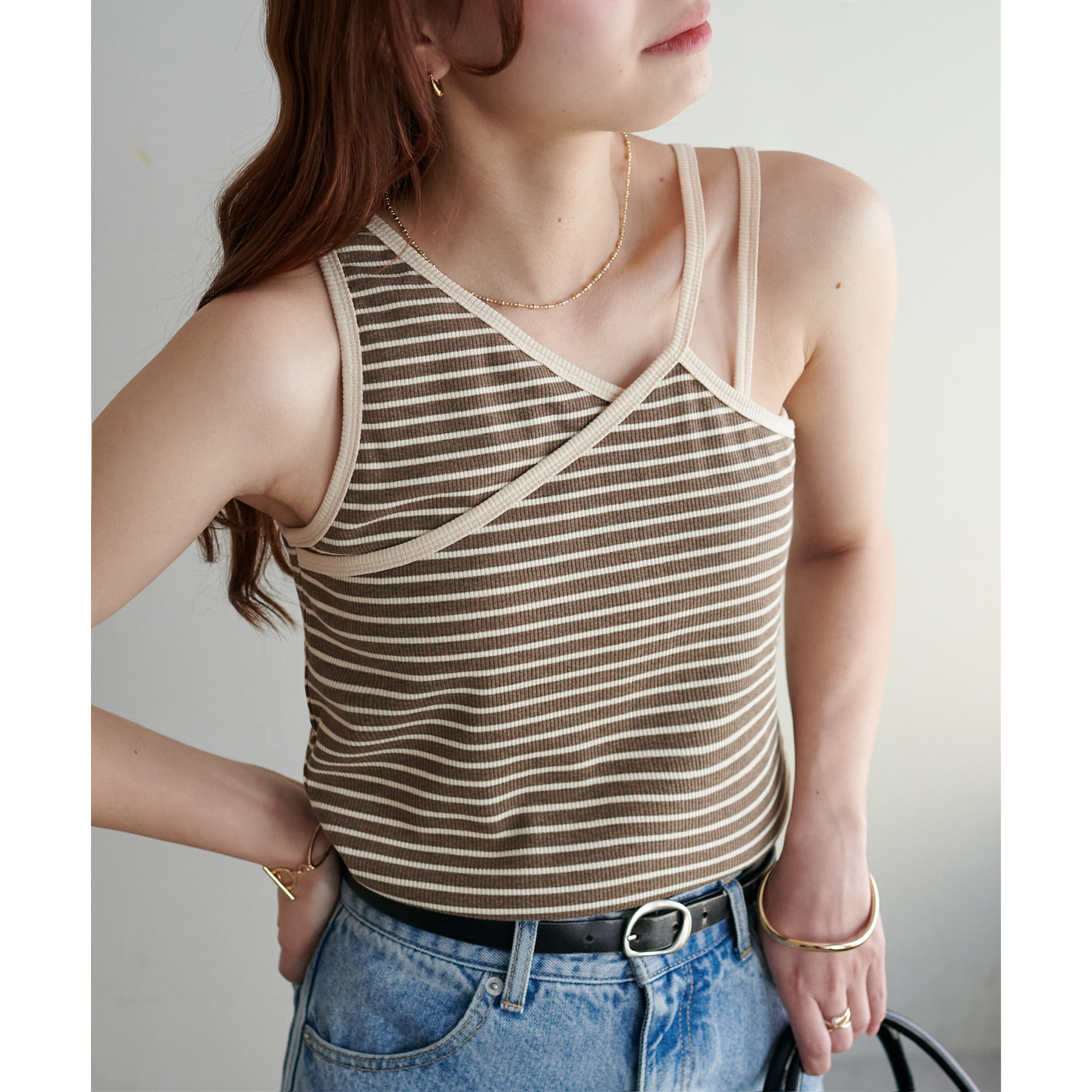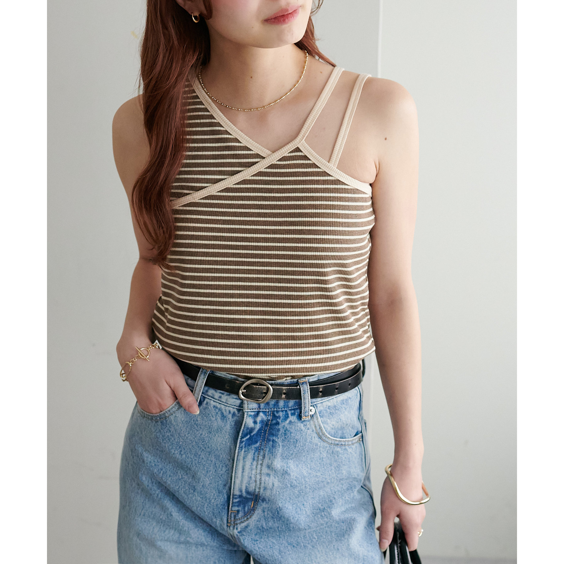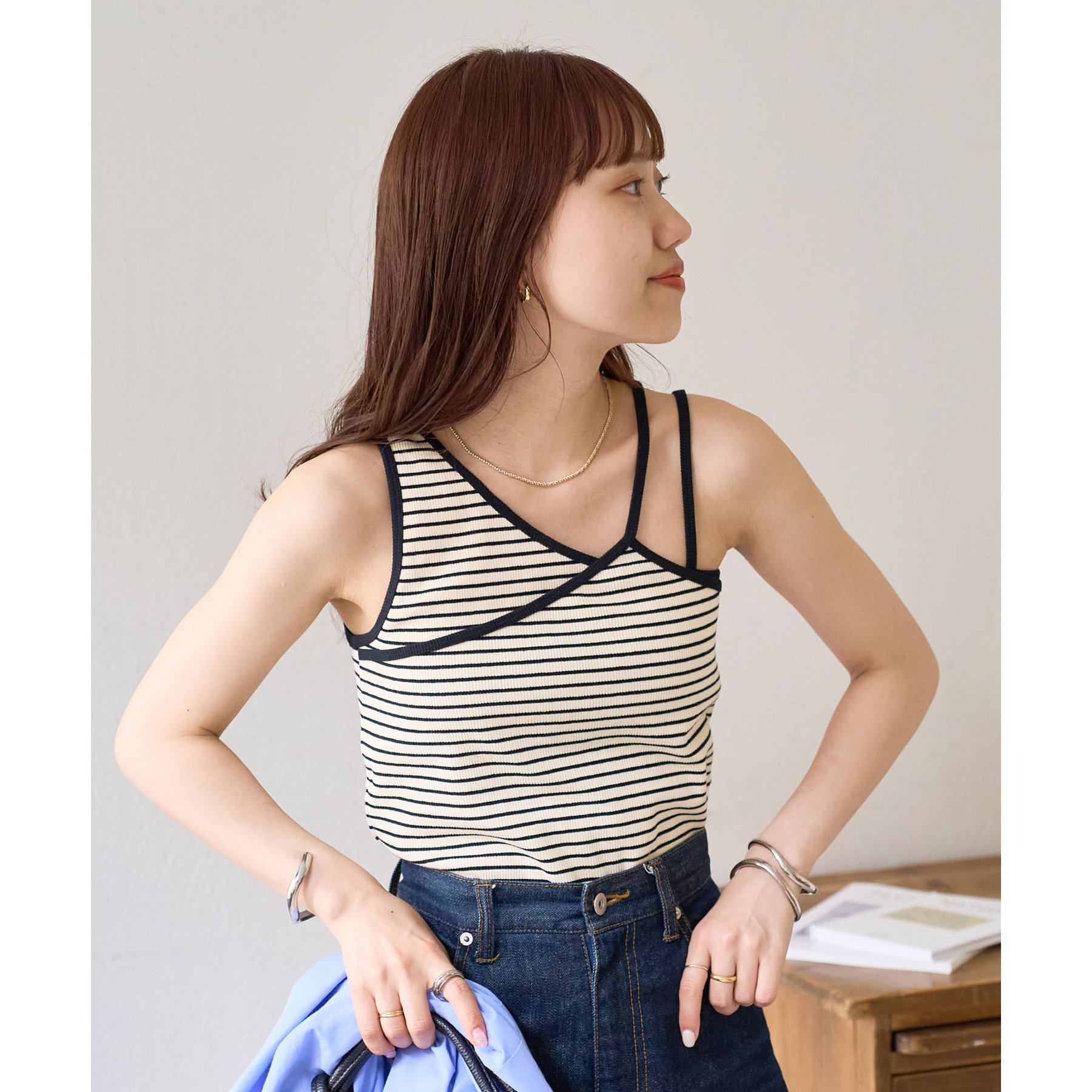 ・ワンショル×ダブルストラップのレイヤード風デザインが目を惹くカップ付きタンクトップ