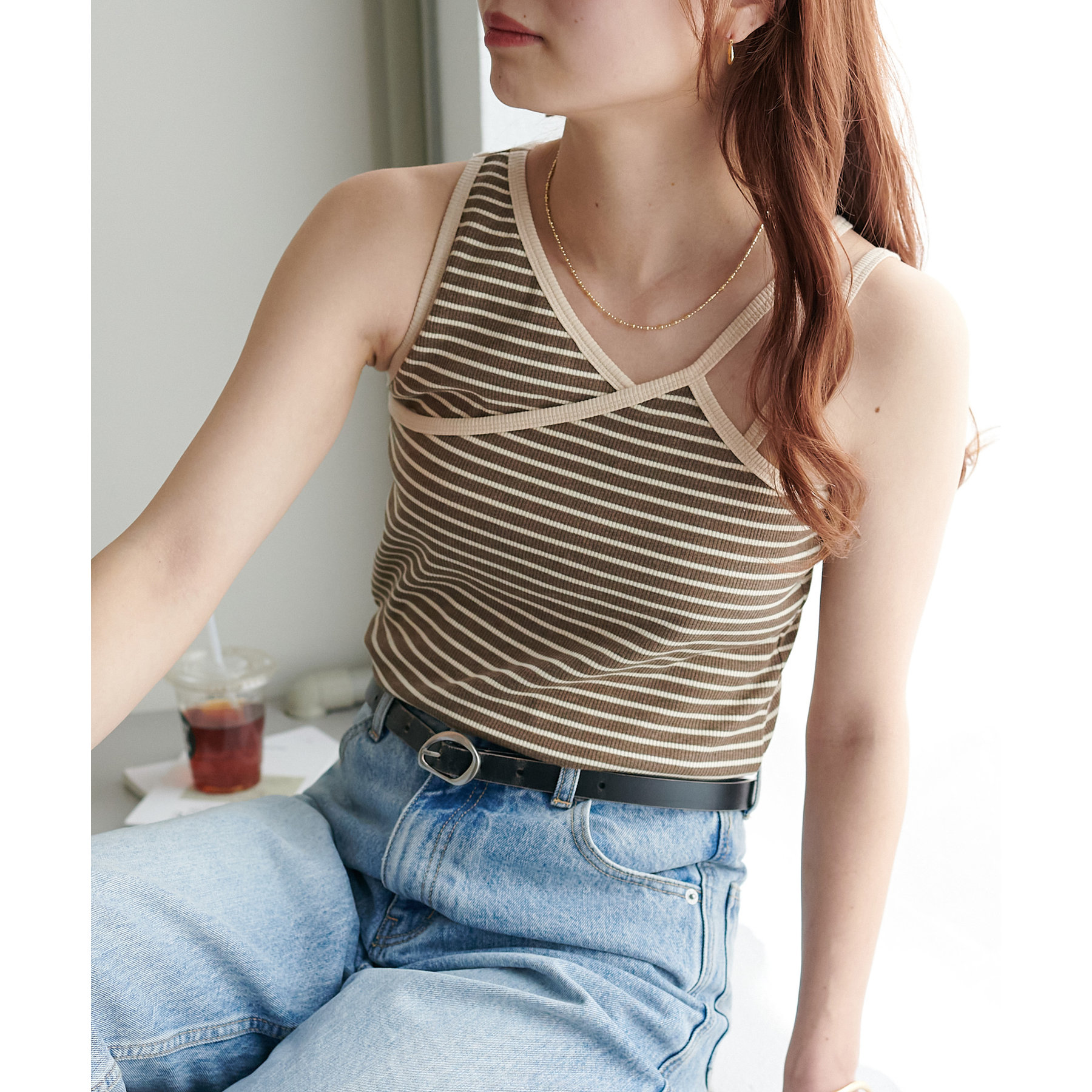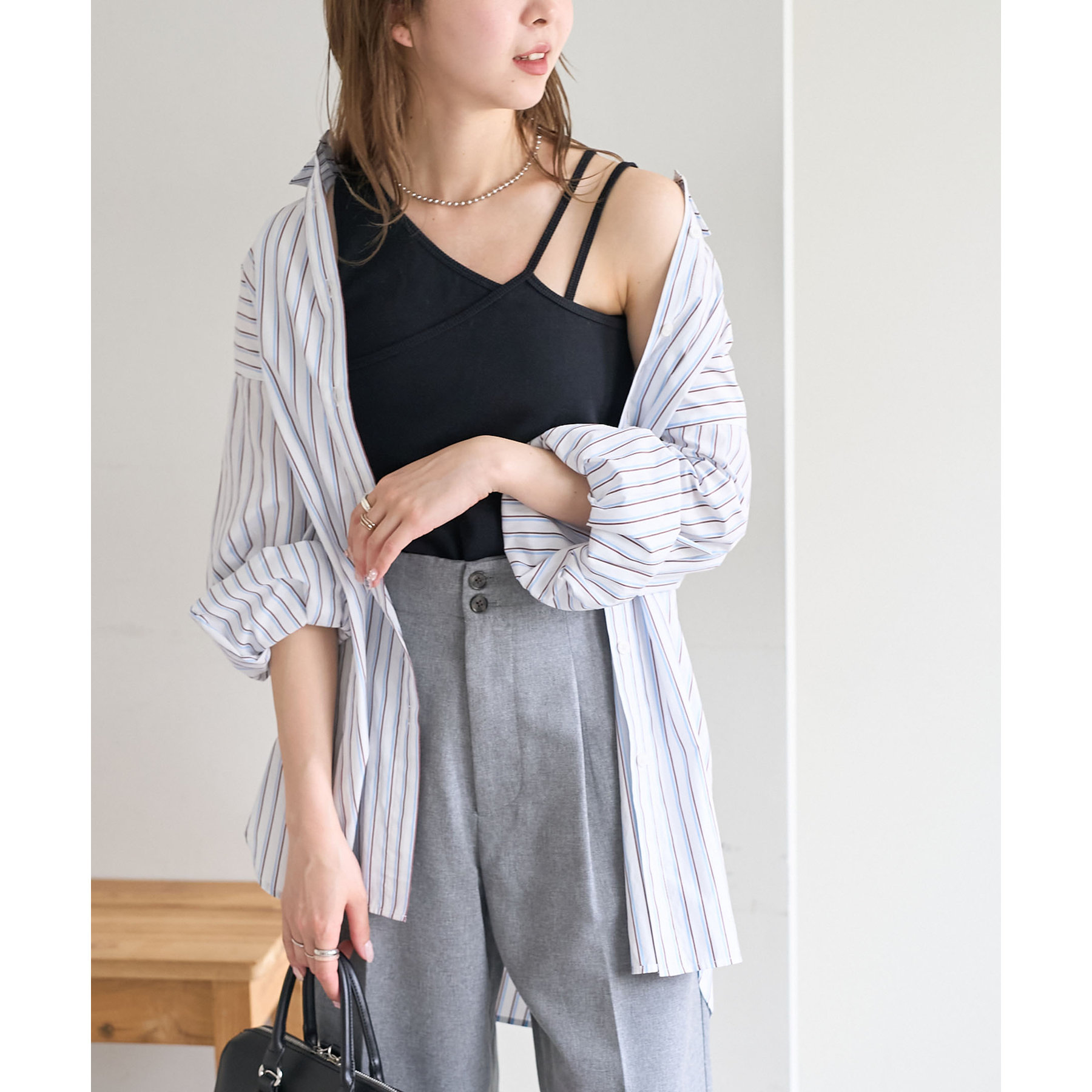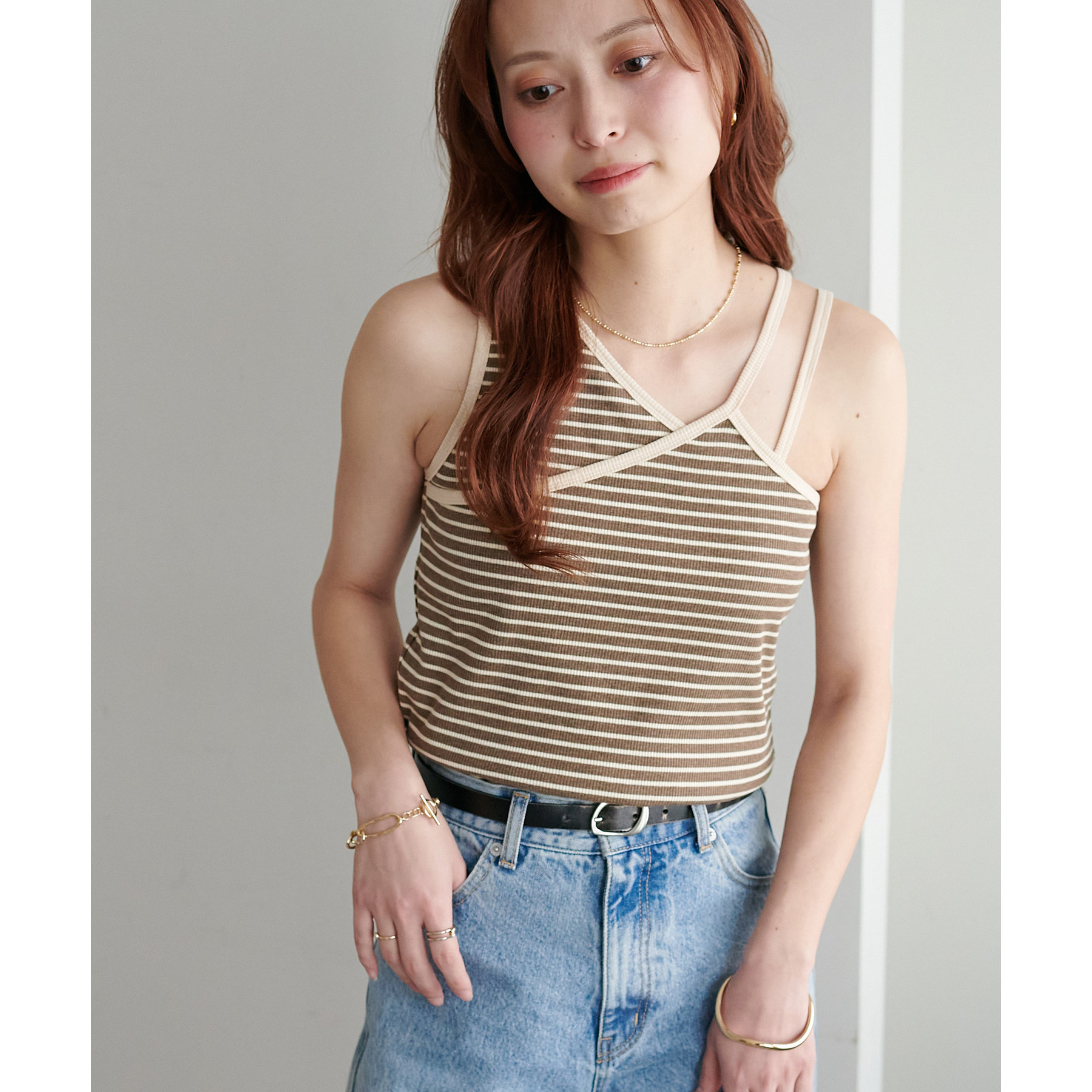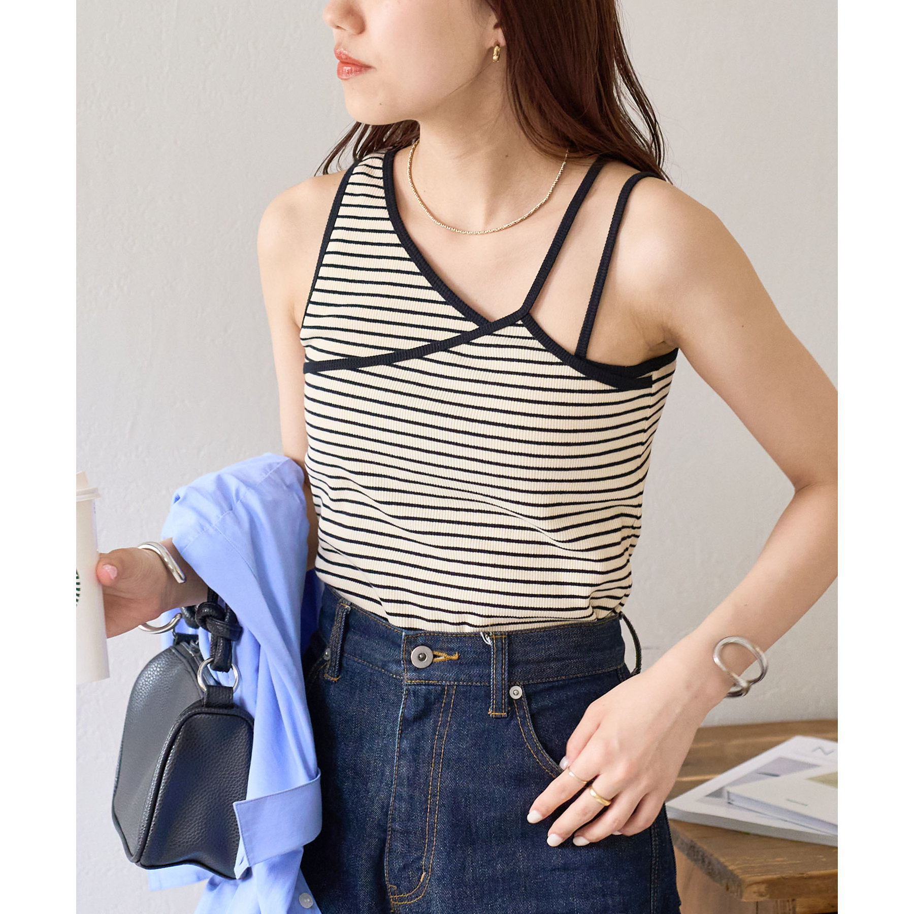 ・ワンショル×ダブルストラップのレイヤード風デザインが目を惹くカップ付きタンクトップ