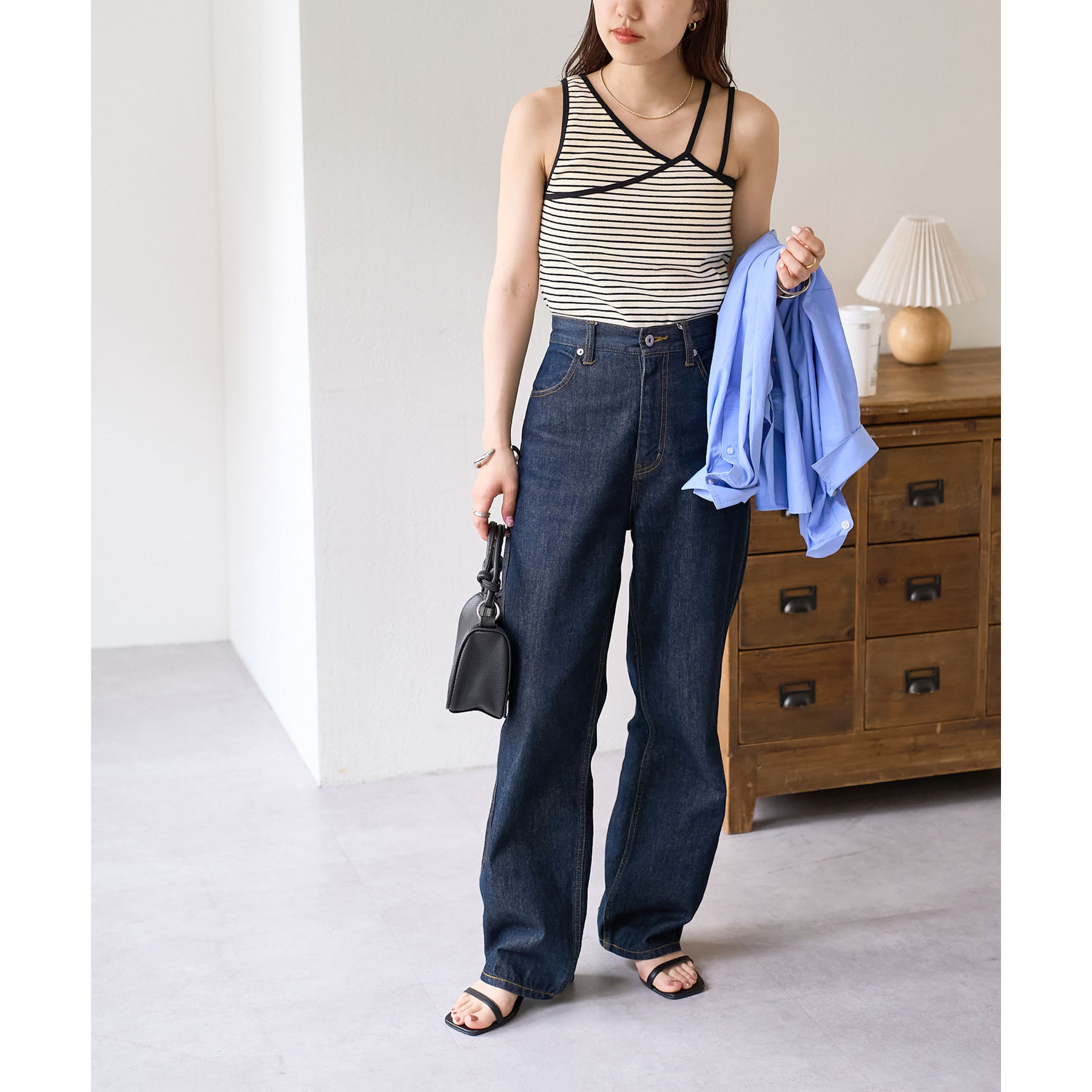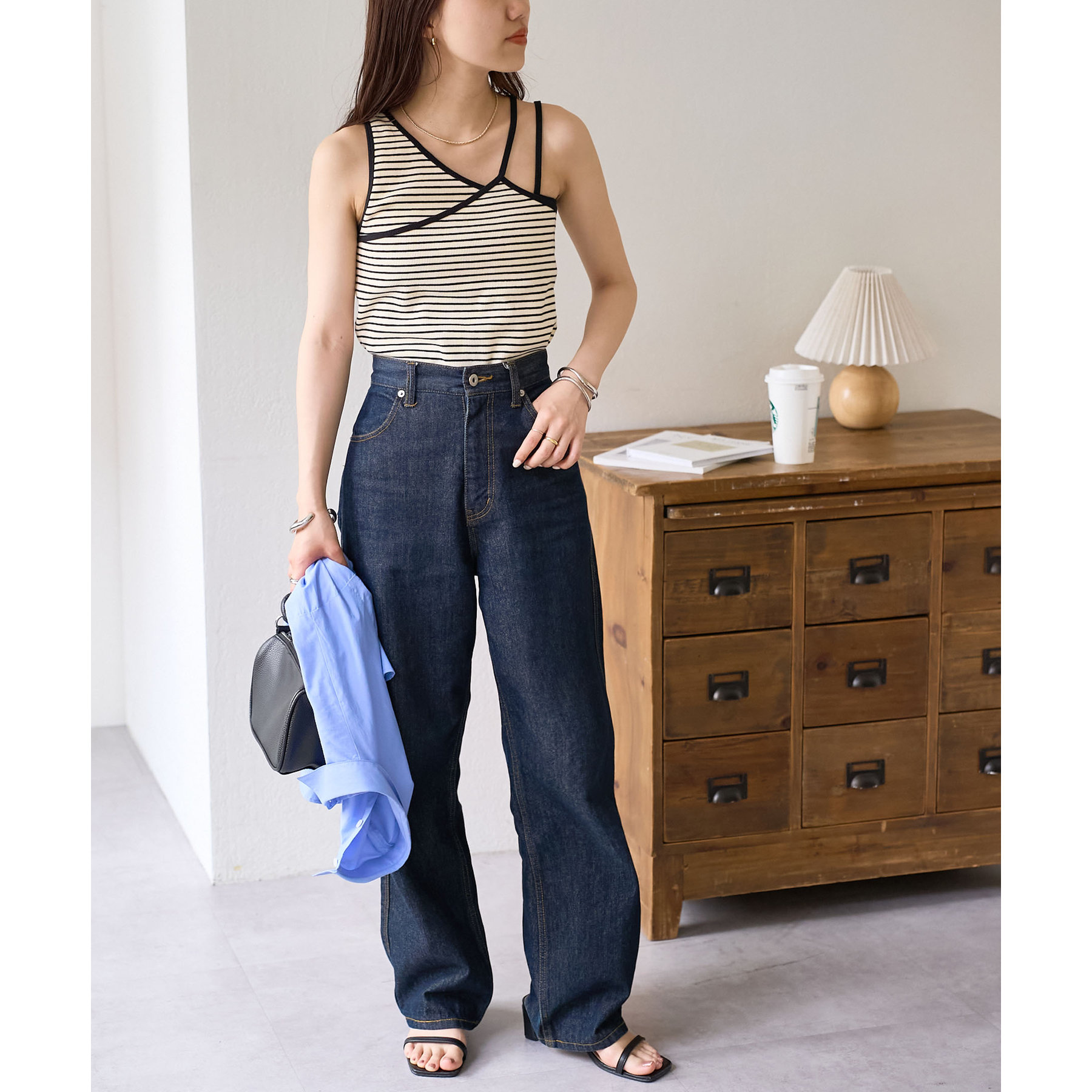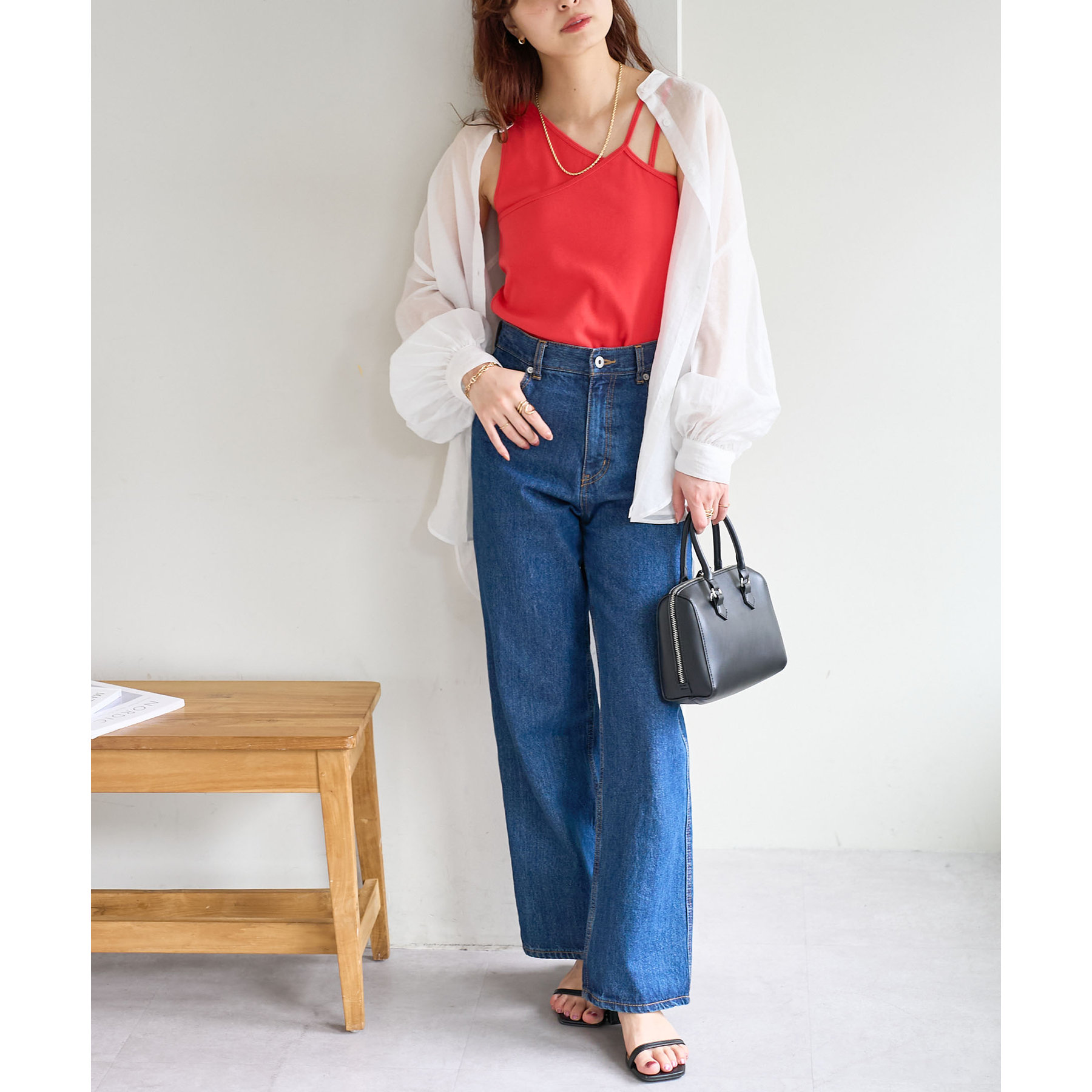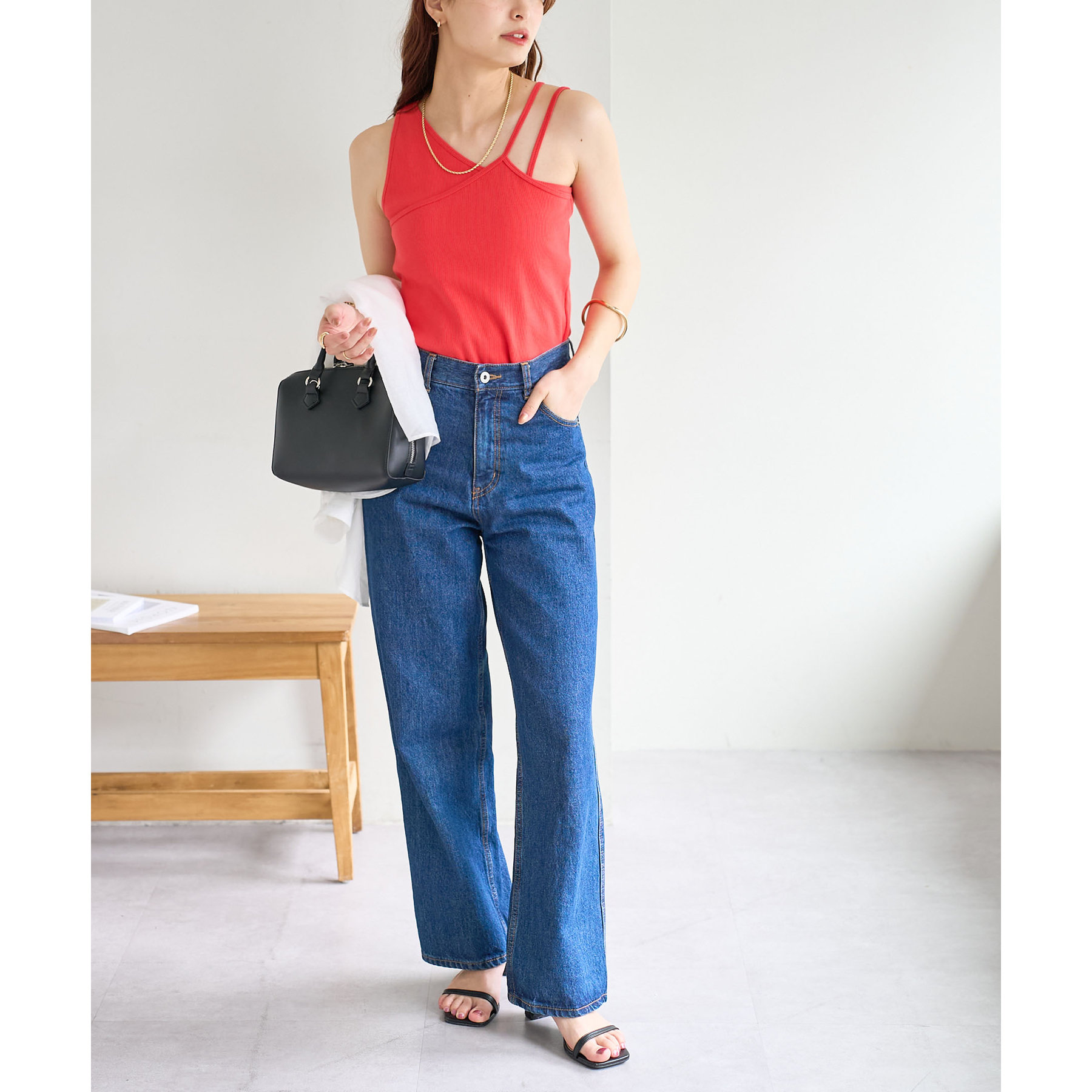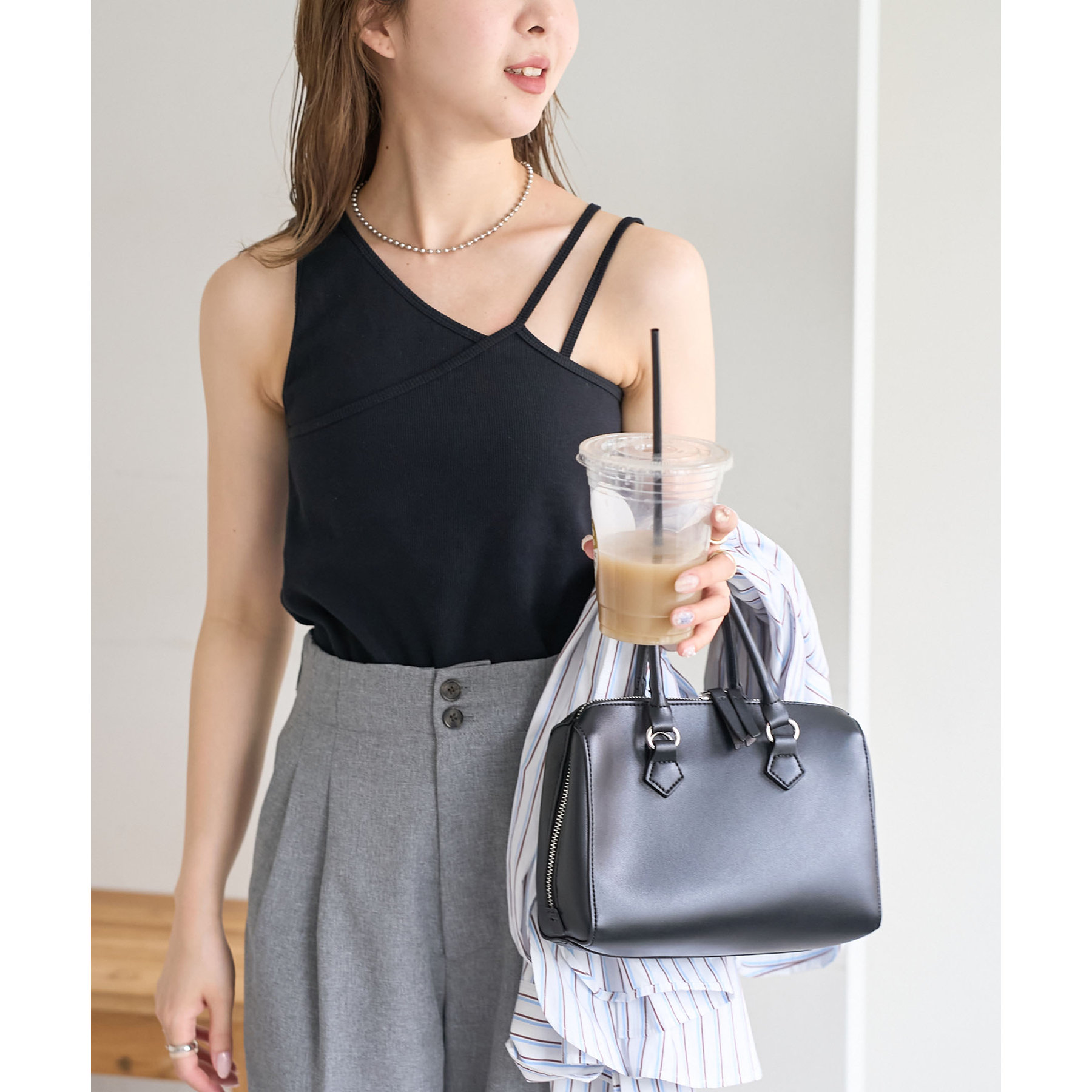 ・ワンショル×ダブルストラップのレイヤード風デザインが目を惹くカップ付きタンクトップ