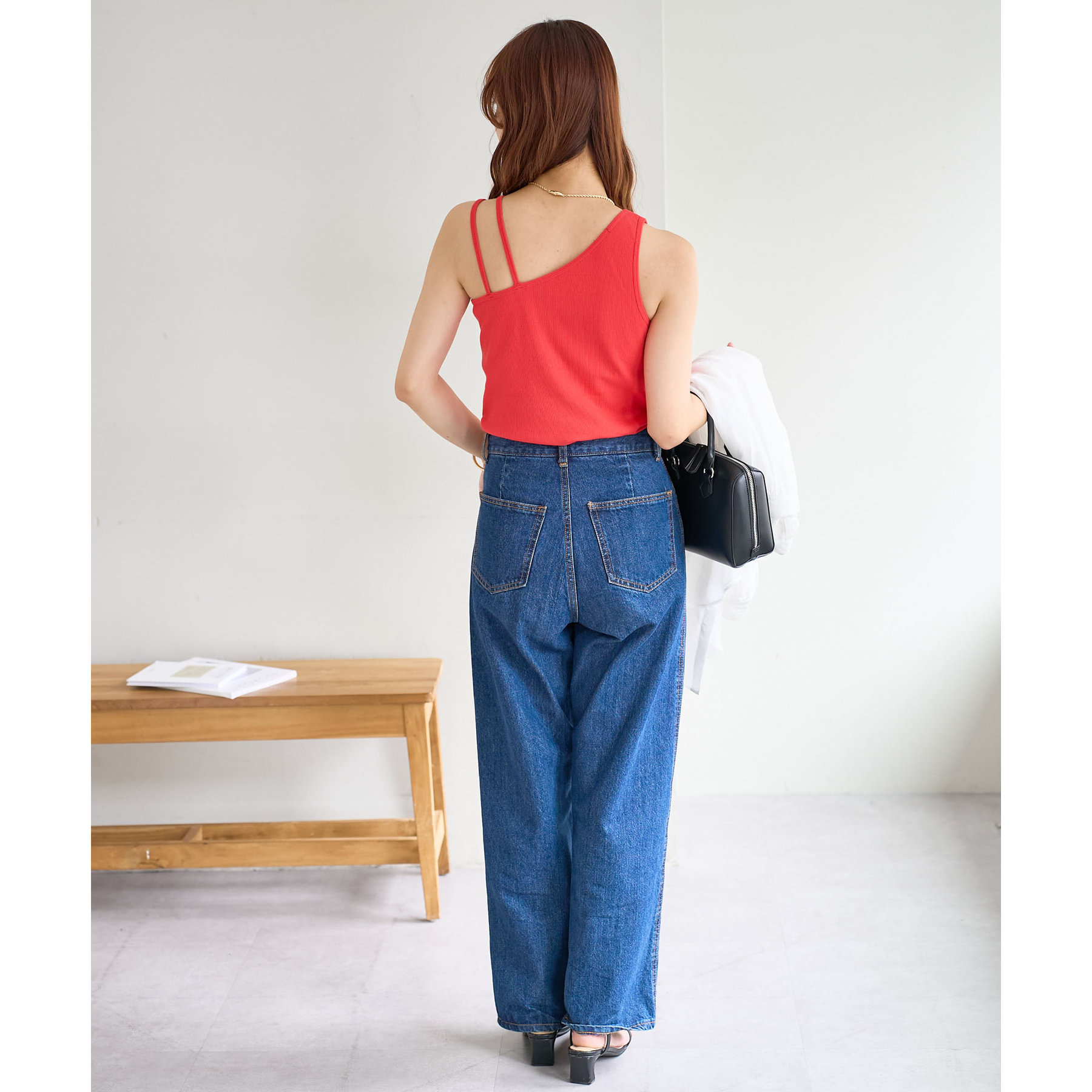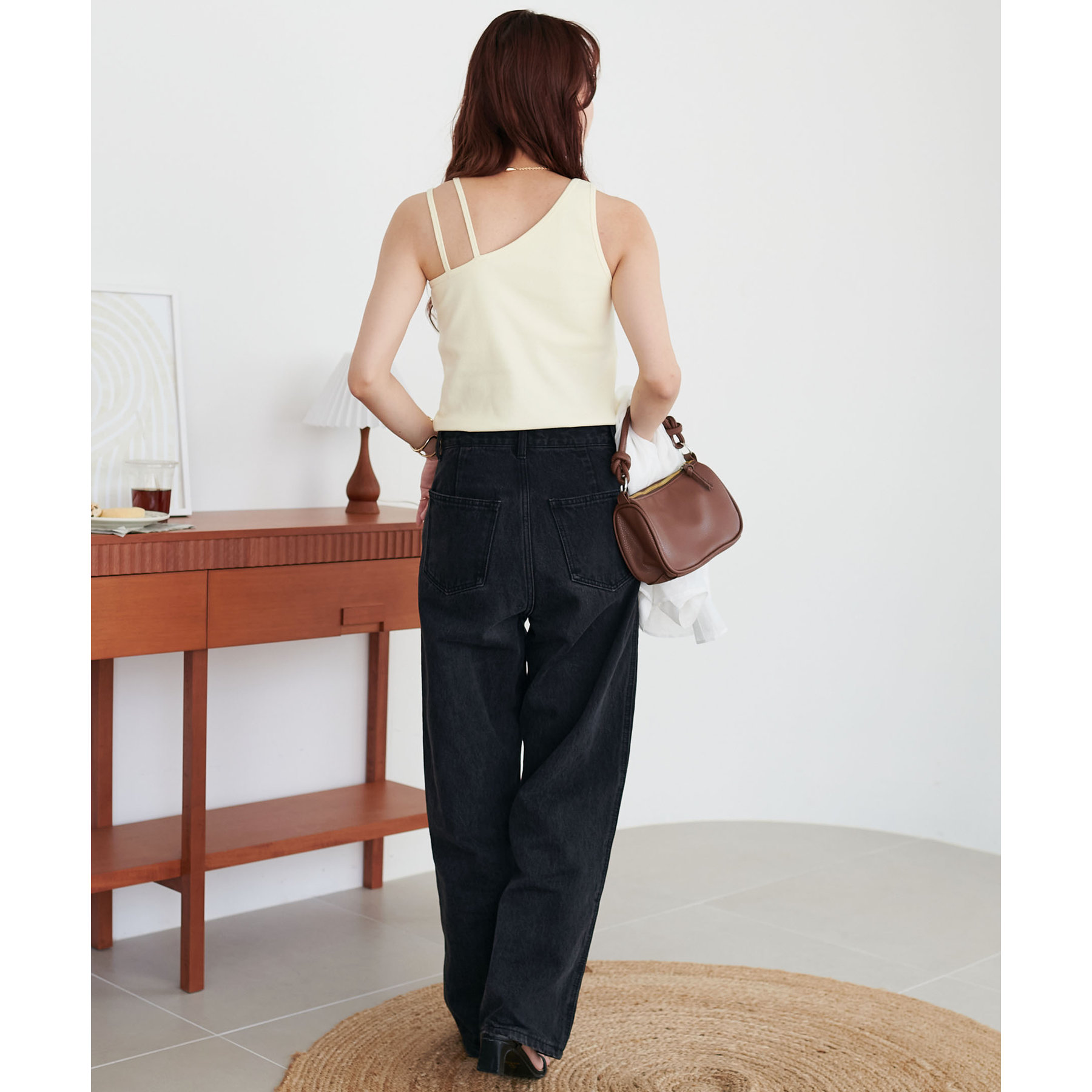 149cmスタッフ(Mサイズ着用):程よい厚みのあるリブ素材で体のラインを拾いすぎず、安心感のあるフィット感。アシンメトリーでもずれにくく、カップ付きで1枚でも快適です!