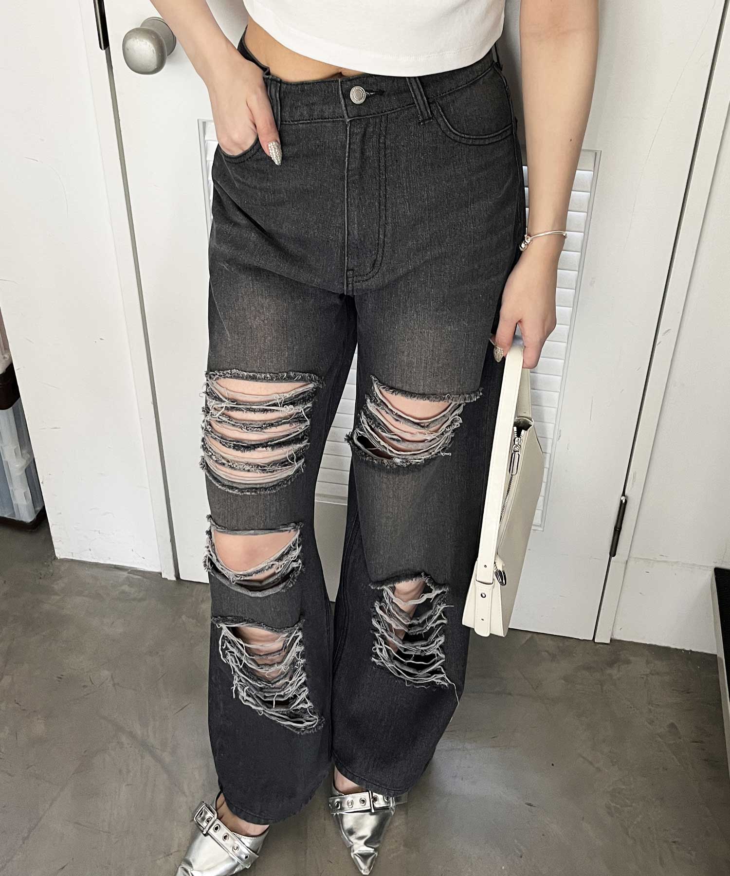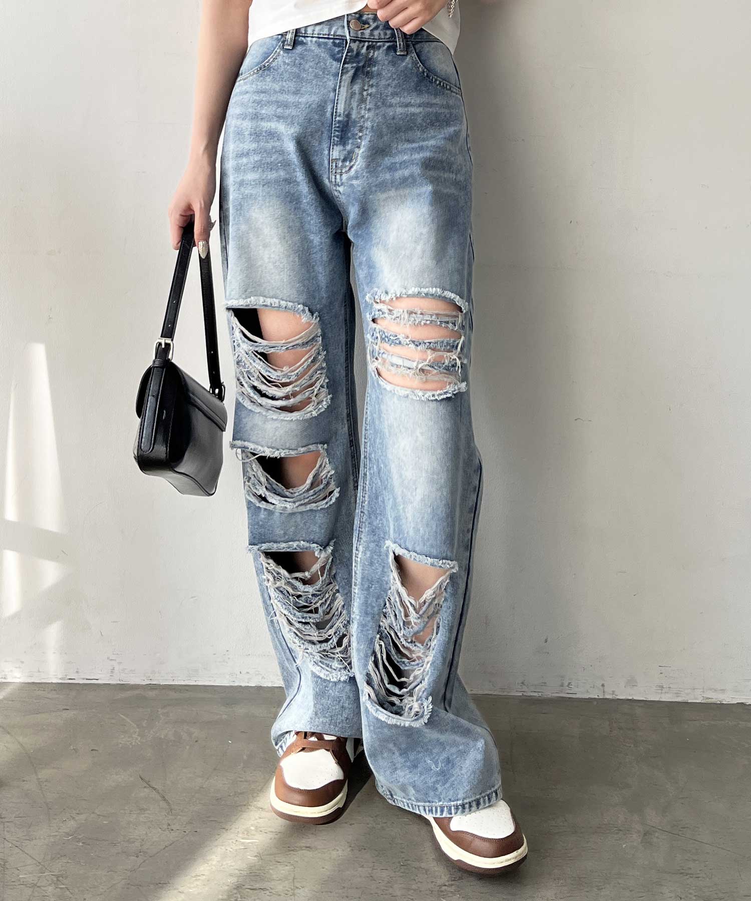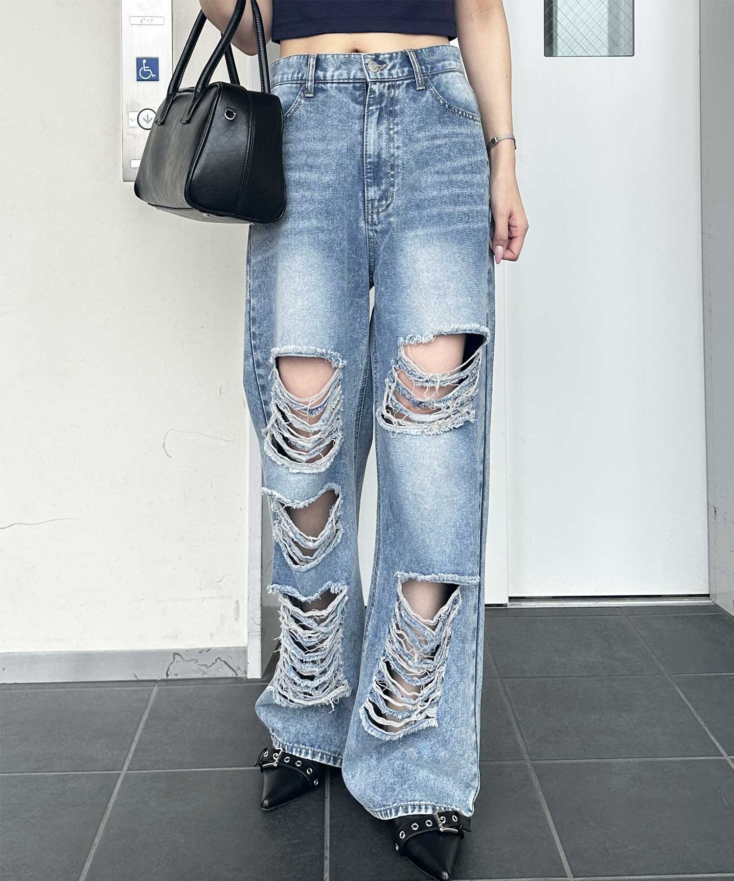 大胆なダメージ加工でヴィンテージっぽくこなれ感抜群なルーズデニムパンツ。