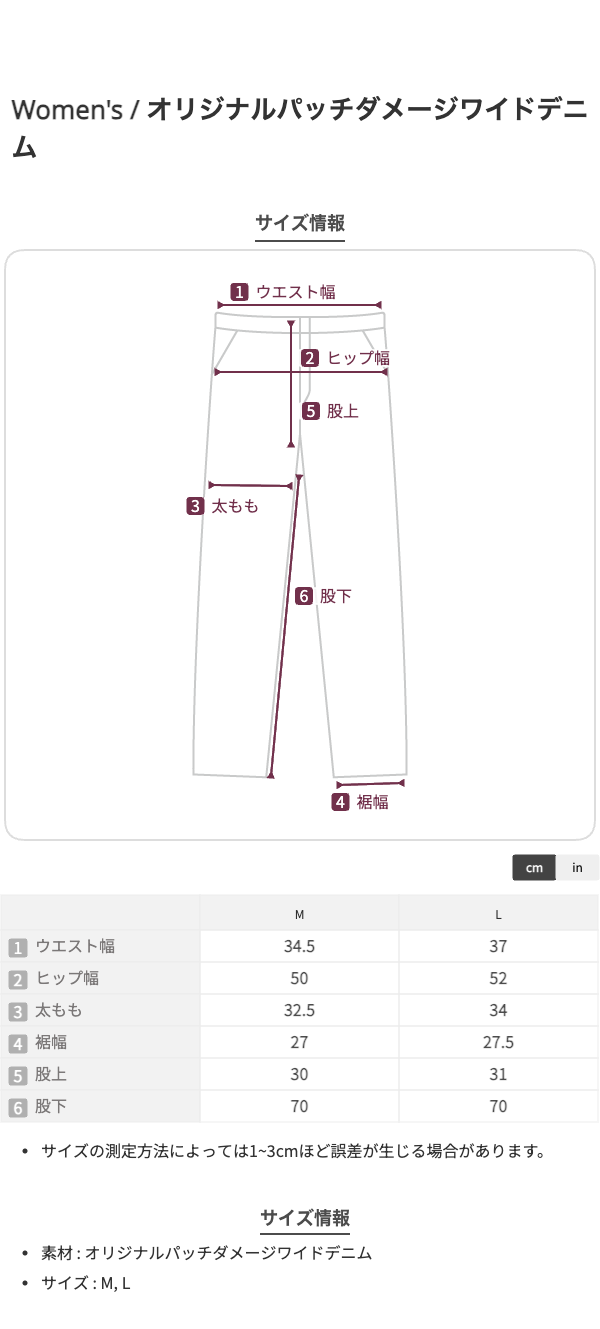 M:ウエスト69、ヒップ100、股上30、股下70、わたり幅32.5、裾幅27