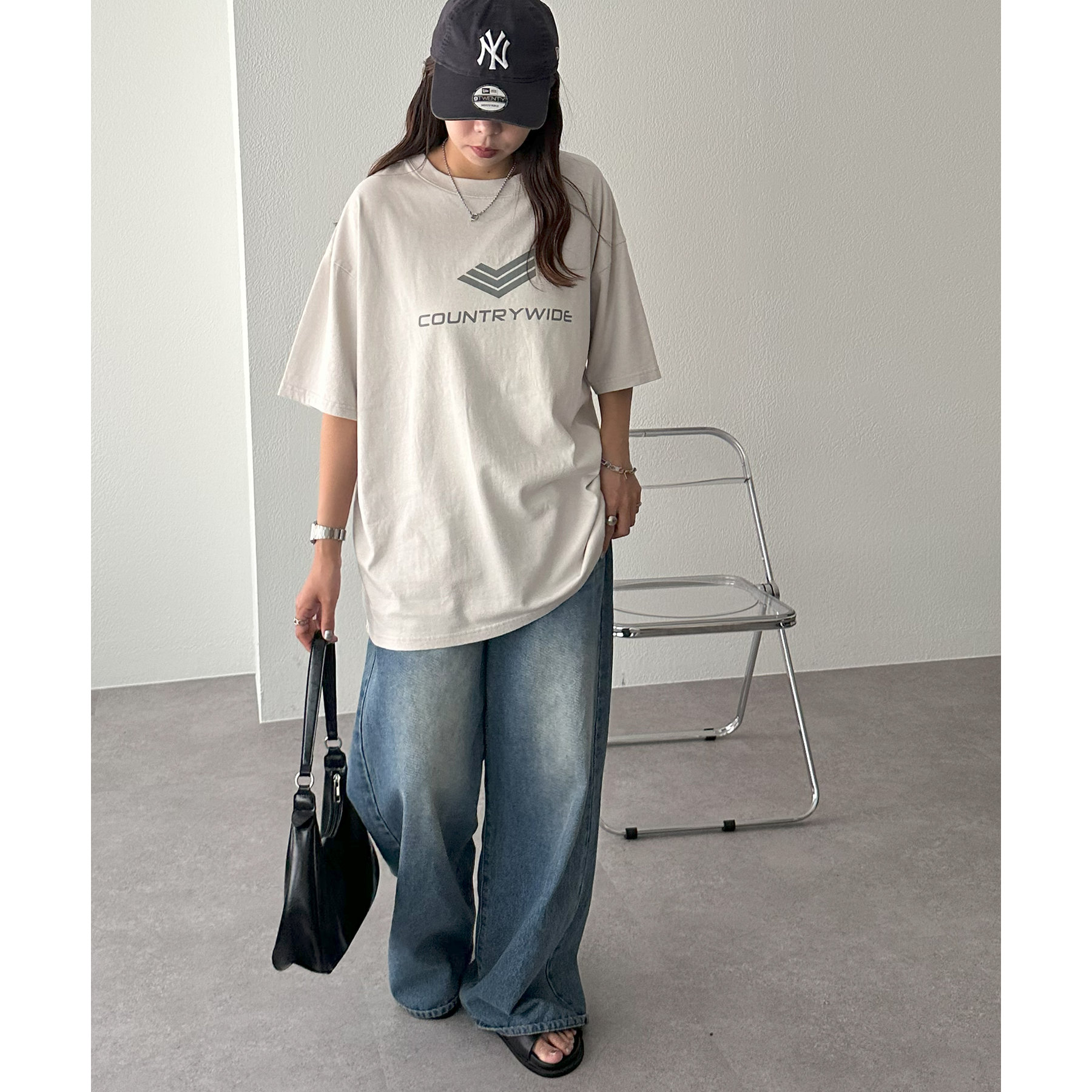 大胆なロゴグラフィックとスプレー加工が目を惹く、トレンド感満載のコーポレート風Tシャツ。