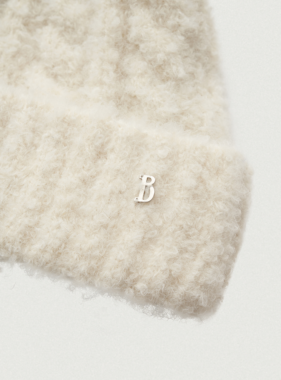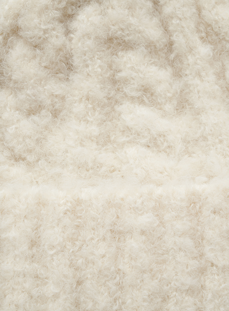 アイボリーカラーで、柔らかくふわふわとしたテクスチャーが特徴のウール混ブークレニット素材。