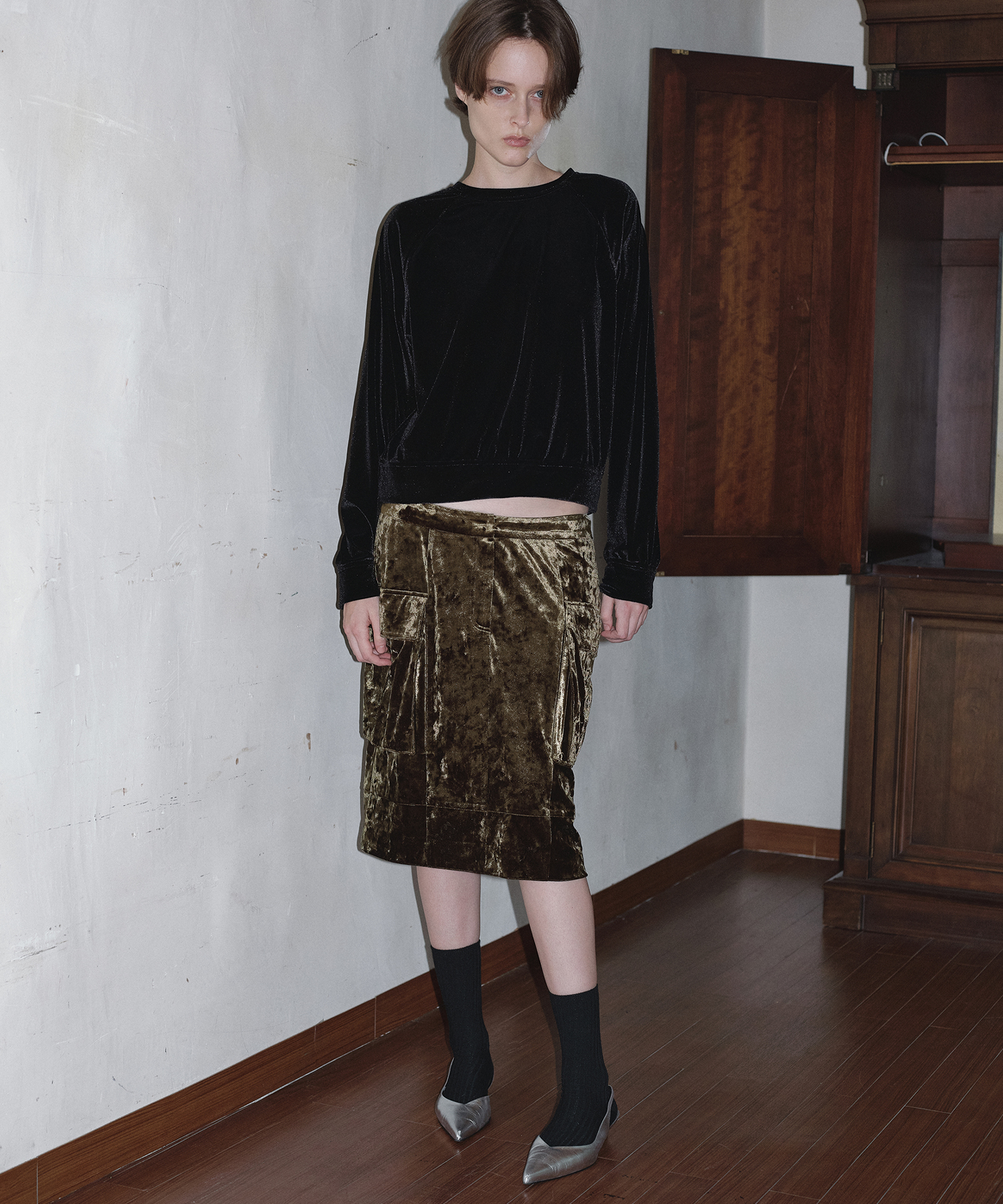 ベルベットの光沢とテクスチャー感が際立つカーゴミディスカートです。