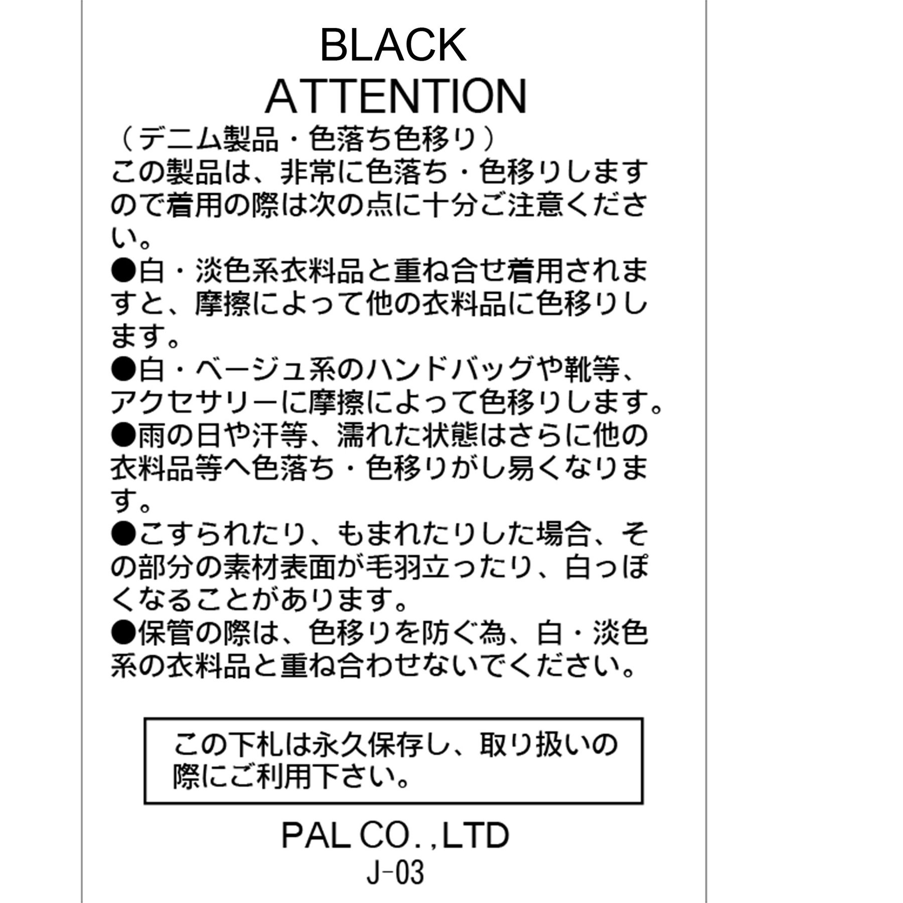 ・保管の際は、色移りを防ぐ為、白・淡色系の衣料品と重ね合わせないでください。