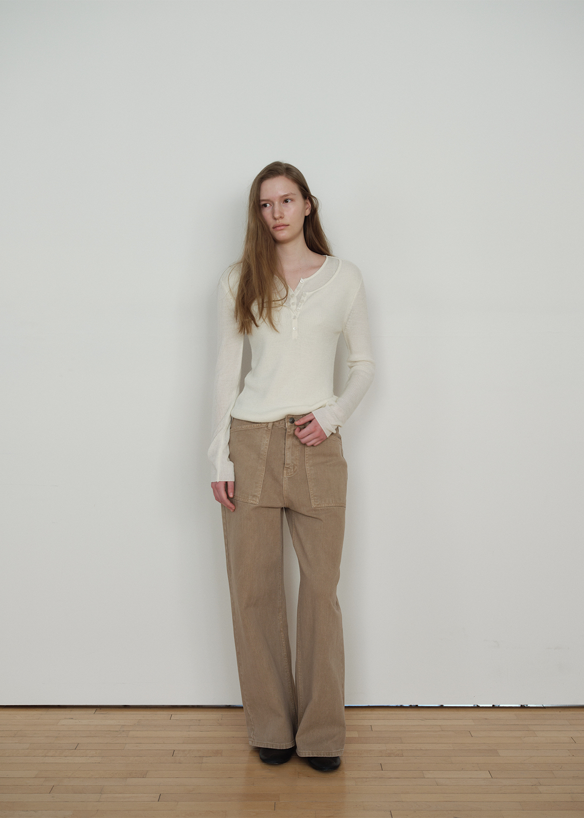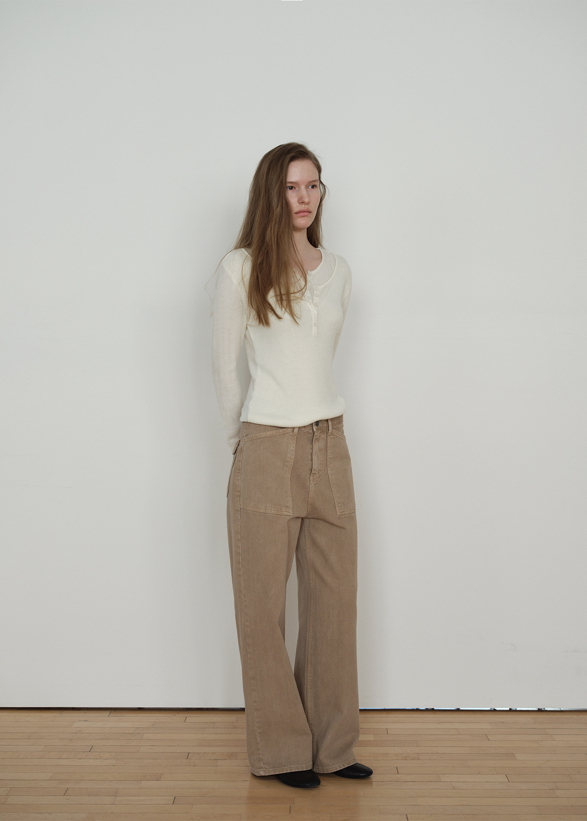 フロントにはワイドなパッチポケットを配し、ワークウェアムードをプラス。バックにはフラップポケットのディテールとウエストのロゴラベルポイントを加え、後ろ姿まで完成度を高めました。Beige は落ち着いたトーンオントーンスタイルに、Deep Blue はルックに鮮明なムードを加え、シャツ・ニット・Tシャツなどさまざまなトップスと自然にマッチします。
