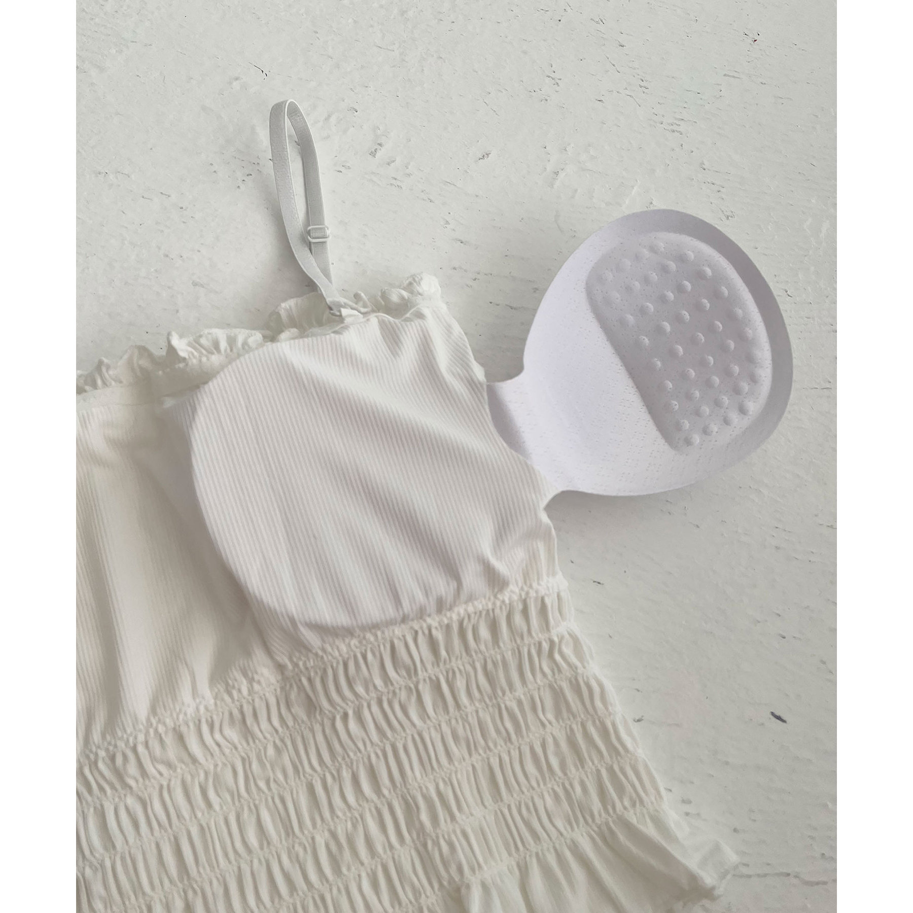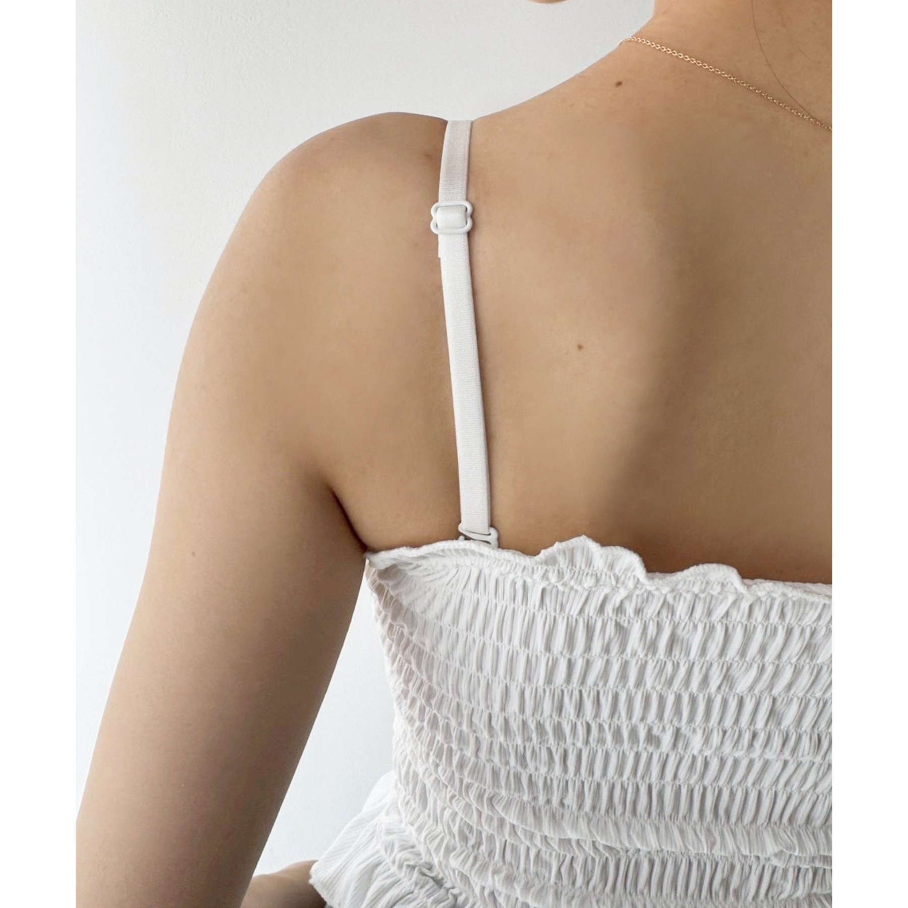 細めの紐がデコルテをきれいに見せ、上品な印象に仕上がるので、