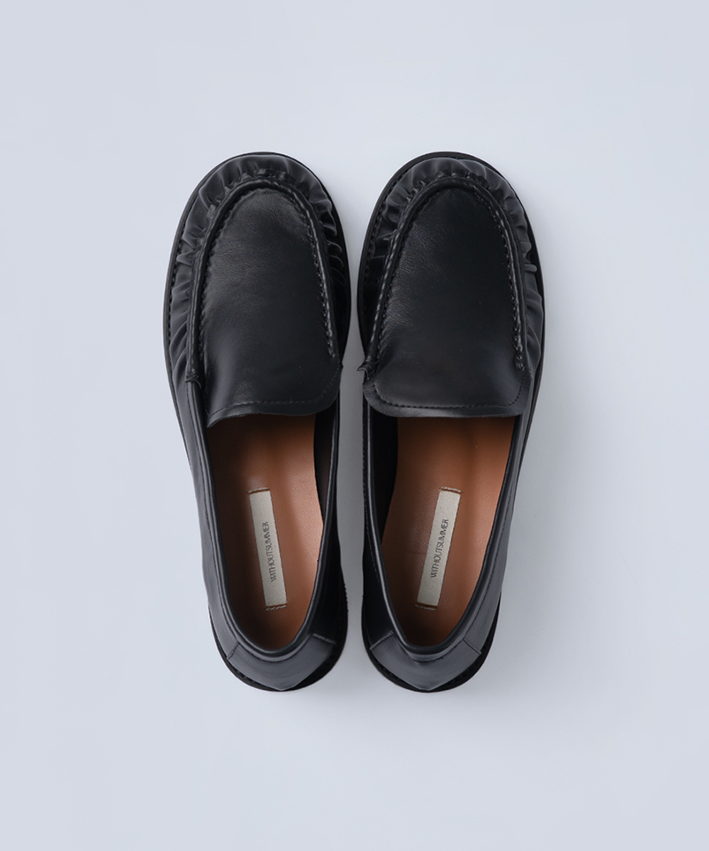 しなやかなレザーと自然に入るシワのディテールが、ローファー特有のきちんと感をほどよくやわらげ、シンプルなデザインながらさりげないポイントになる一足です。