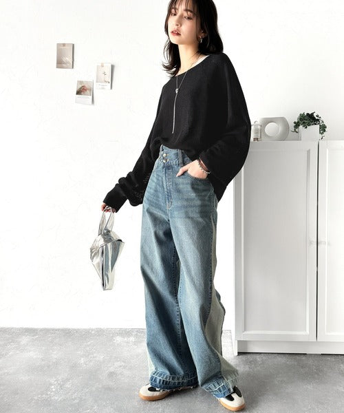また、きれいめなコーデが好みの方には、デニムスカートやスリムなパンツを合わせると一気に華やかに。