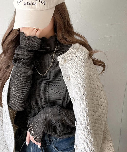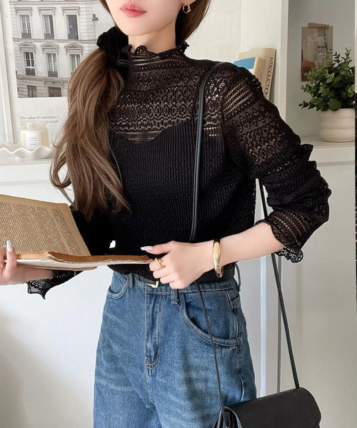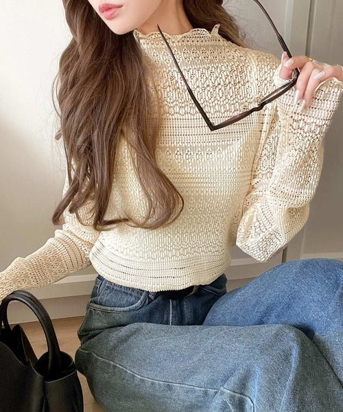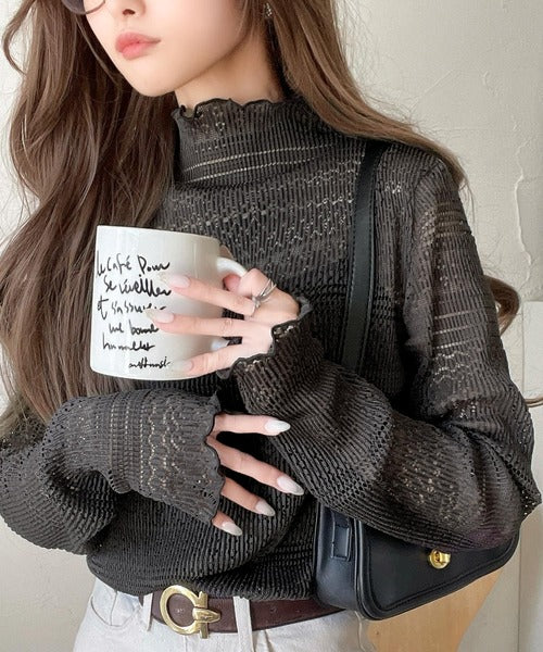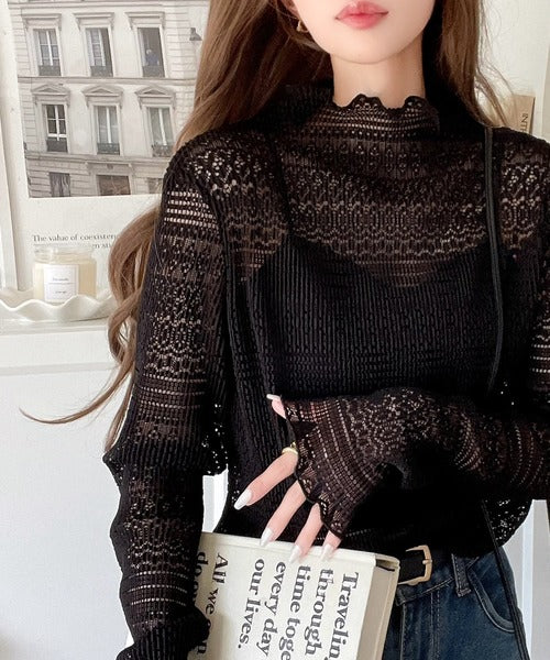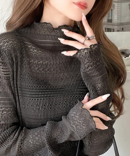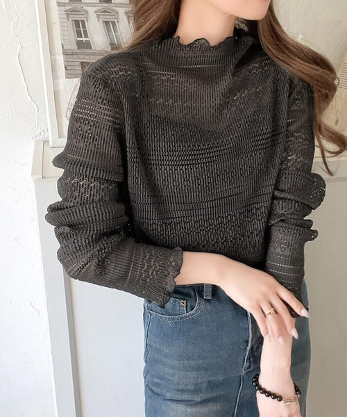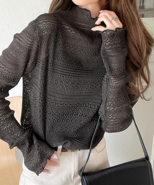 ハイネックデザインでより大人っぽく、程よい透け感を楽しめるアイテムです。