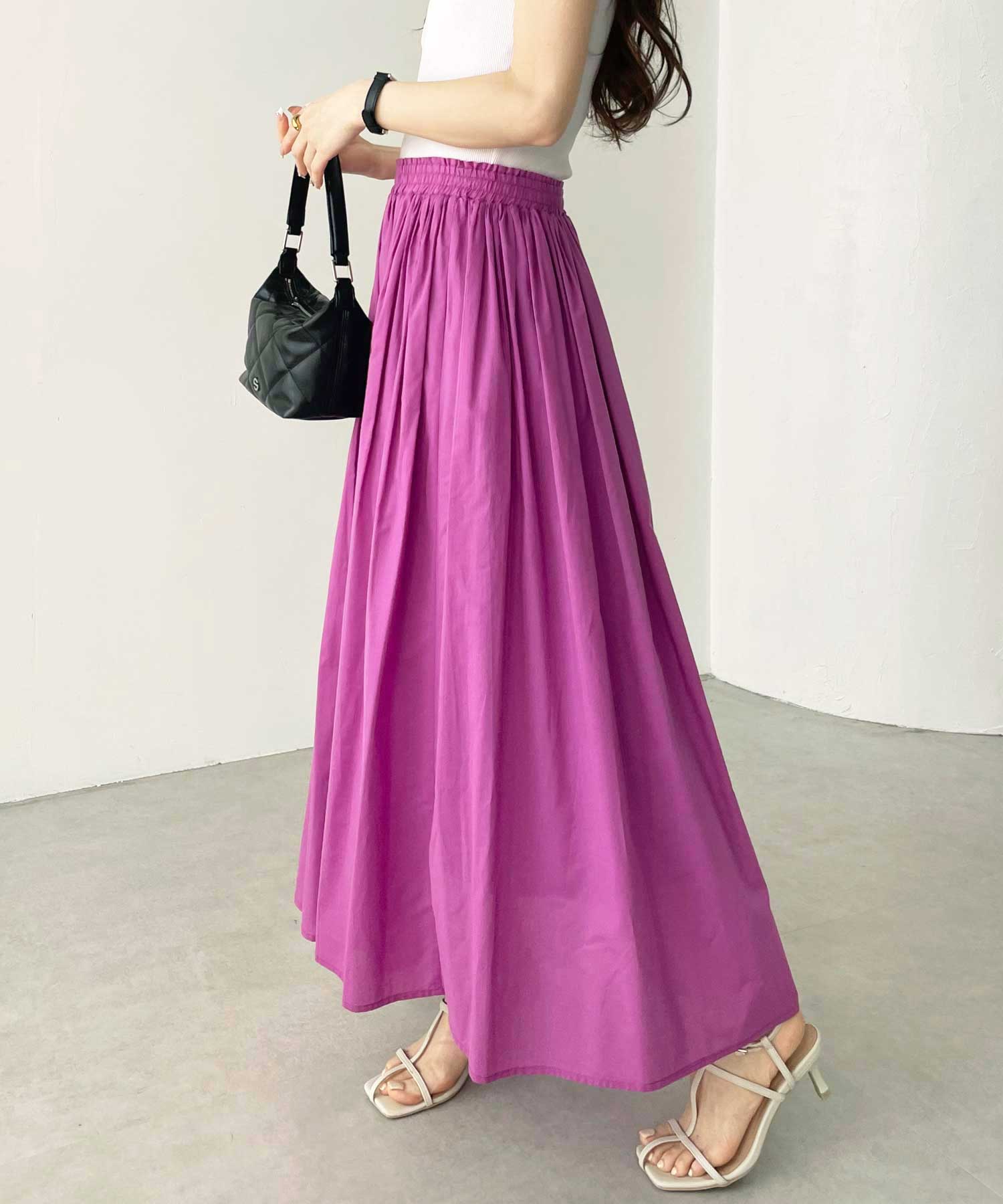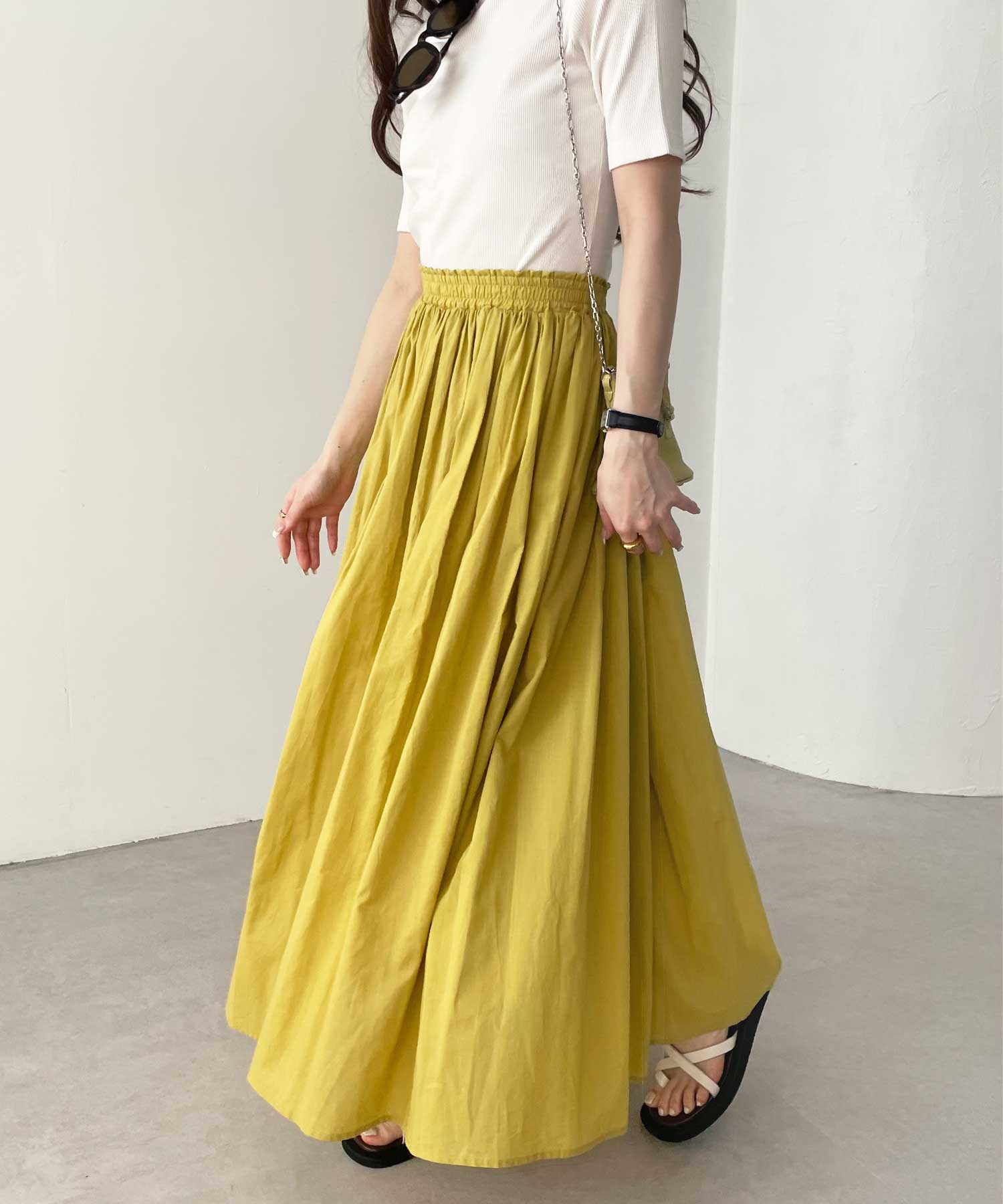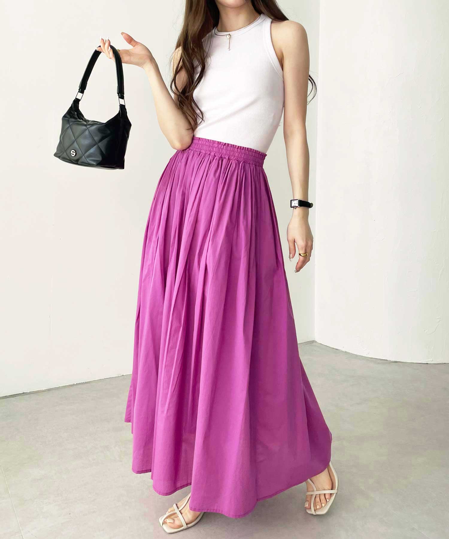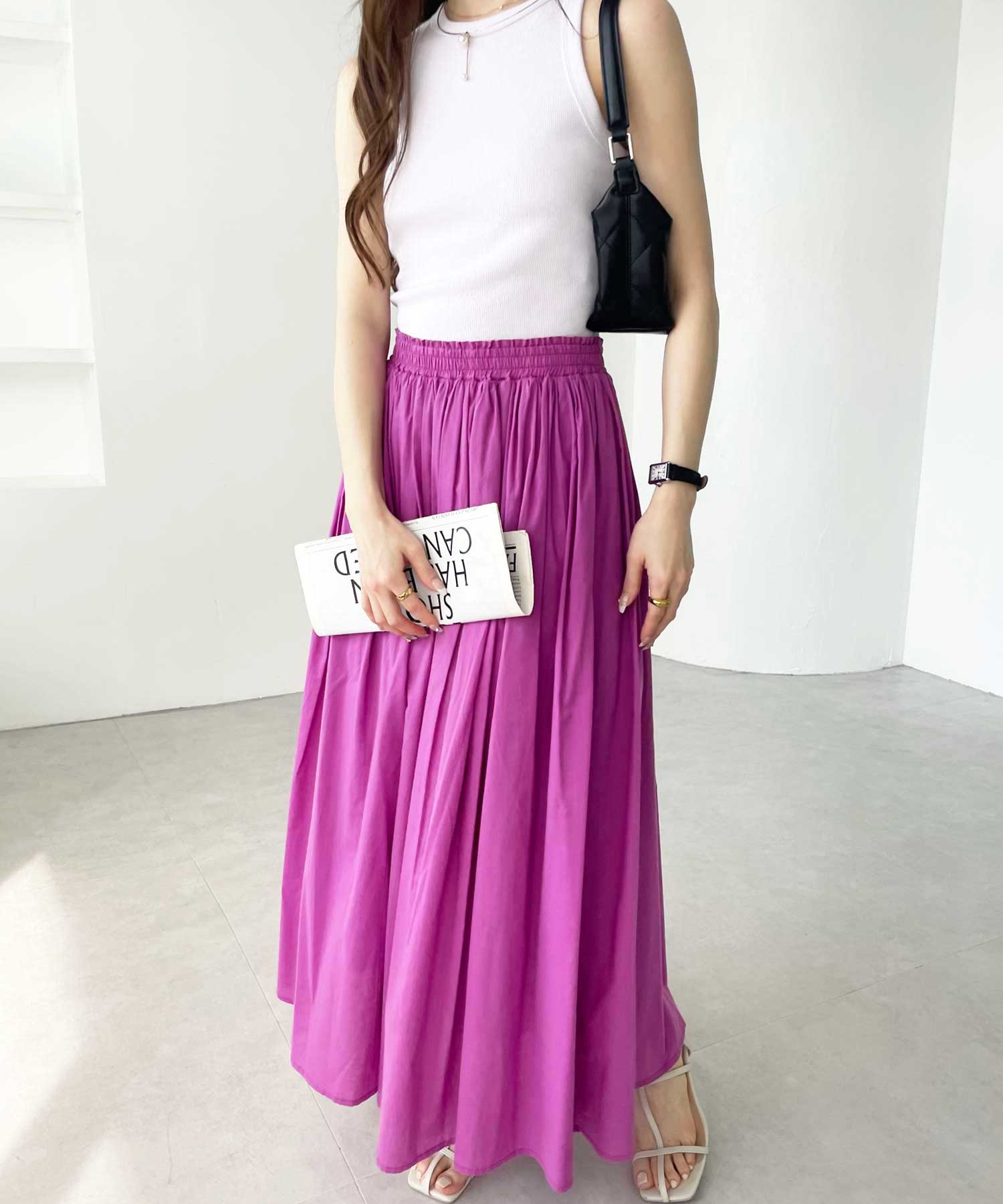 目を惹くカラーのマキシ丈フレアースカートだから、
