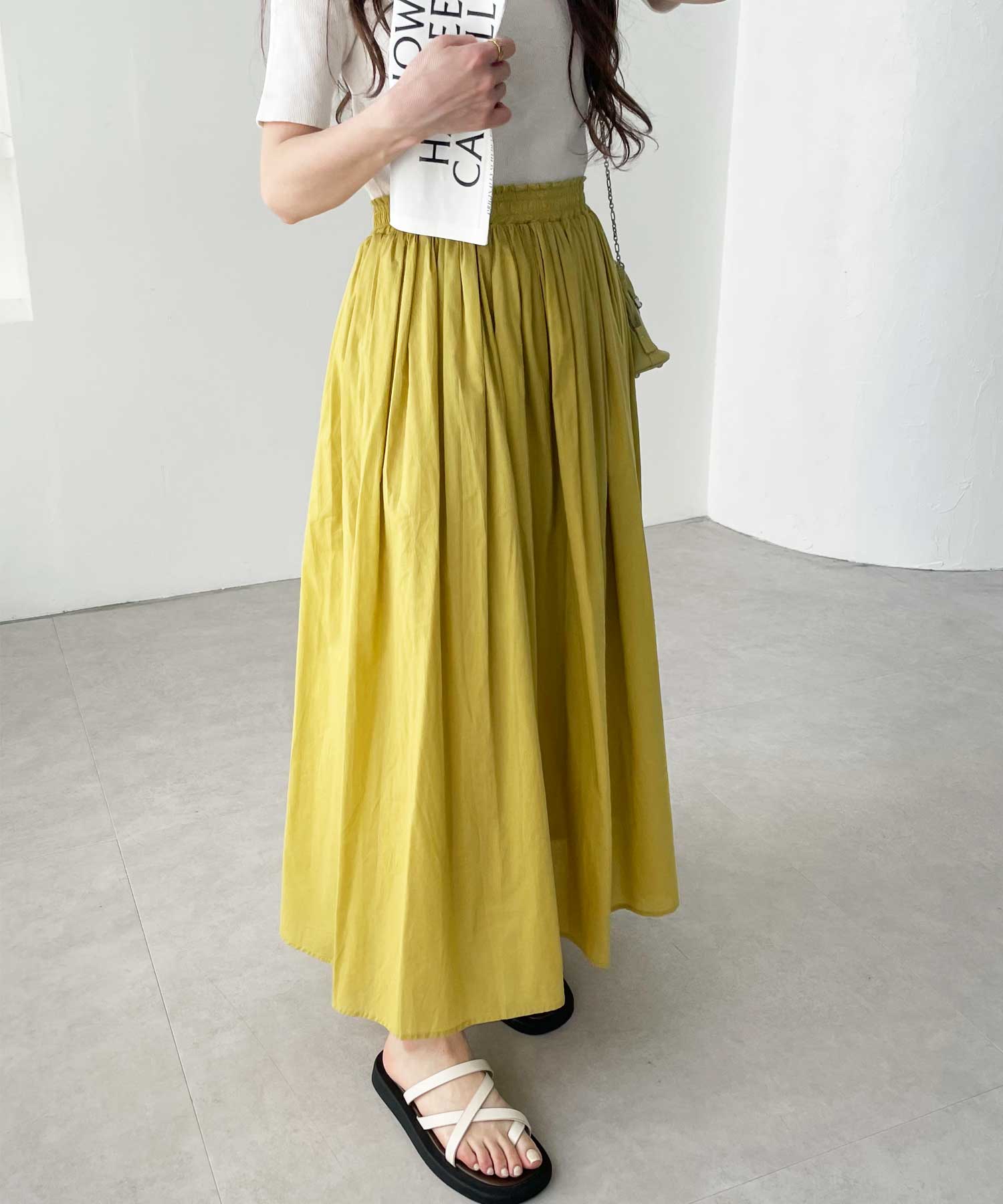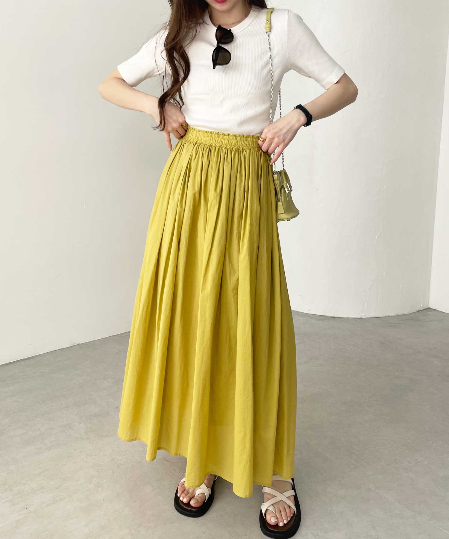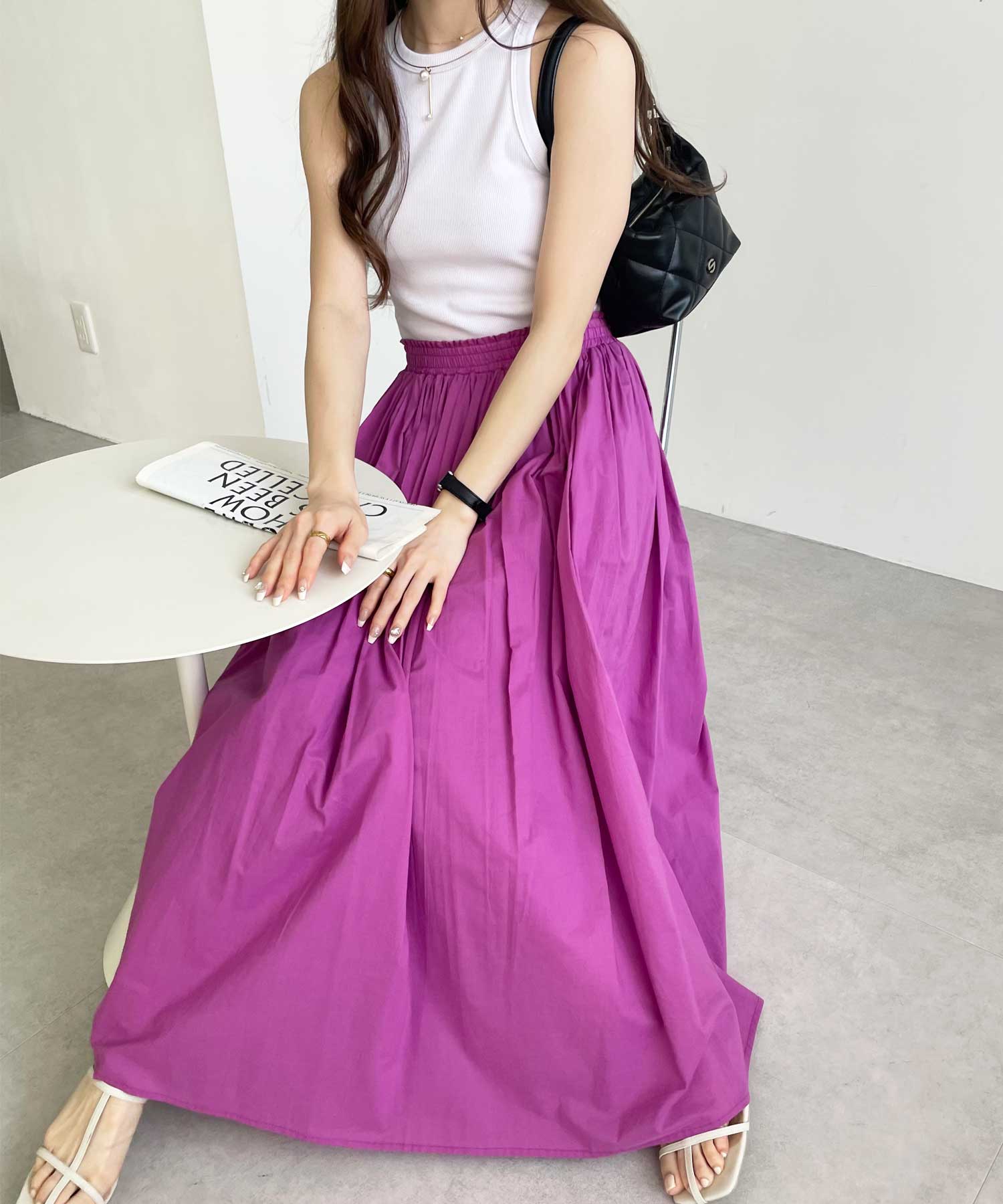 目を惹くカラーのマキシ丈フレアースカートだから、