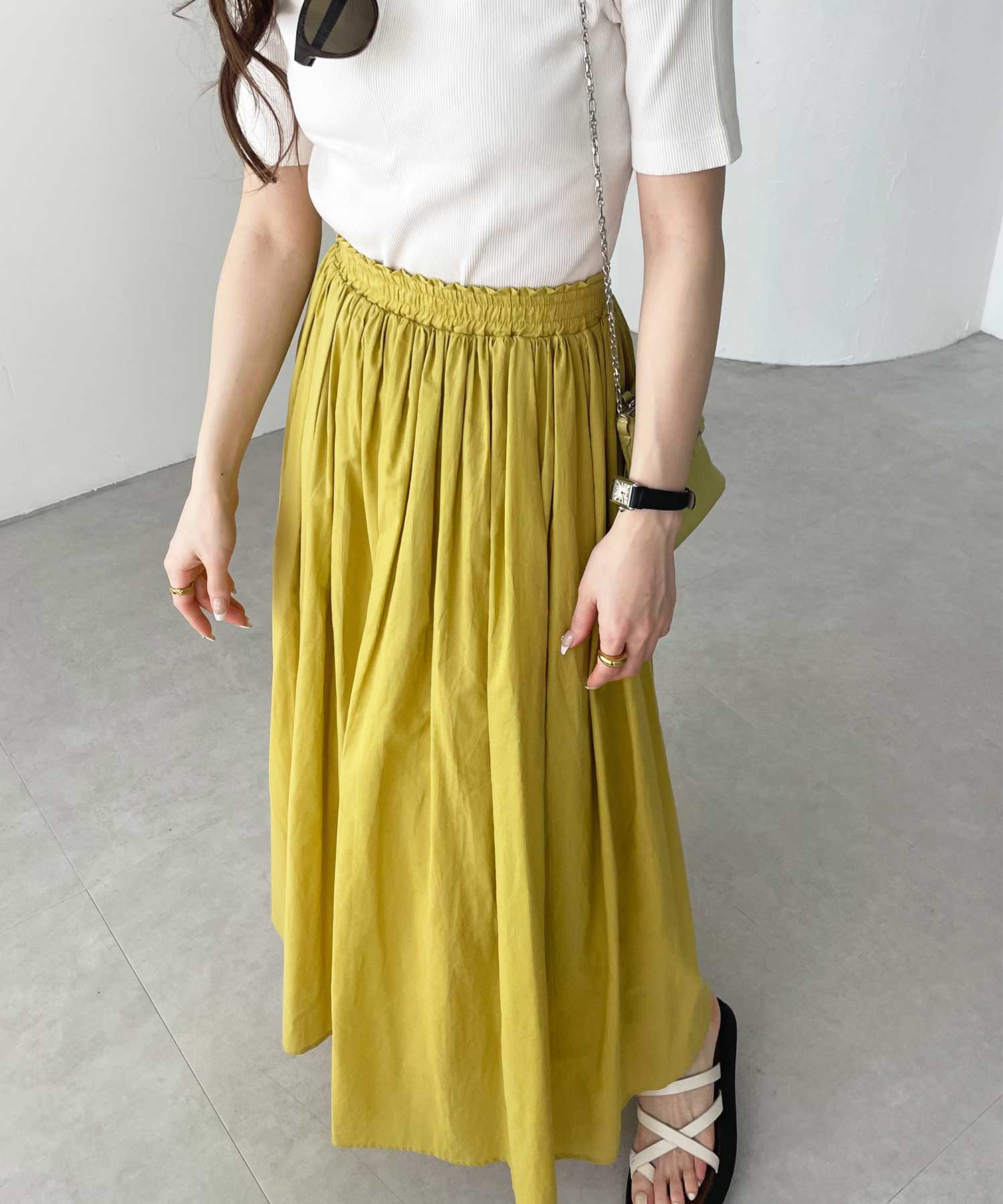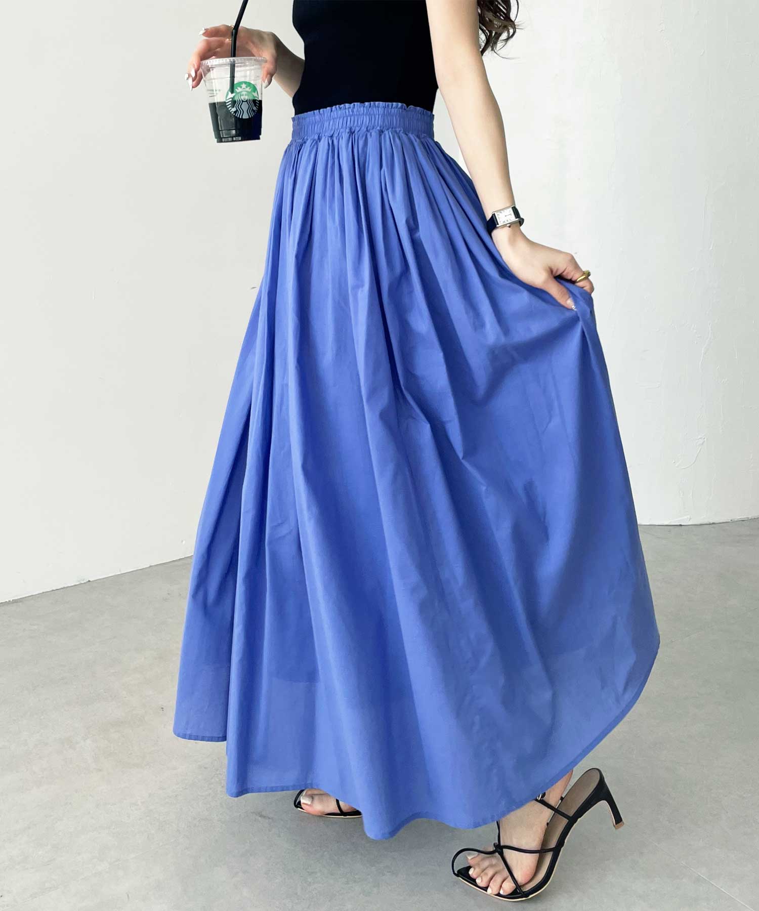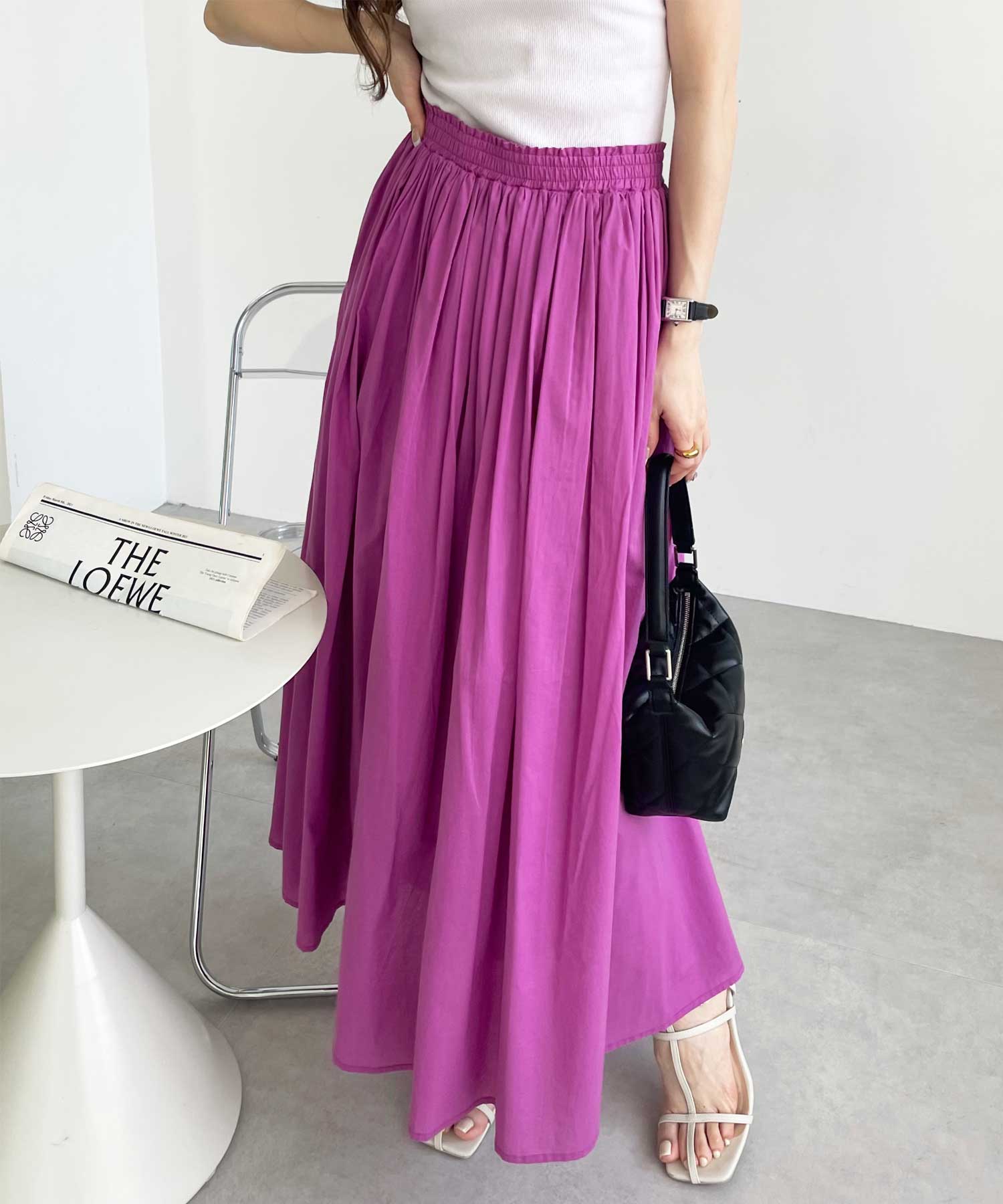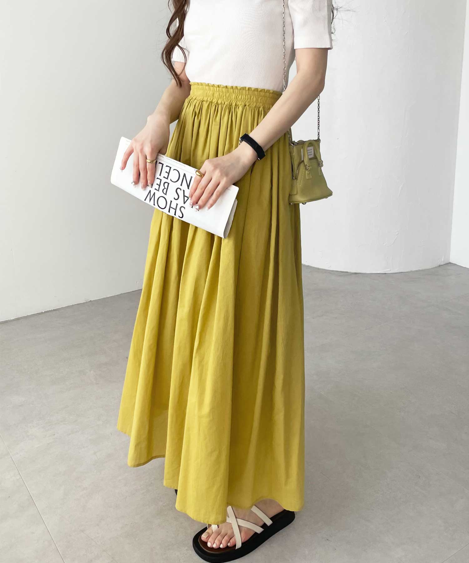 目を惹くカラーのマキシ丈フレアースカートだから、