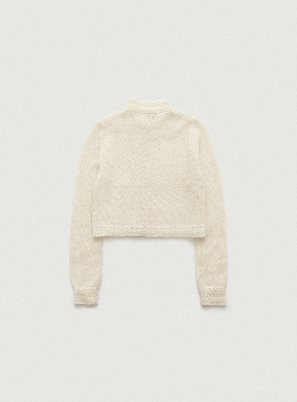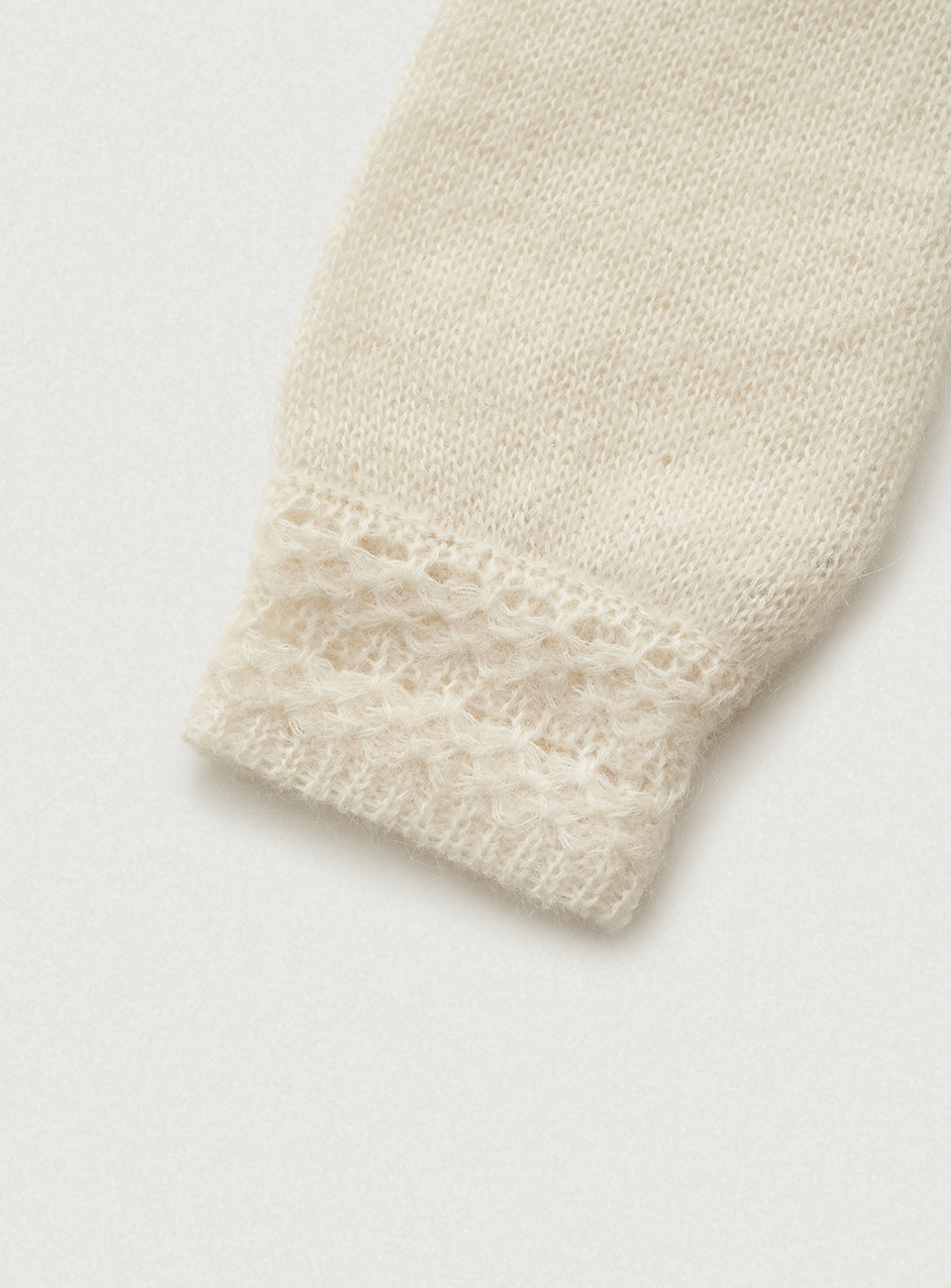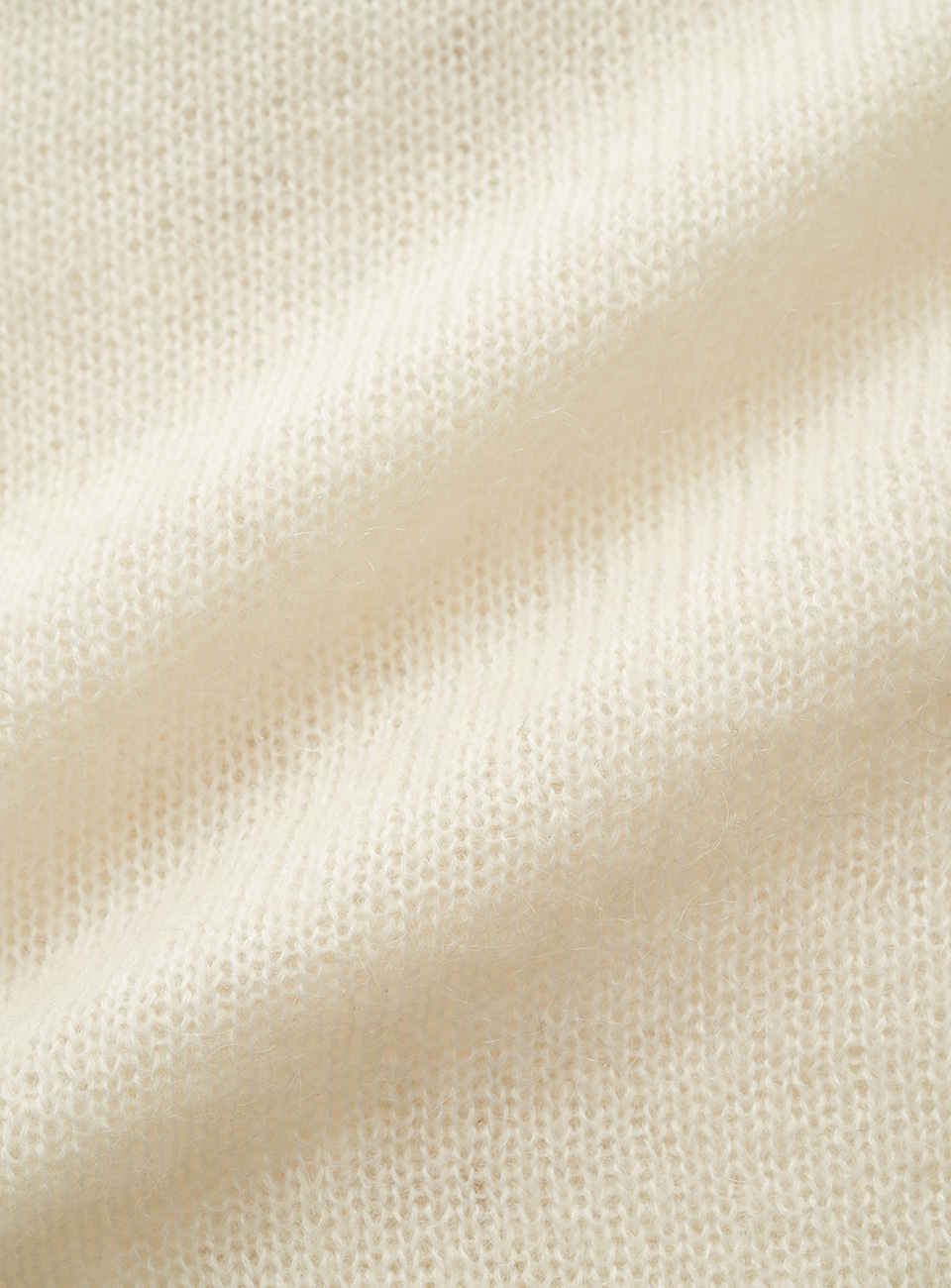アイボリーカラーの、柔らかなテクスチャーが特徴のモヘアウール混紡ニットファブリックを使用。